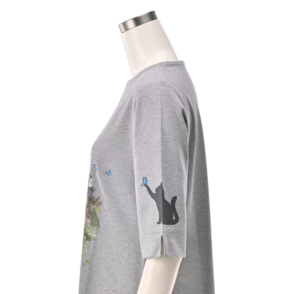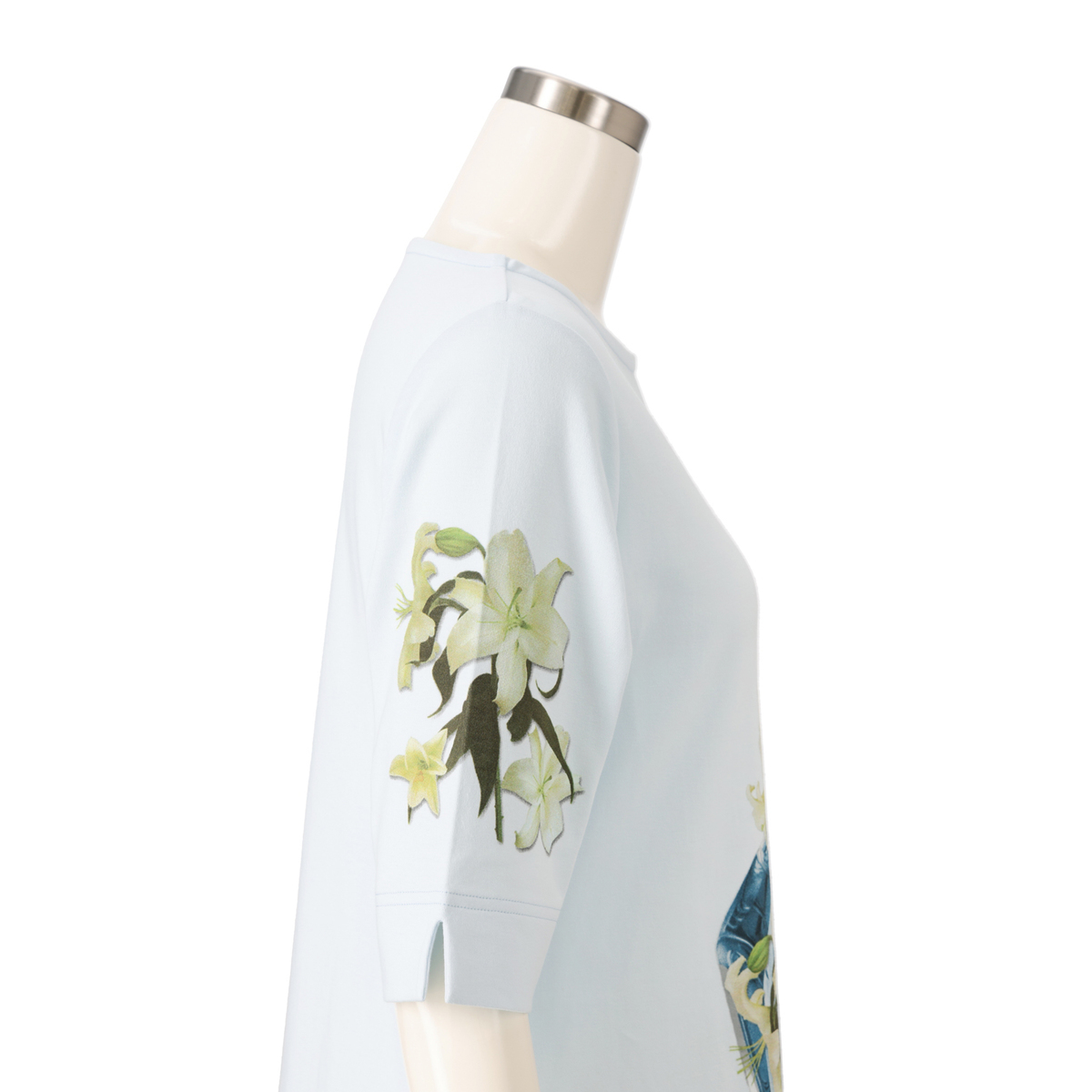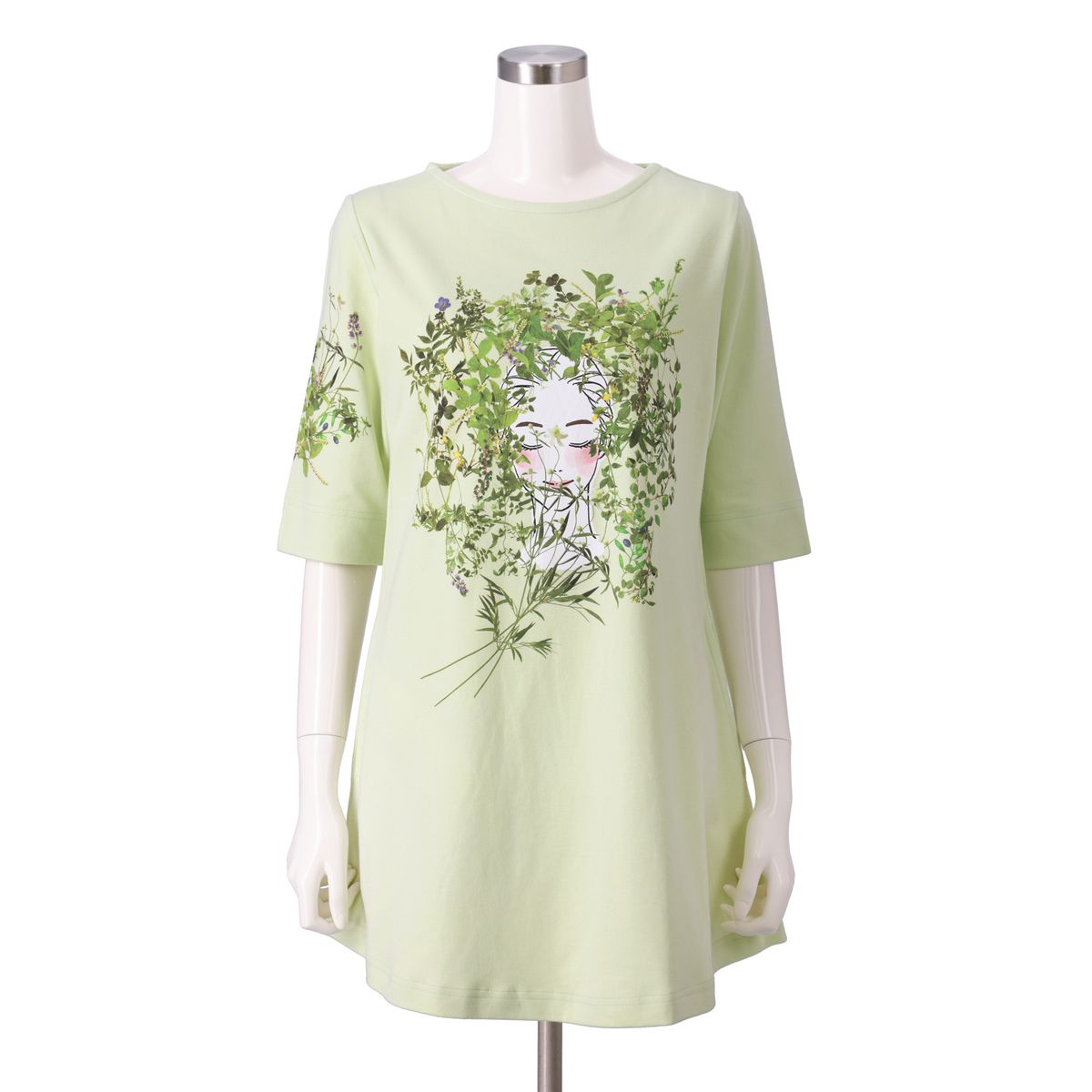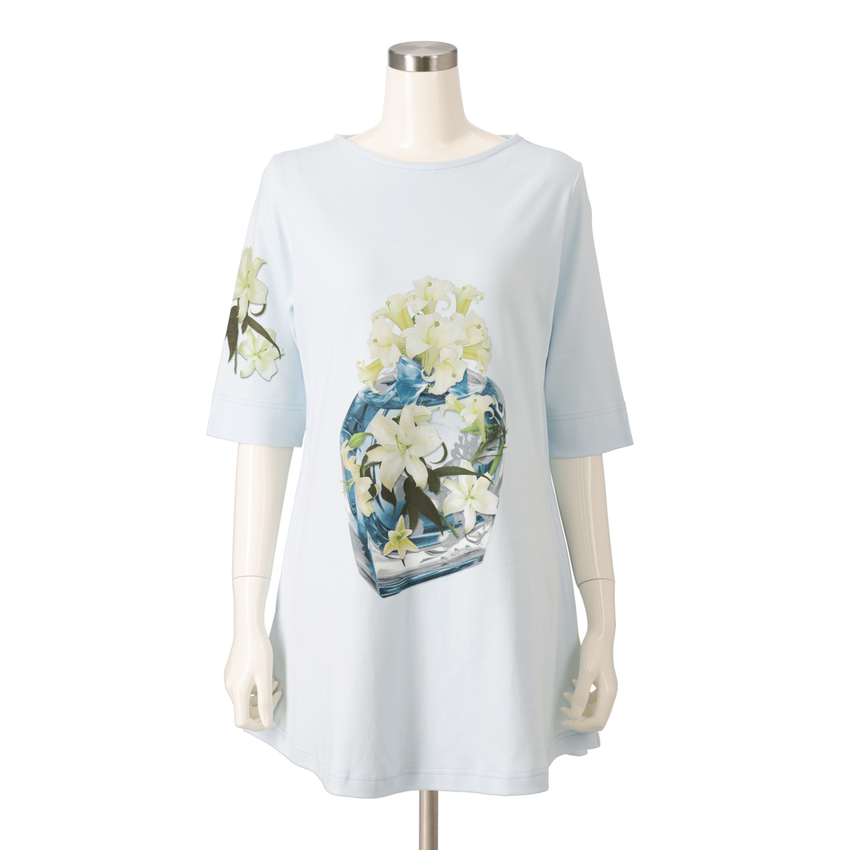 プリントは、きれいなグラデーションを映し出した繊細で手の込んだつくり。綿100%で肌触りが良く、ストレッチ性があり着やすいのも魅力です。シルケット加工・バイオ加工を施すことで毛羽立ちが抑えられ、生地色やプリントがきれいに。風合いがよく、しなやかで軽い着心地です