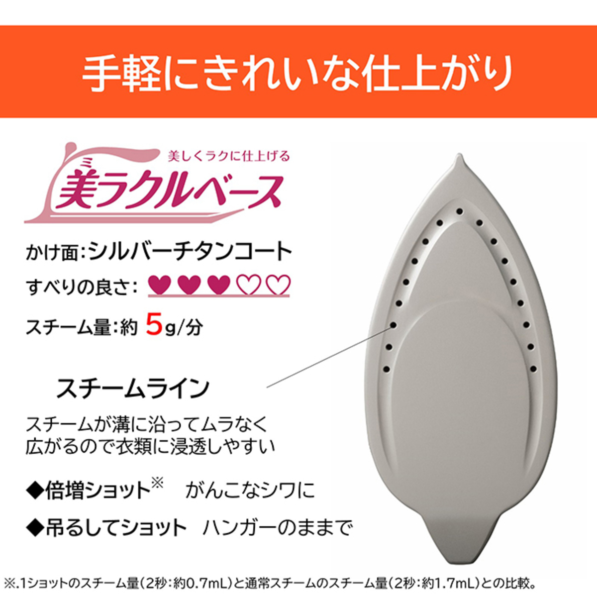倍増ショットは、通常モードよりもパワフルなスチームで、ガンコなシワもきれいに仕上げます。また、衣類をハンガーにかけたままアイロンがけもできて便利です