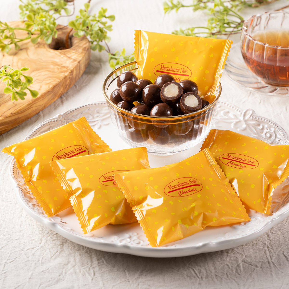 サクッ、カリッと心地よい歯ごたえの大粒マカデミアンナッツを、特製ミルクチョコでコーティングしました