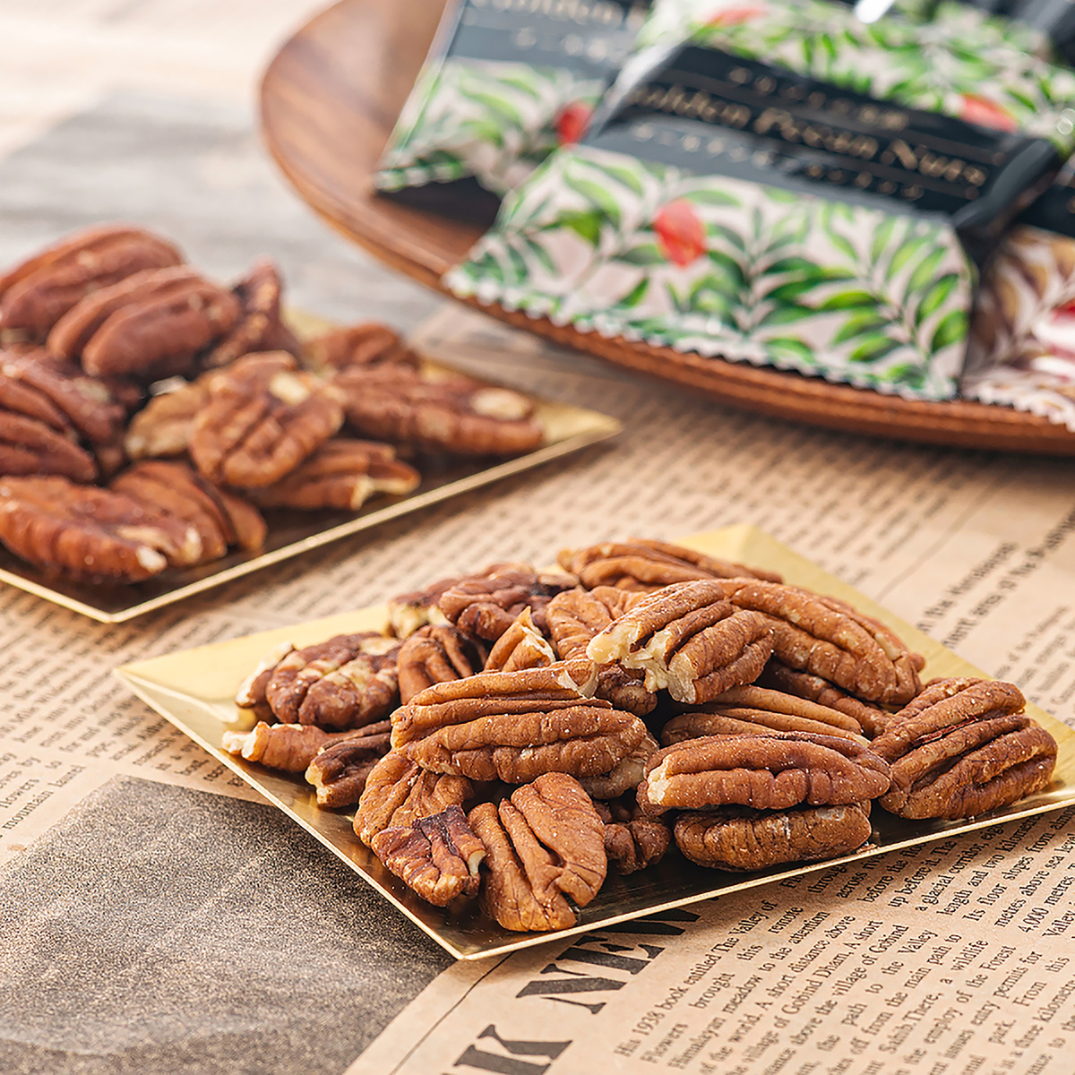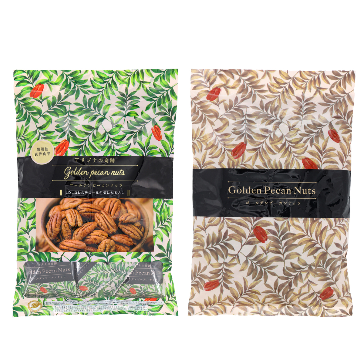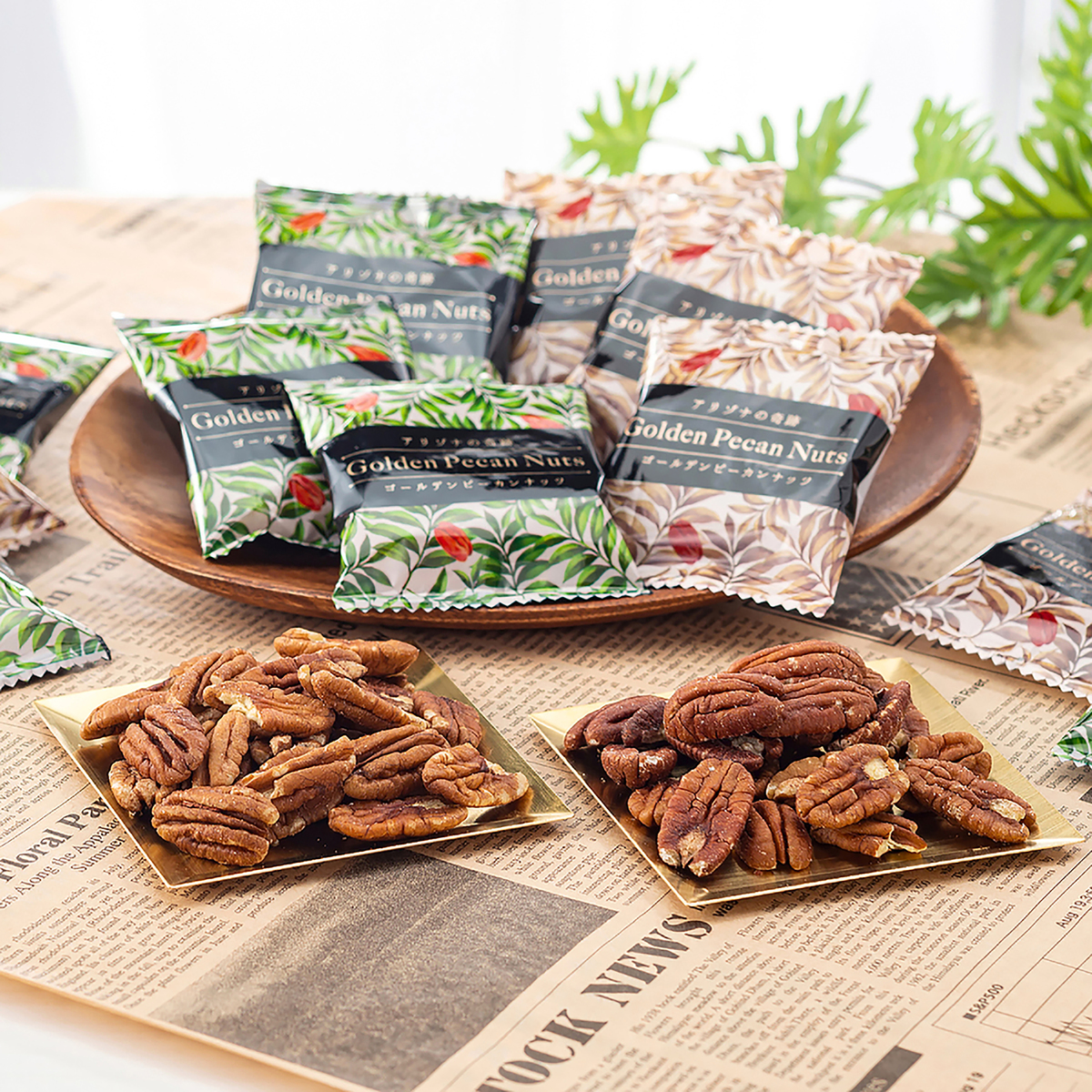 生タイプとローストタイプのピーカンナッツをセットでお届け。どちらも便利な個包装で、開けてそのままお召し上がりいただけます