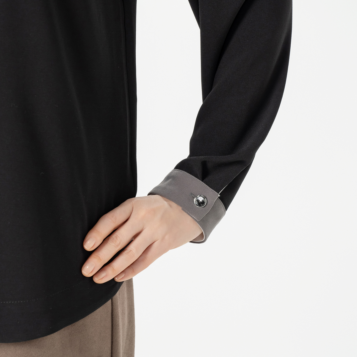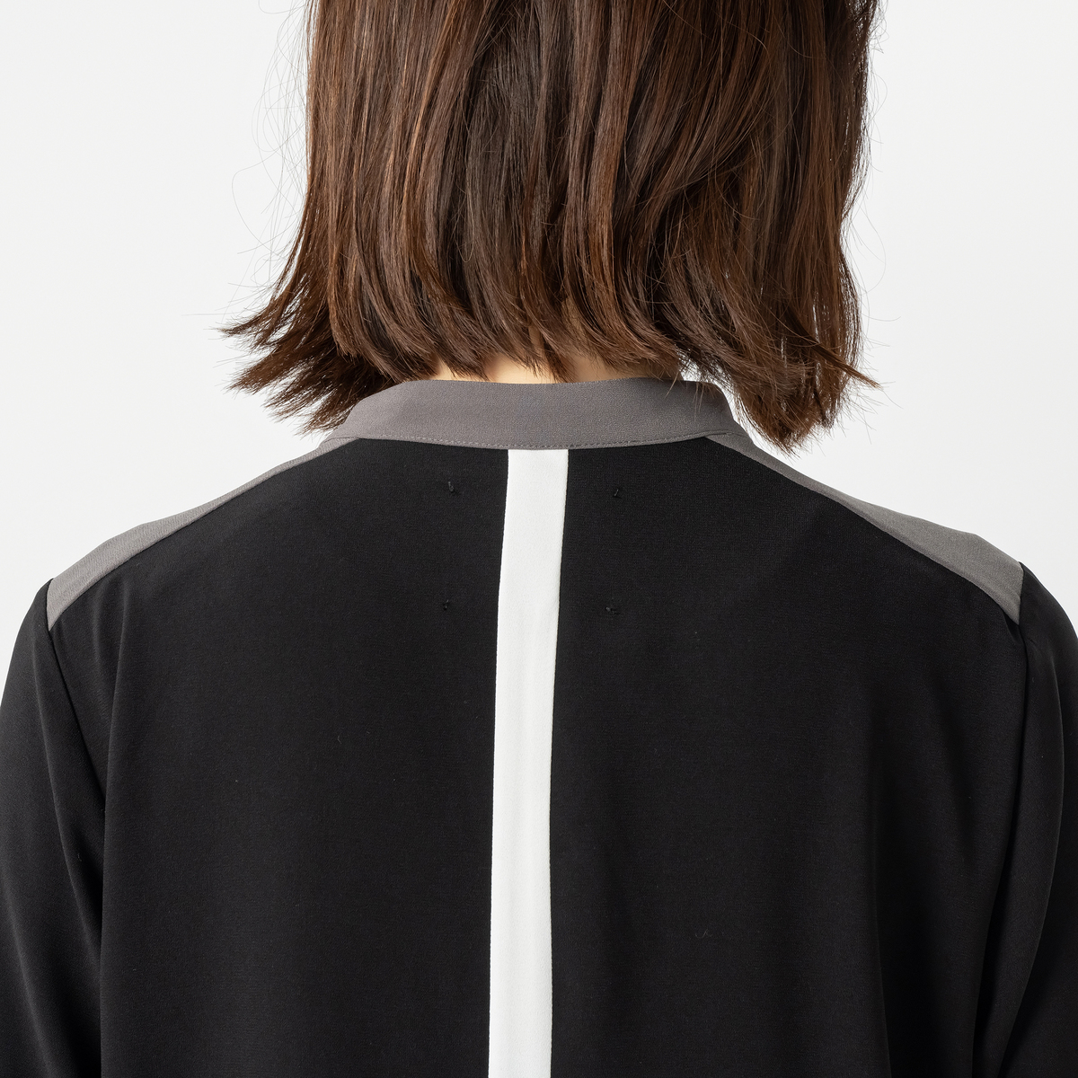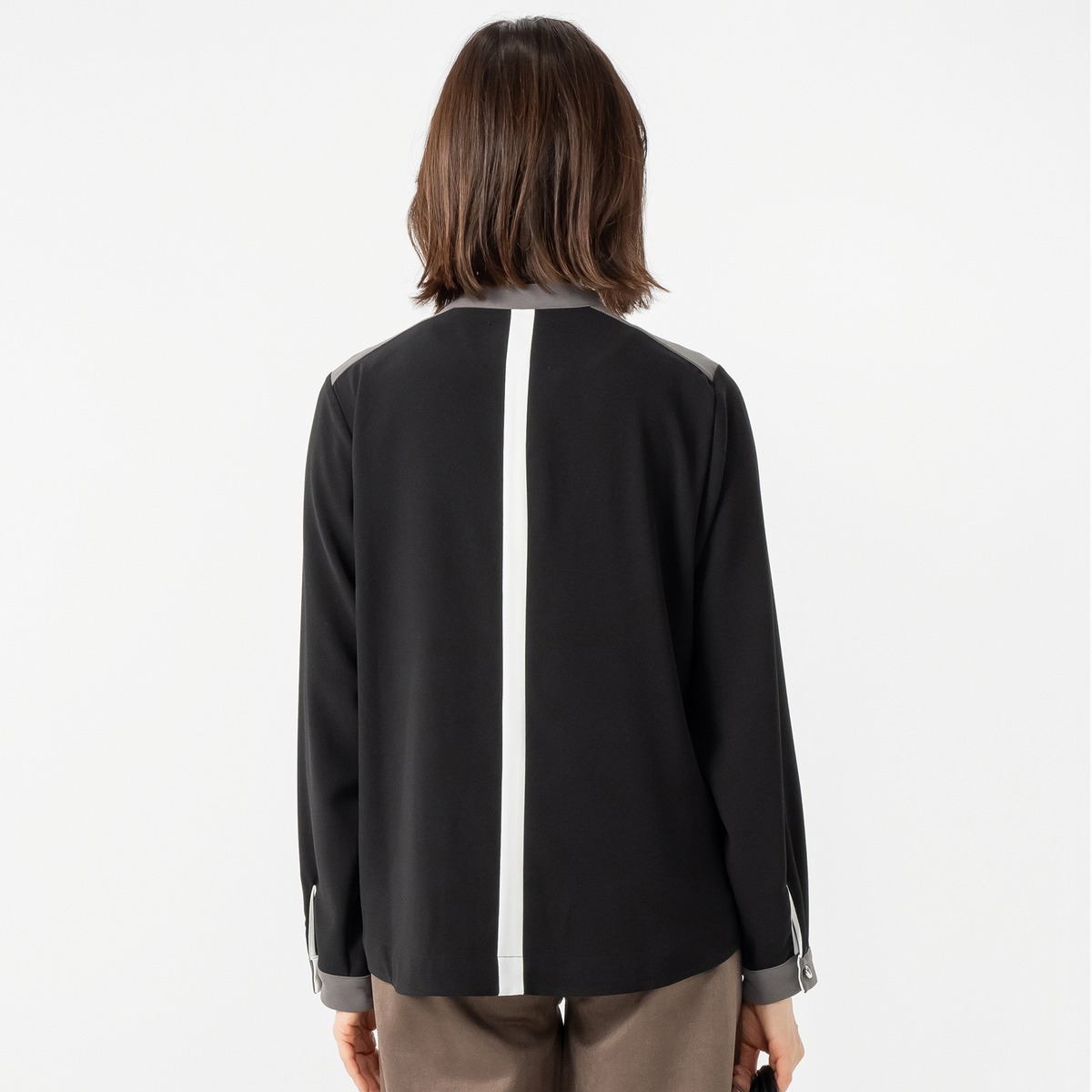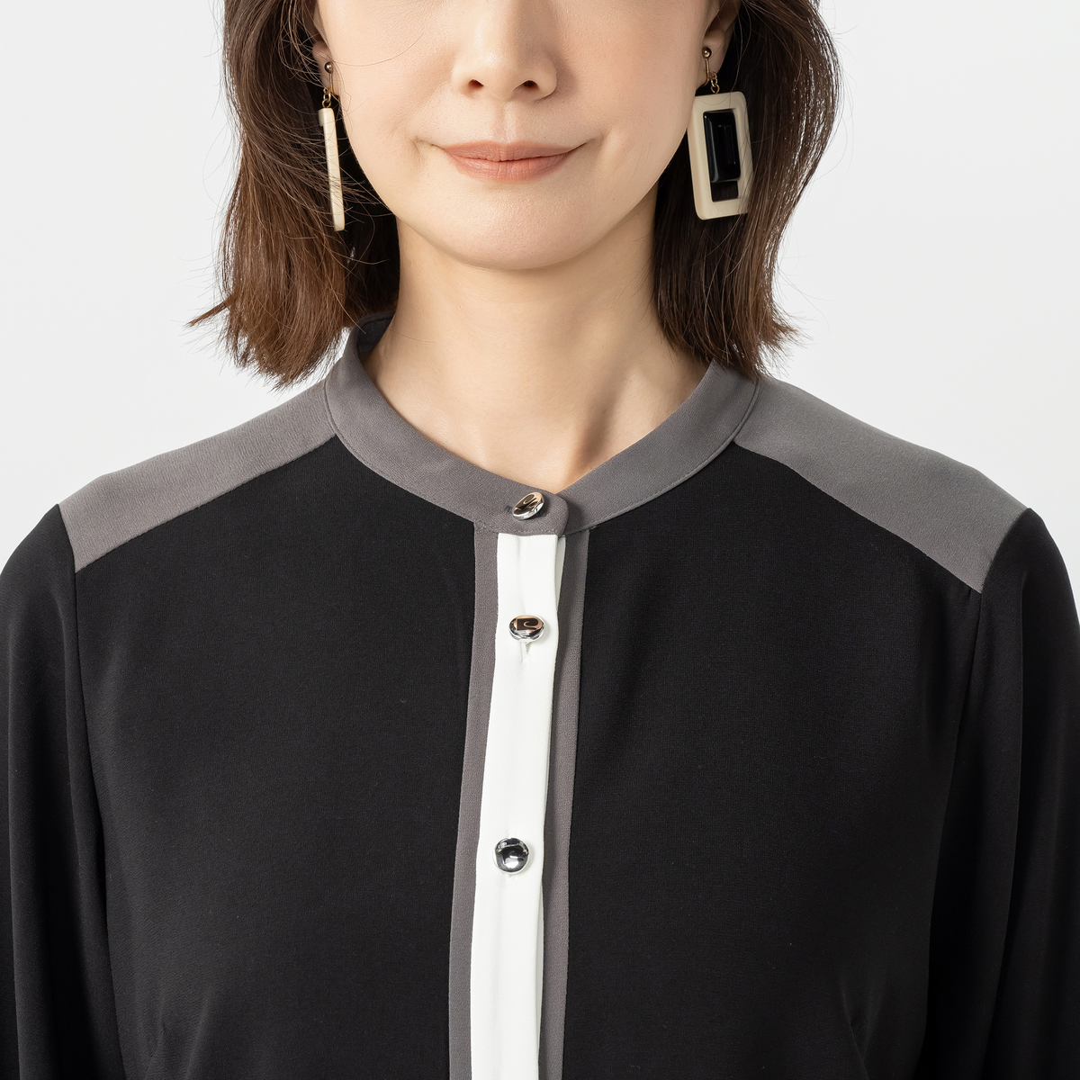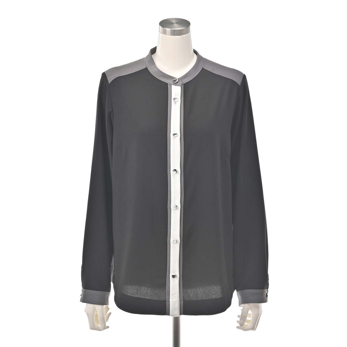 バンドカラーと前立て、袖口カフスに配色を効かせておしゃれに仕上げたブラウス。すっきりとしたIラインシルエットで、裾は浅めにラウンドさせています