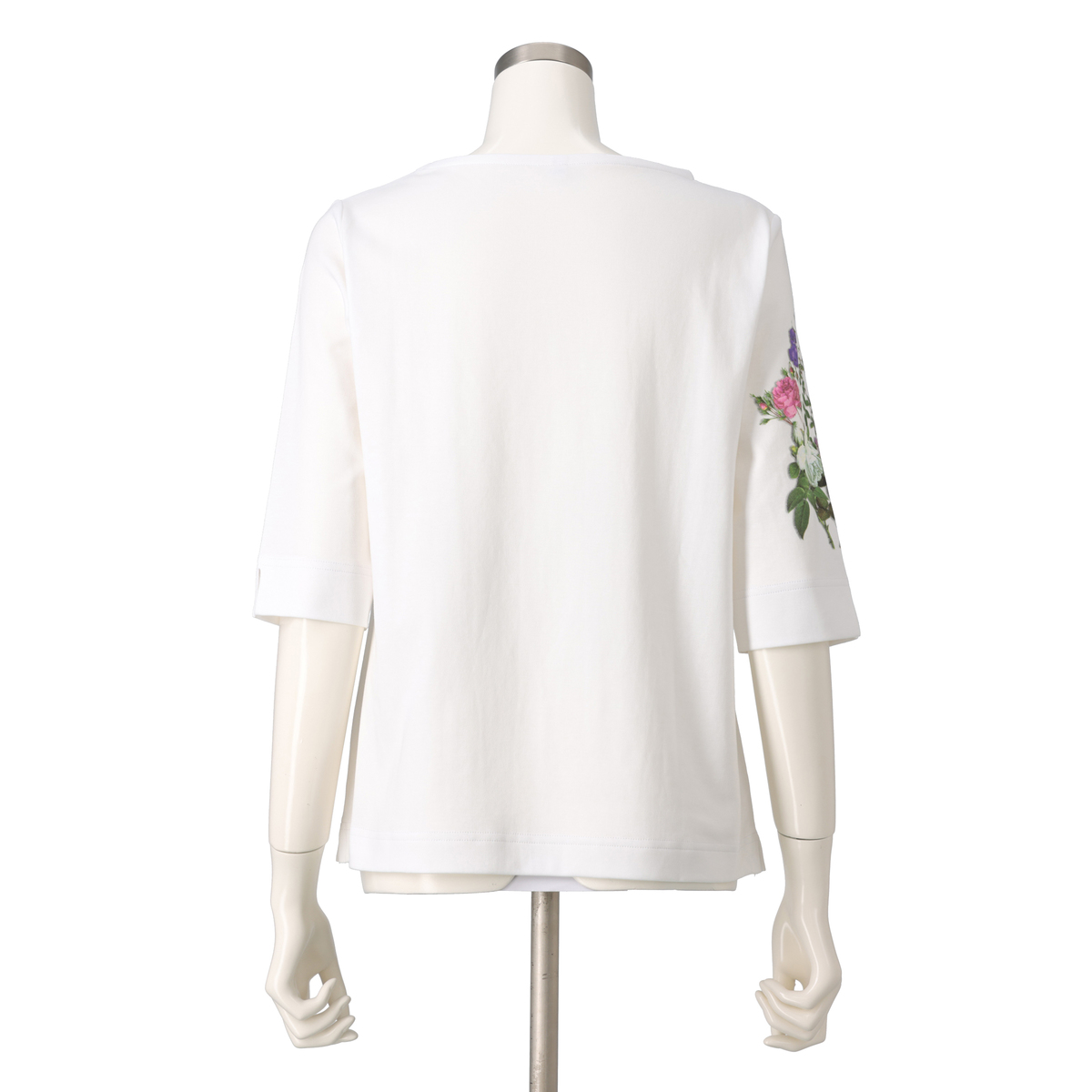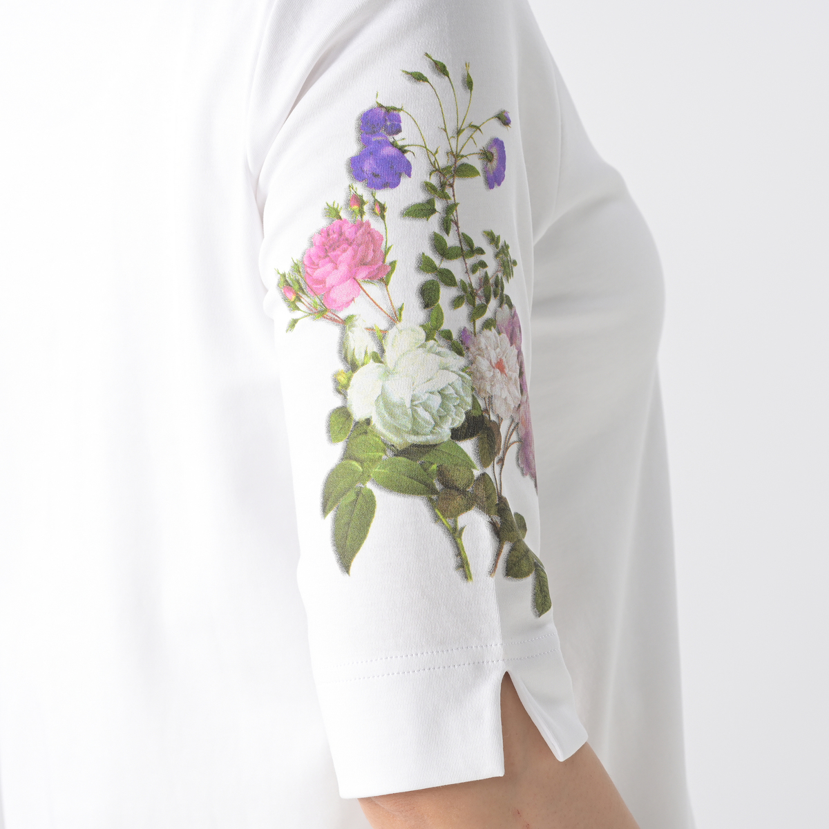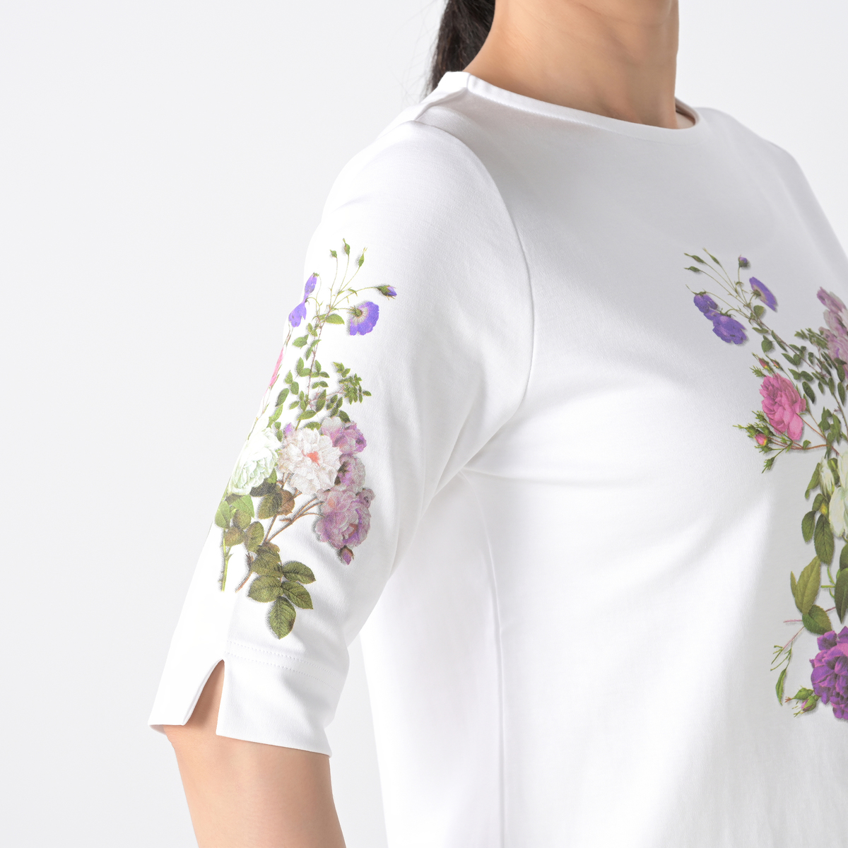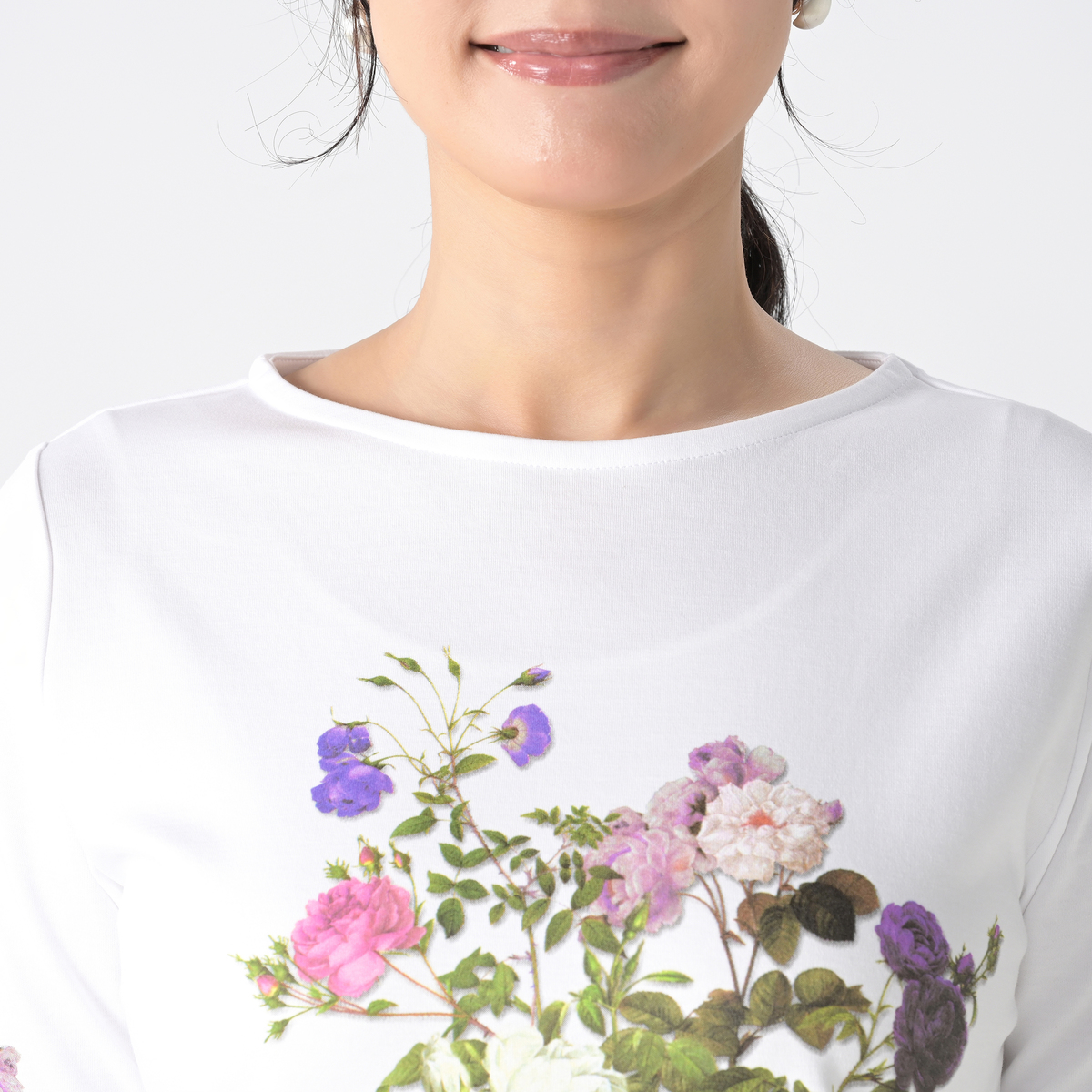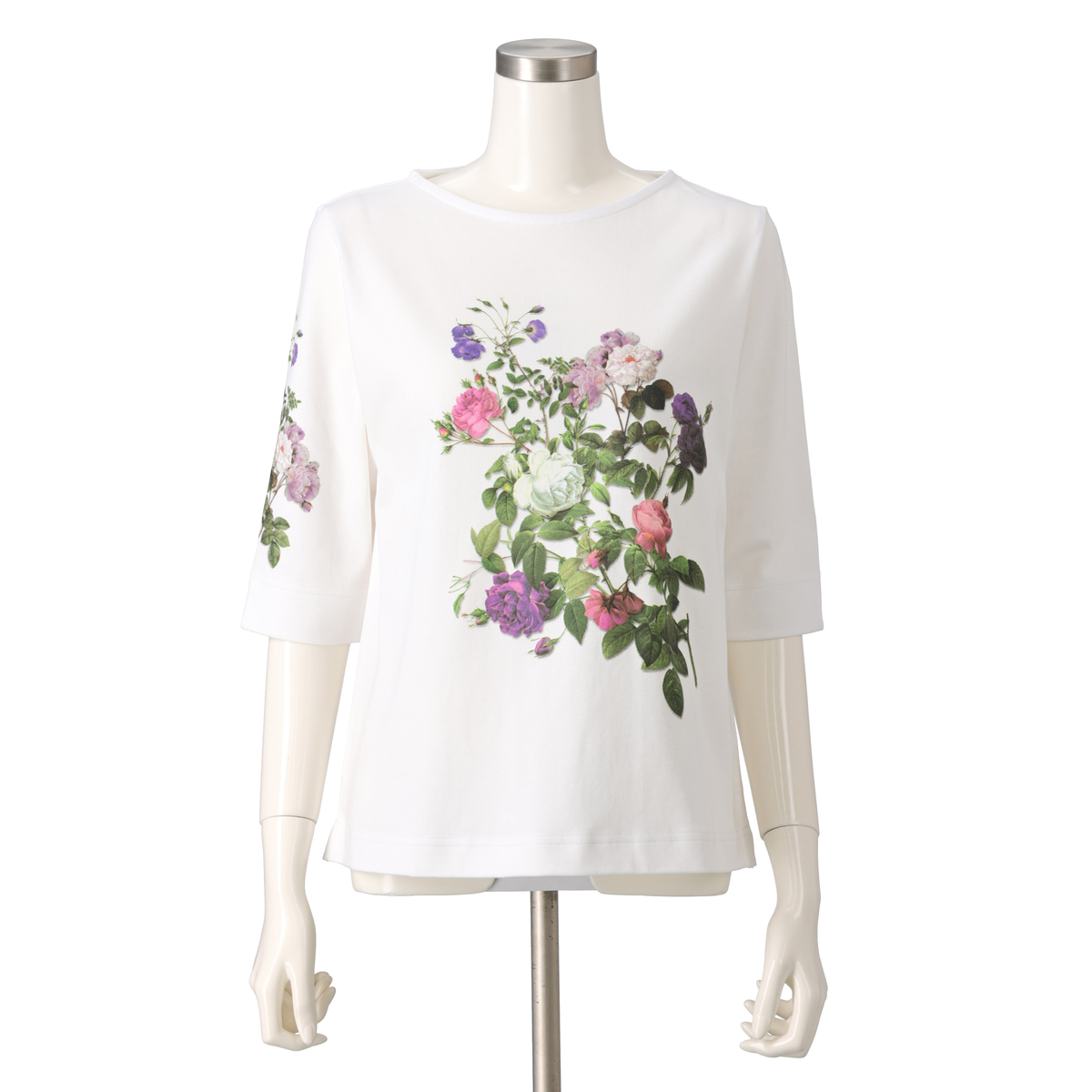 美しいプリントが目を引くプルオーバー。緻密に計算されたネックラインは胸元を美しく見せ、袖はアームホールをたっぷりとり、二の腕をほっそりと見せてくれます。スカートやワイドパンツなどボリュームのあるボトムスとも好相性です