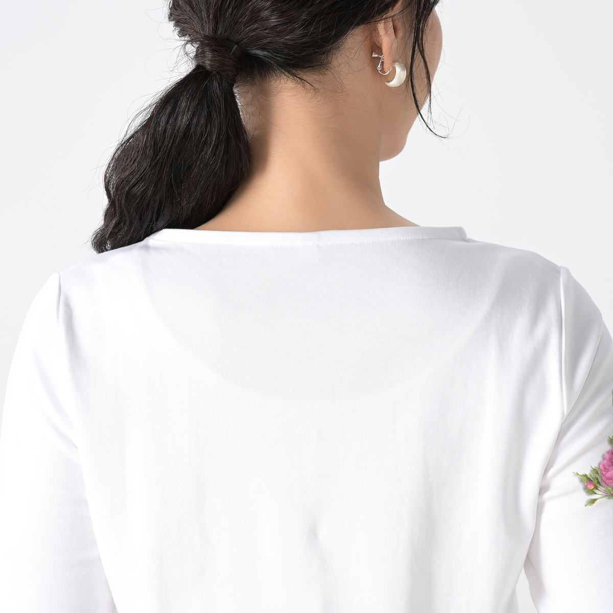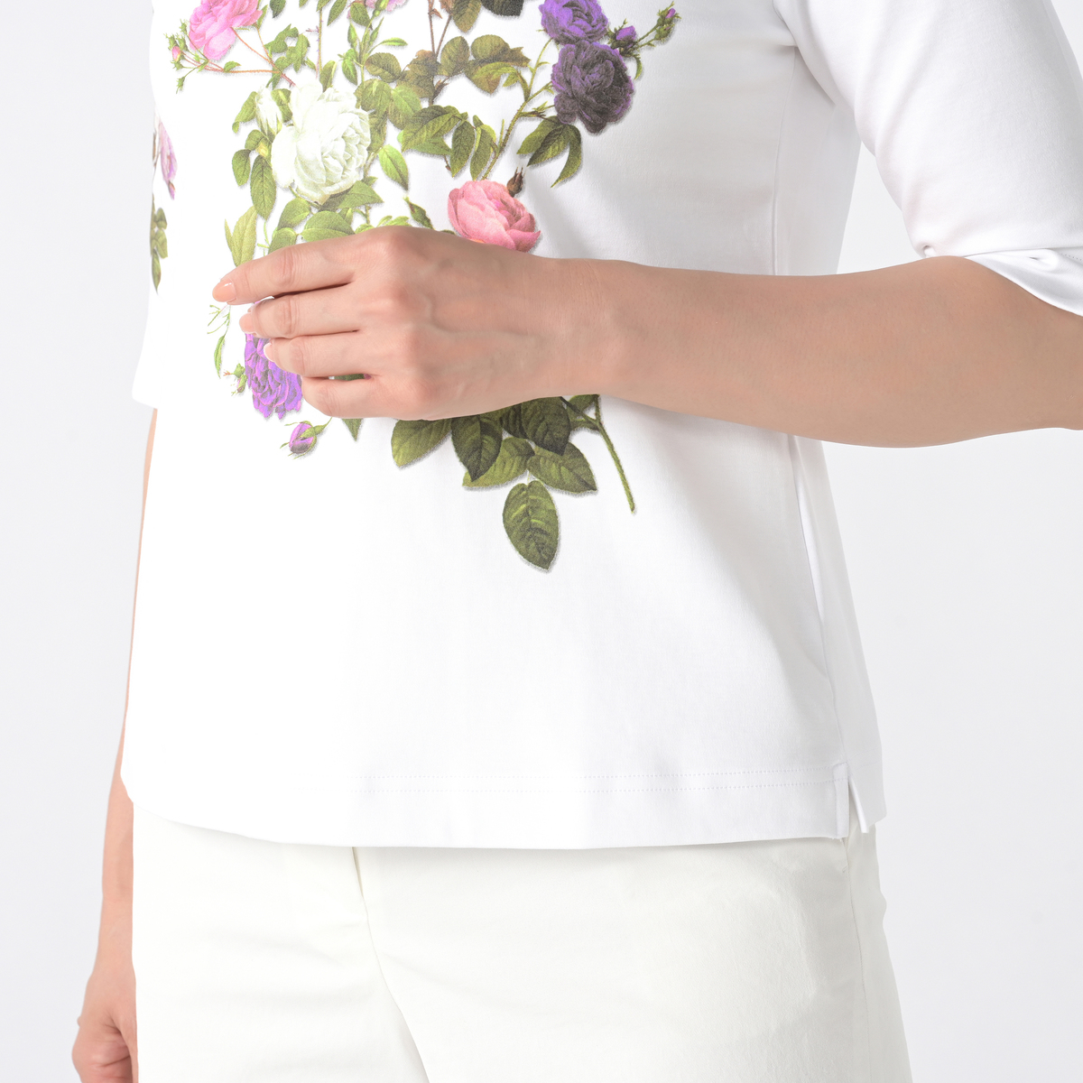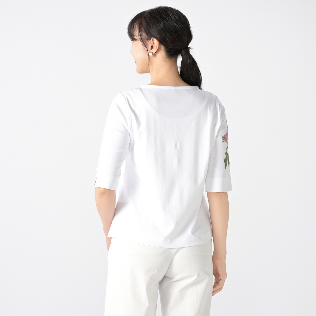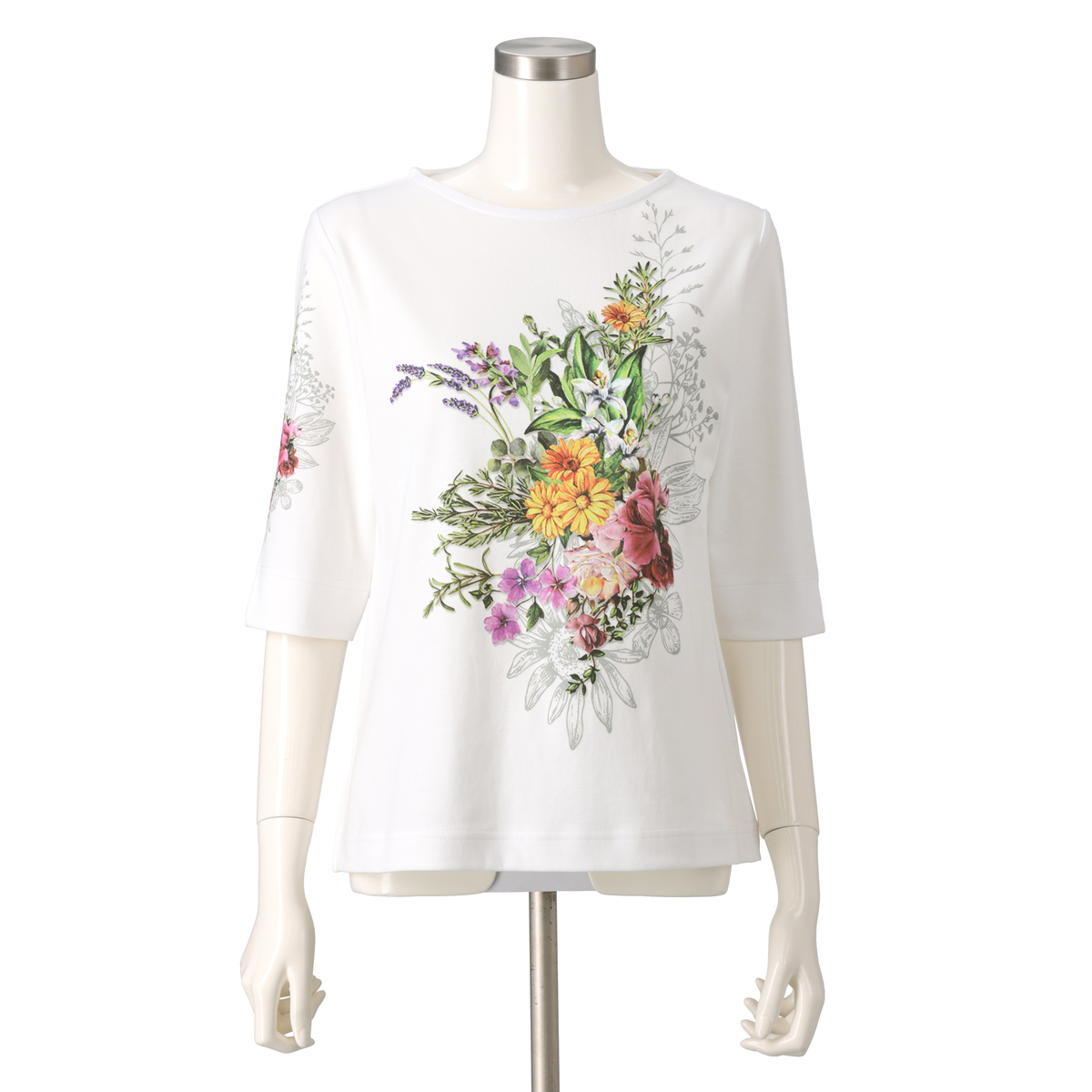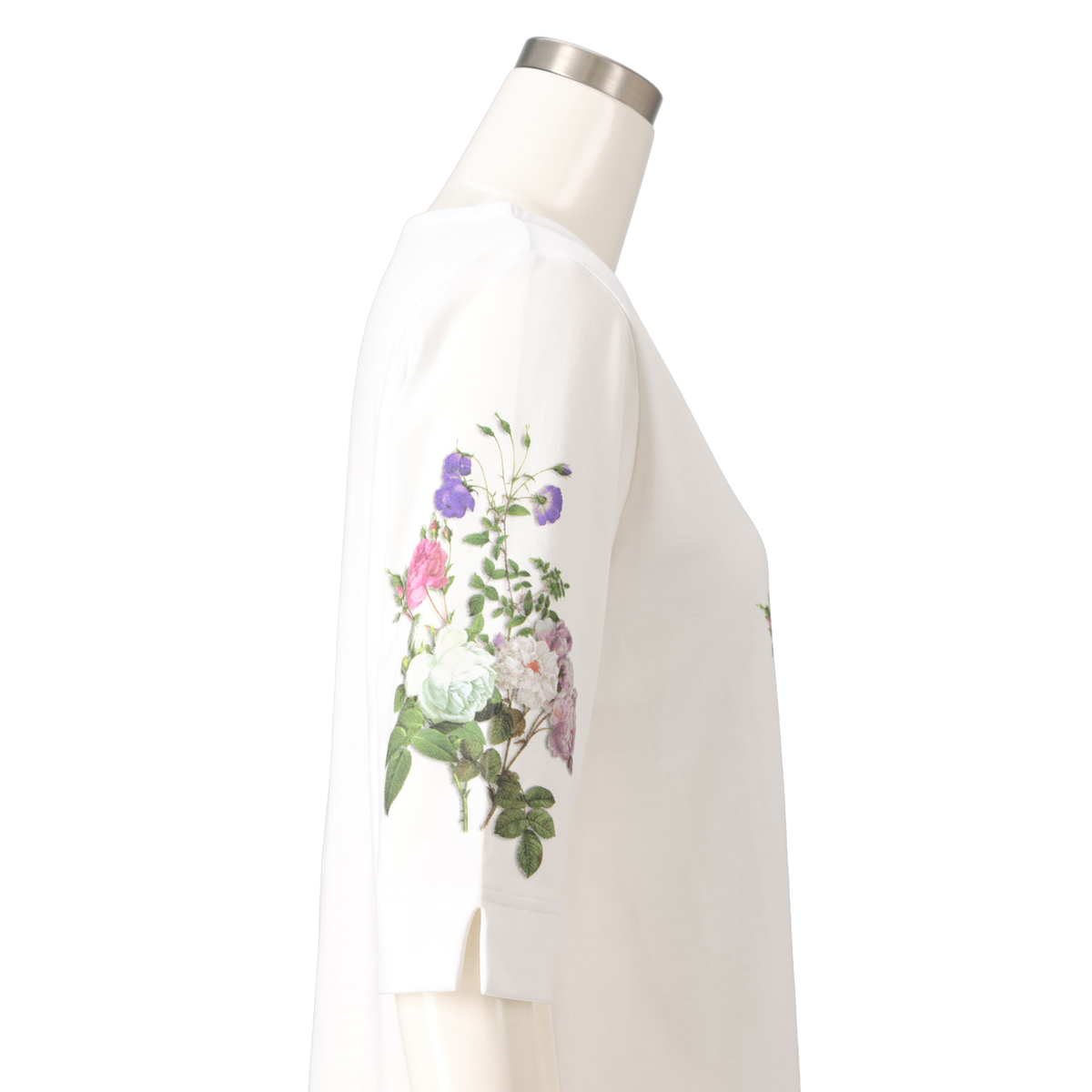 美しいプリントが目を引くプルオーバー。緻密に計算されたネックラインは胸元を美しく見せ、袖はアームホールをたっぷりとり、二の腕をほっそりと見せてくれます。スカートやワイドパンツなどボリュームのあるボトムスとも好相性です