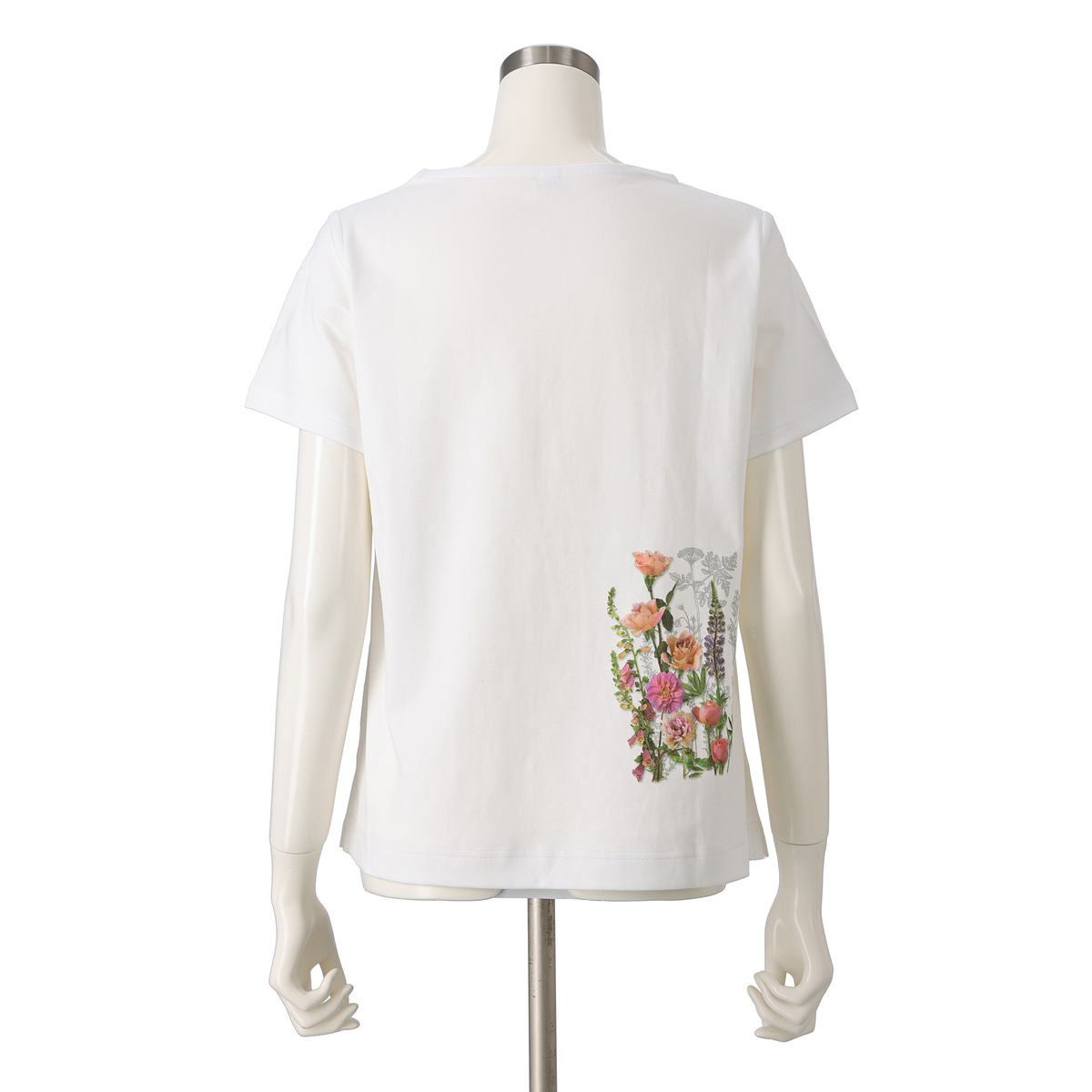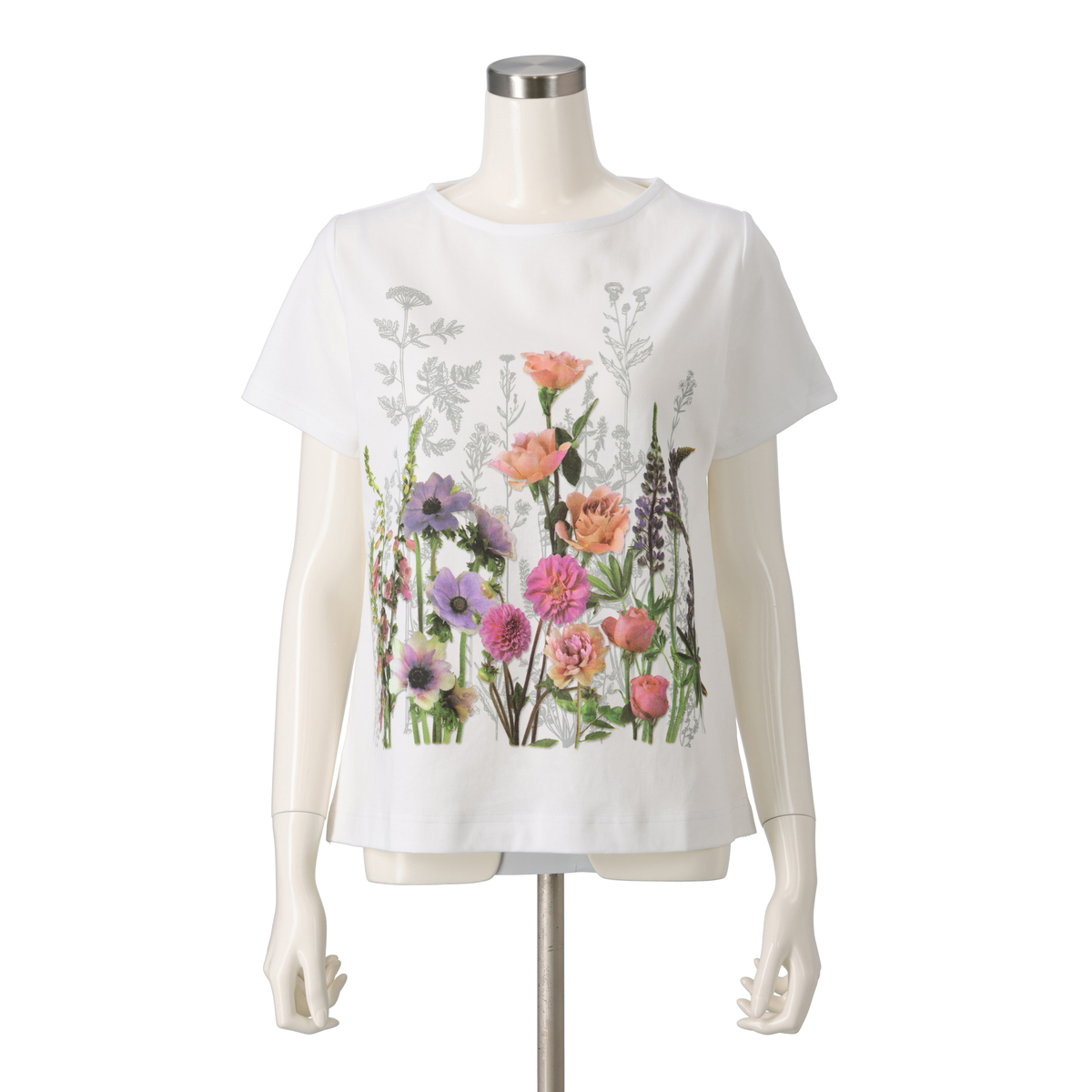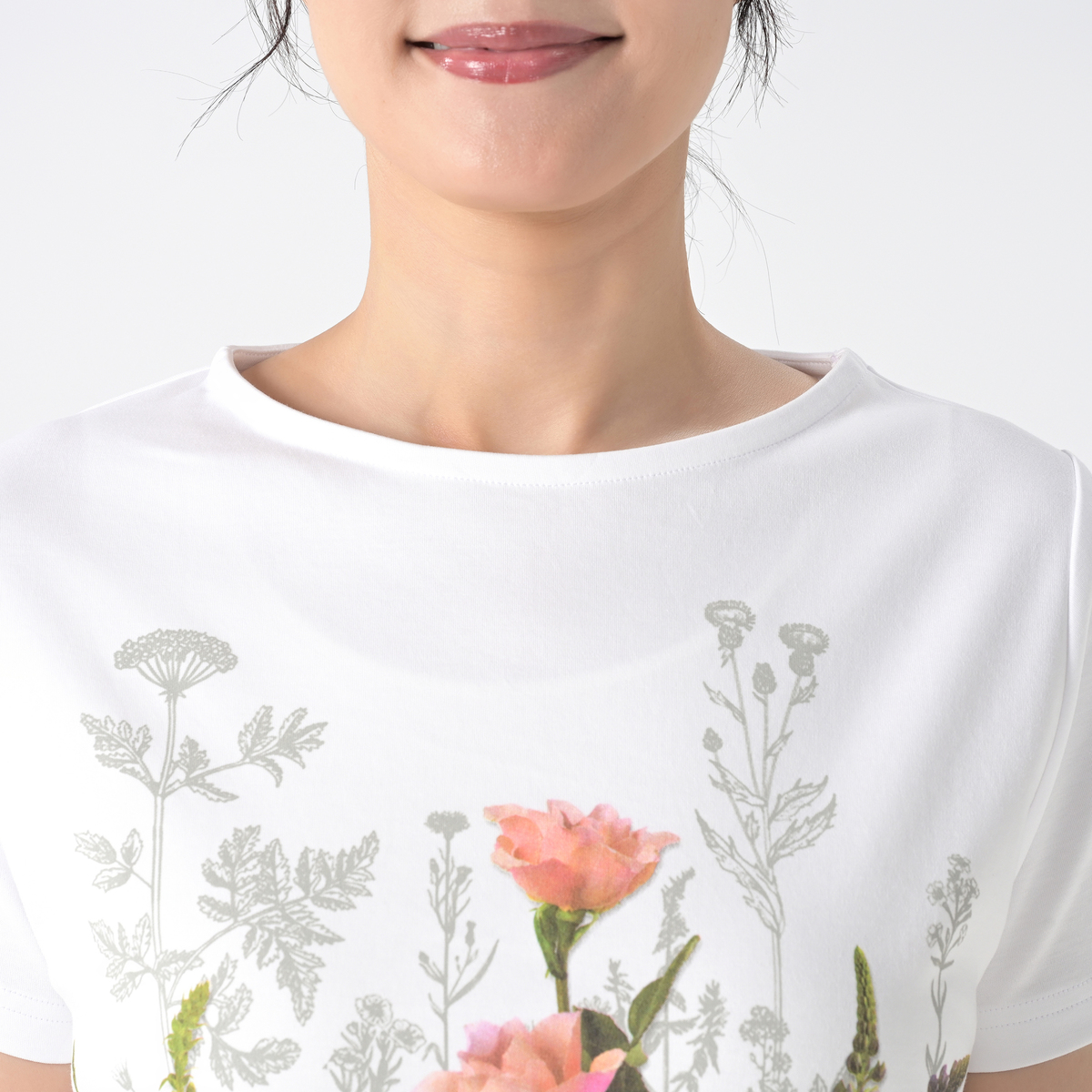 美しいプリントが目を引くプルオーバー。緻密に計算されたネックラインは胸元を美しく見せ、袖はアームホールをたっぷりとり、二の腕をほっそりと見せてくれます。スカートやワイドパンツなどボリュームのあるボトムスとも好相性です