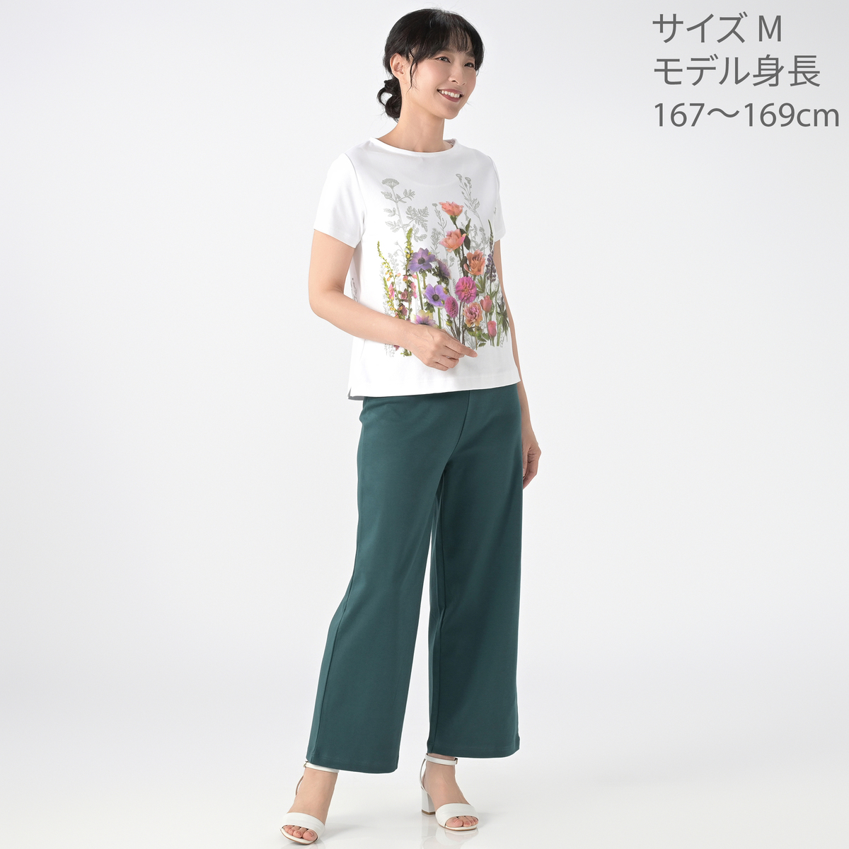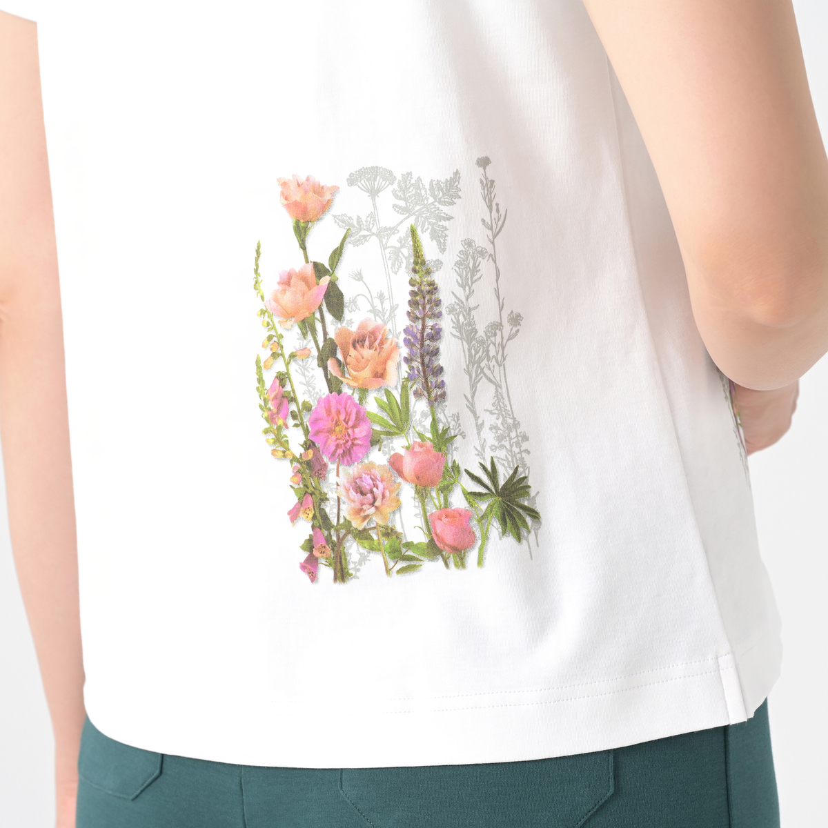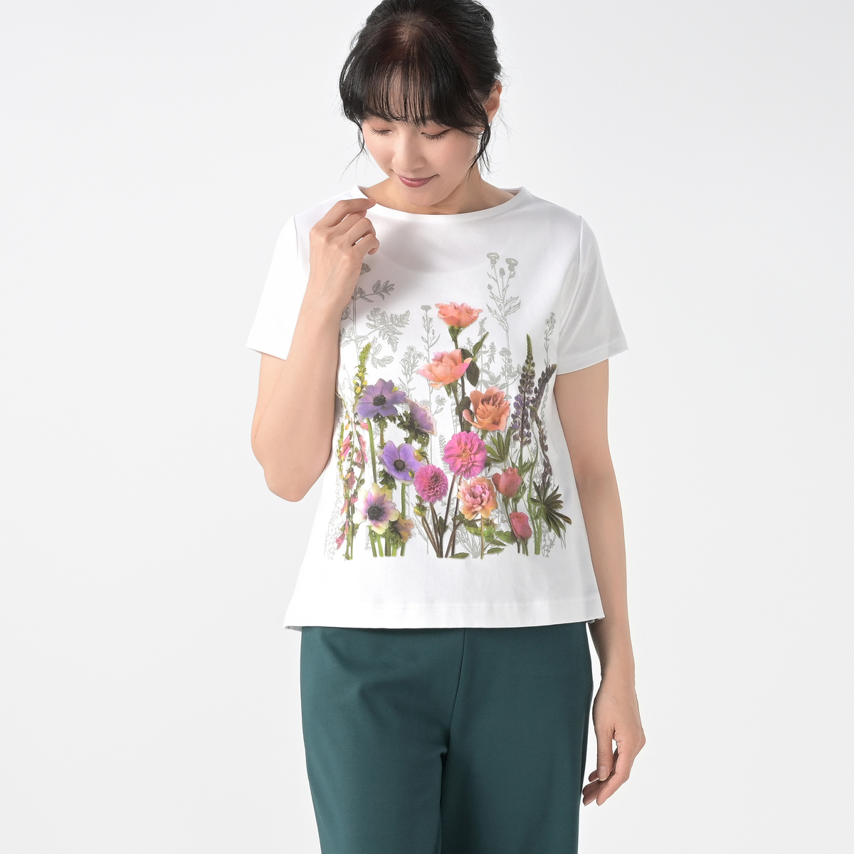 美しいプリントが目を引くプルオーバー。緻密に計算されたネックラインは胸元を美しく見せ、袖はアームホールをたっぷりとり、二の腕をほっそりと見せてくれます。スカートやワイドパンツなどボリュームのあるボトムスとも好相性です