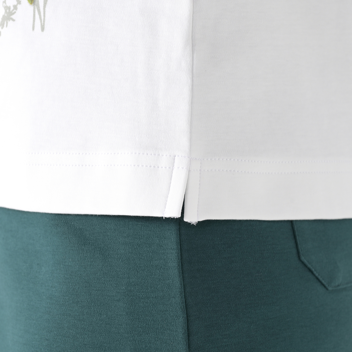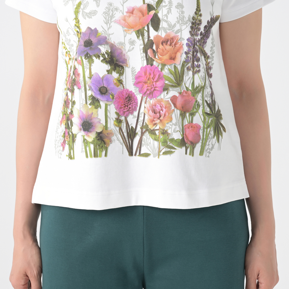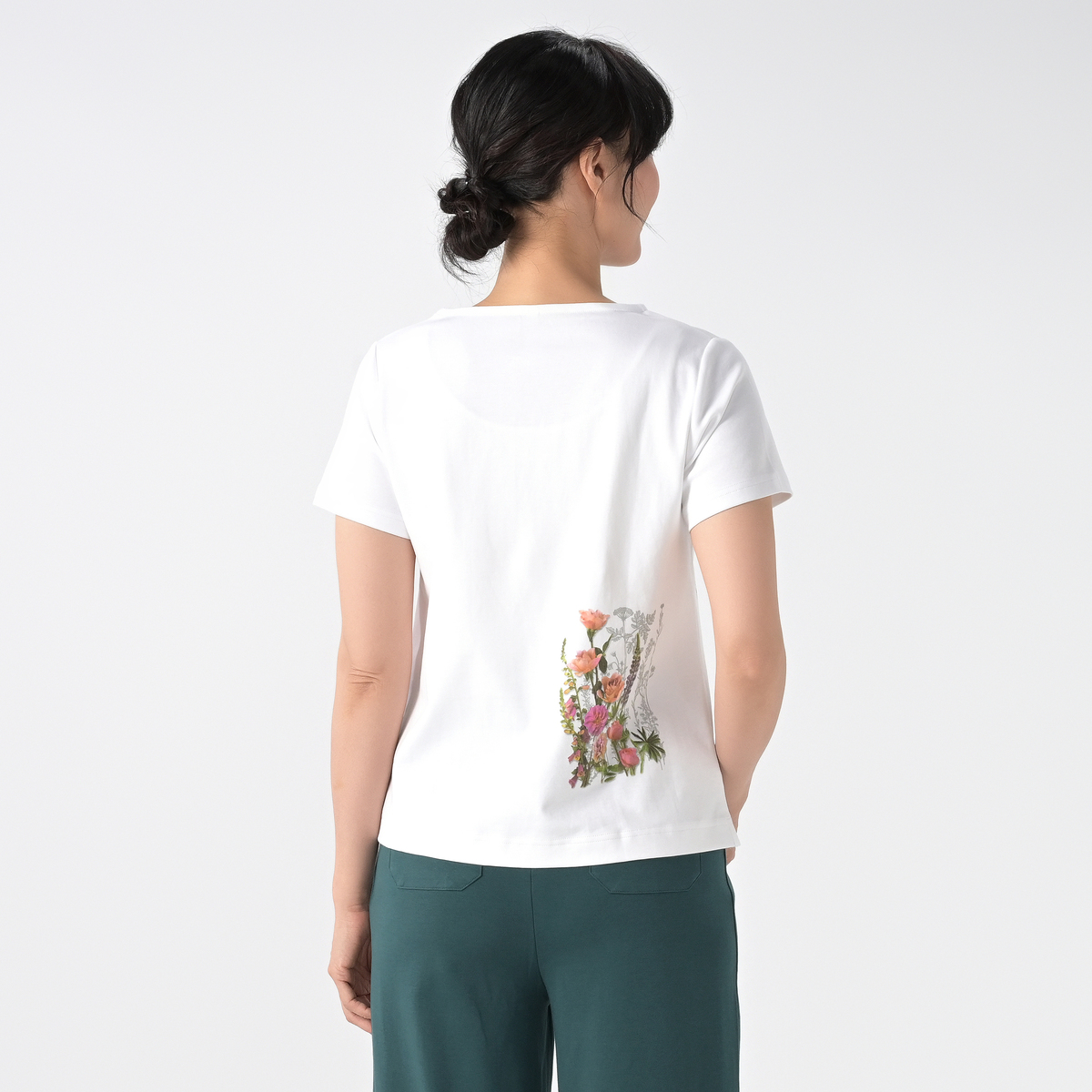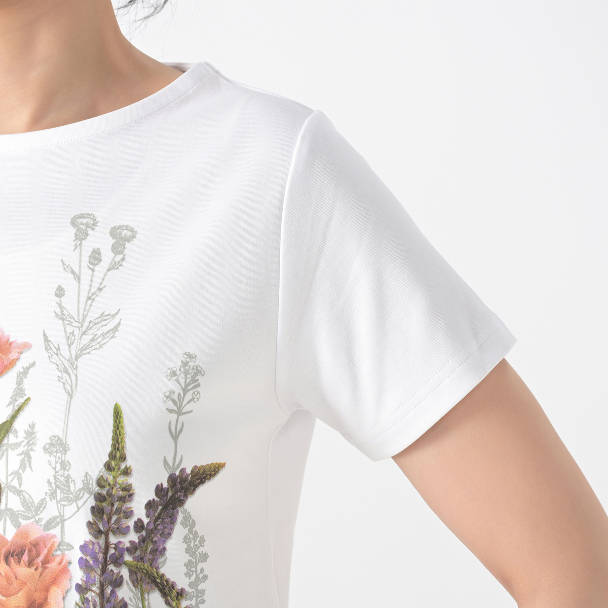 一色ずつ丁寧に重ねた色は、きれいなグラデーションを映し出し、とても繊細な手の込んだプリントです。素材は綿100%で肌触りが良く、ストレッチ性があって着やすいのも魅力。また、生地には、シルケット加工・バイオ加工を施しています