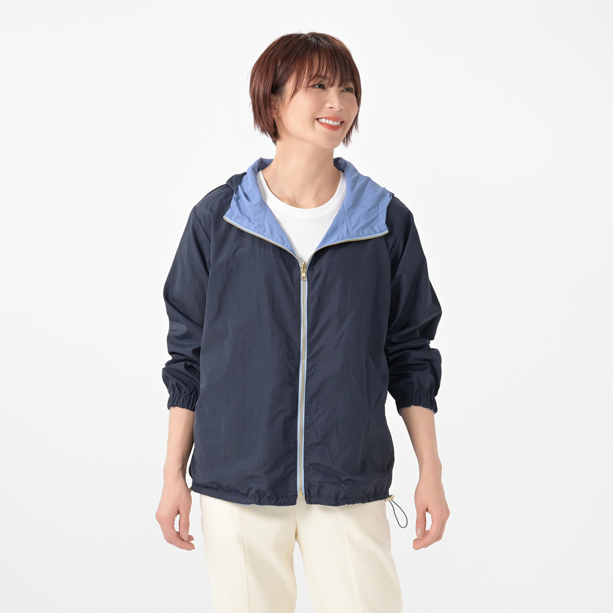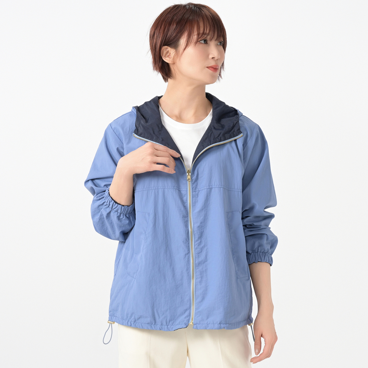軽量な素材を使ったリバーシブル仕立てのパーカー。表面に微撥水加工を施し、ソフト感があり、洗濯機(ネット使用)で洗えるイージーケアーな素材です。レディースのパーカーですが、ワンサイズアップすれば男性のも着用も可能です