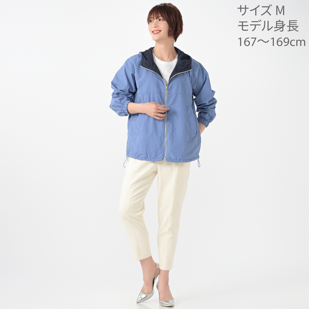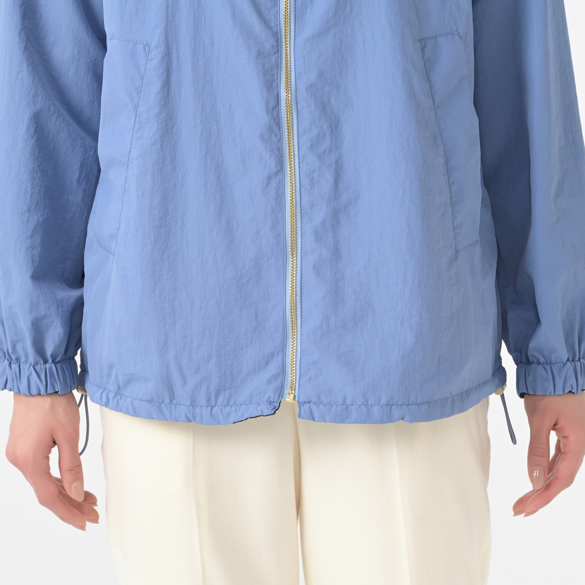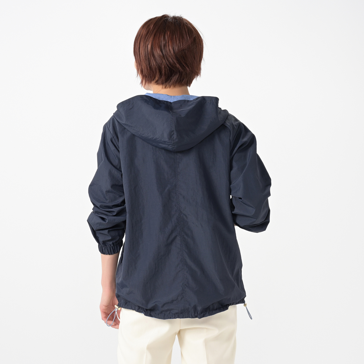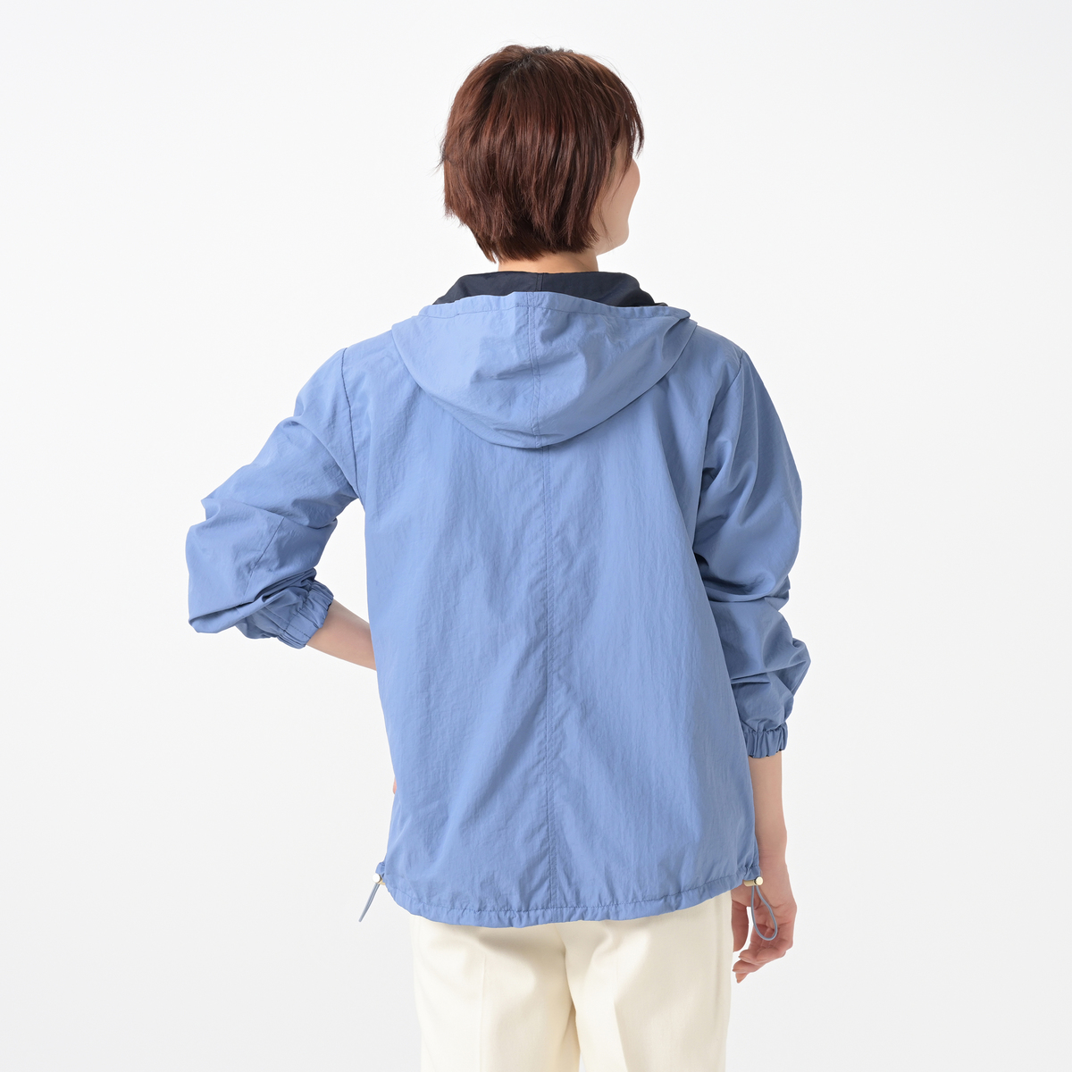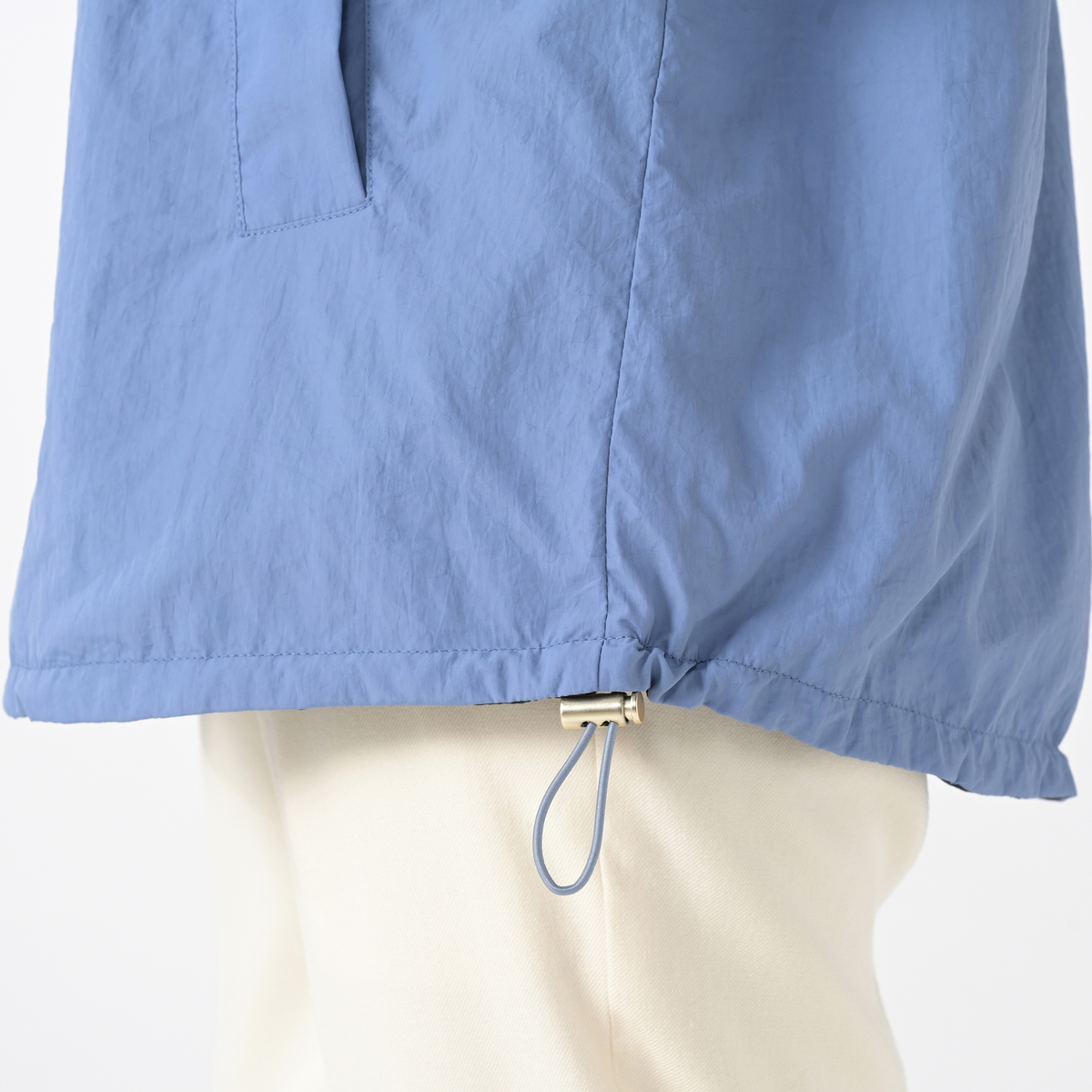 濃淡のカラーの組合せで、表側にはヨーク部分に切り替えを入れ、裏側は切り替え無しのデザイン。少し長めの着丈で、裾の脇はストッパー付きでブラウジング可能。ストレートでも着用でき、ストッパーを締めてブルゾン風にも着まわしが楽しめます
