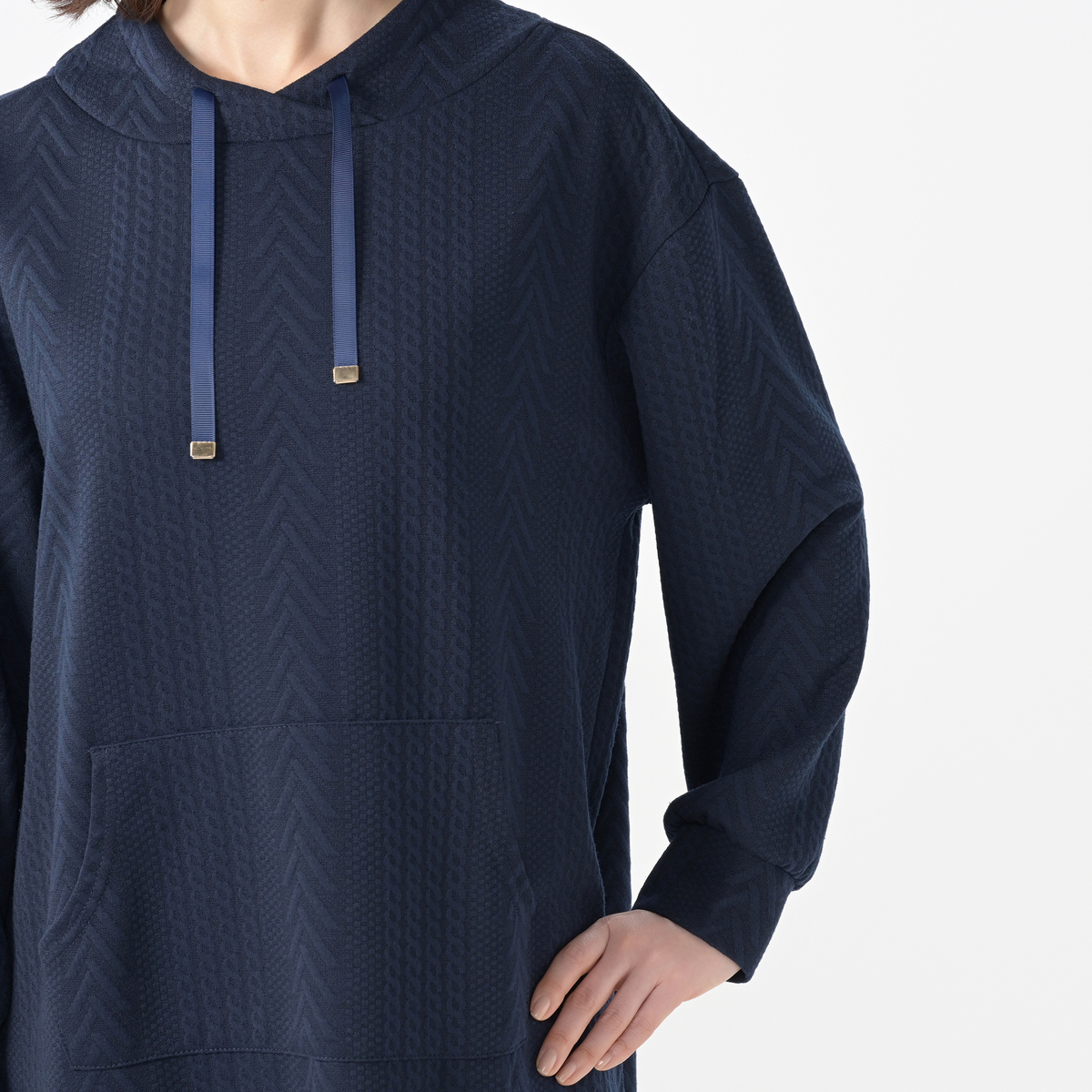 着脱ラクチンでリラクシーなデザインで、両脇にはスリット入り。フード風デザインの衿は軽くすっきりとした印象です。前中心にはポケットを付けました