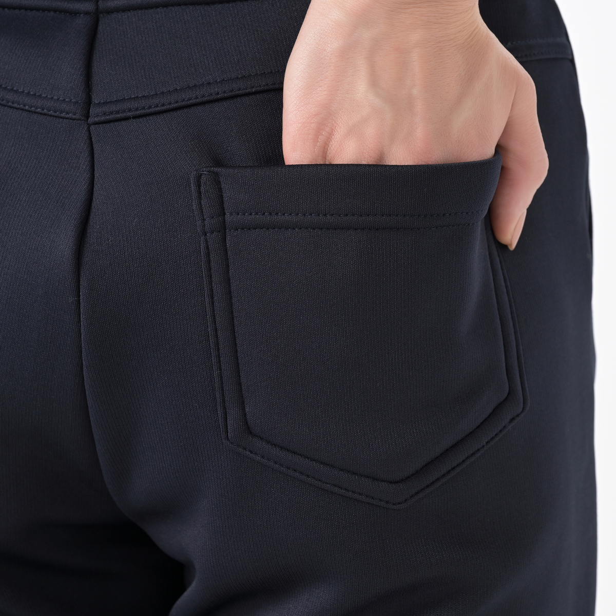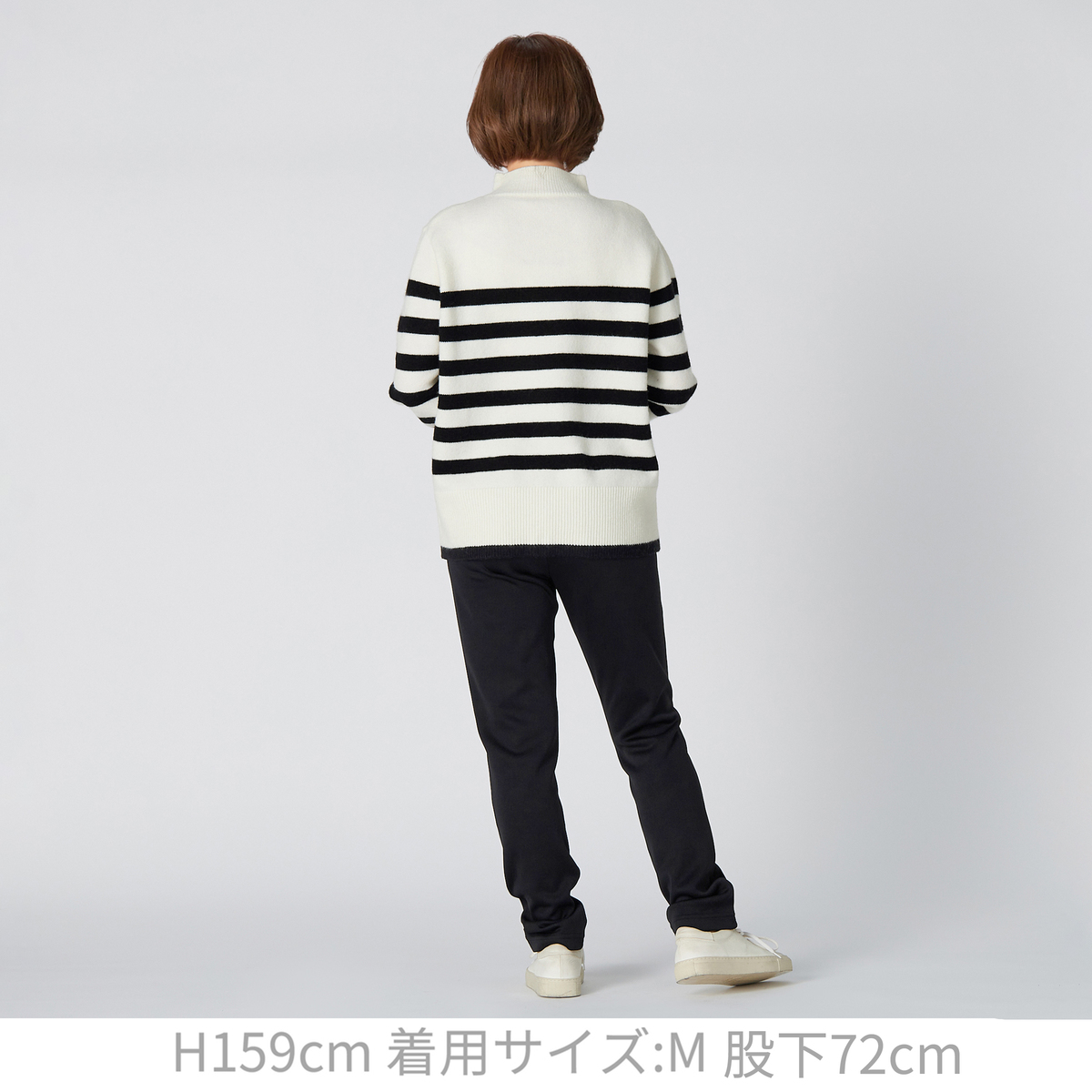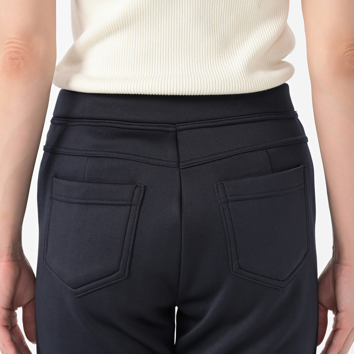 スリムタイプパンツのシルエットで、本ポケットを前後に付けた本格仕立てのプルオンパンツ。ウエストは全体にゴム入りで着脱しやすく、股上は深めで、スッキリ見える様にデザイン。肉厚生地ながら、前ポケットはお腹周りがスッキリ見えるスラッシュポケット仕立てです