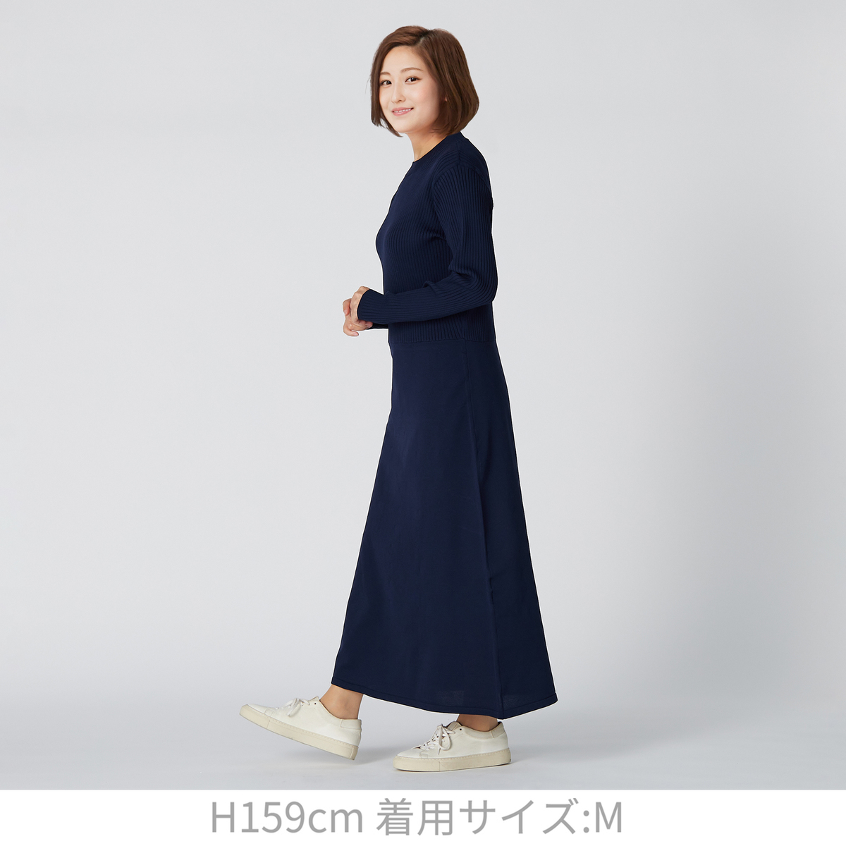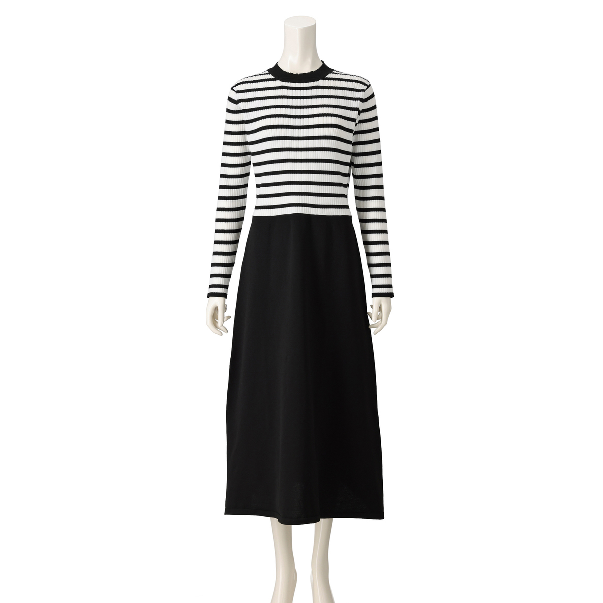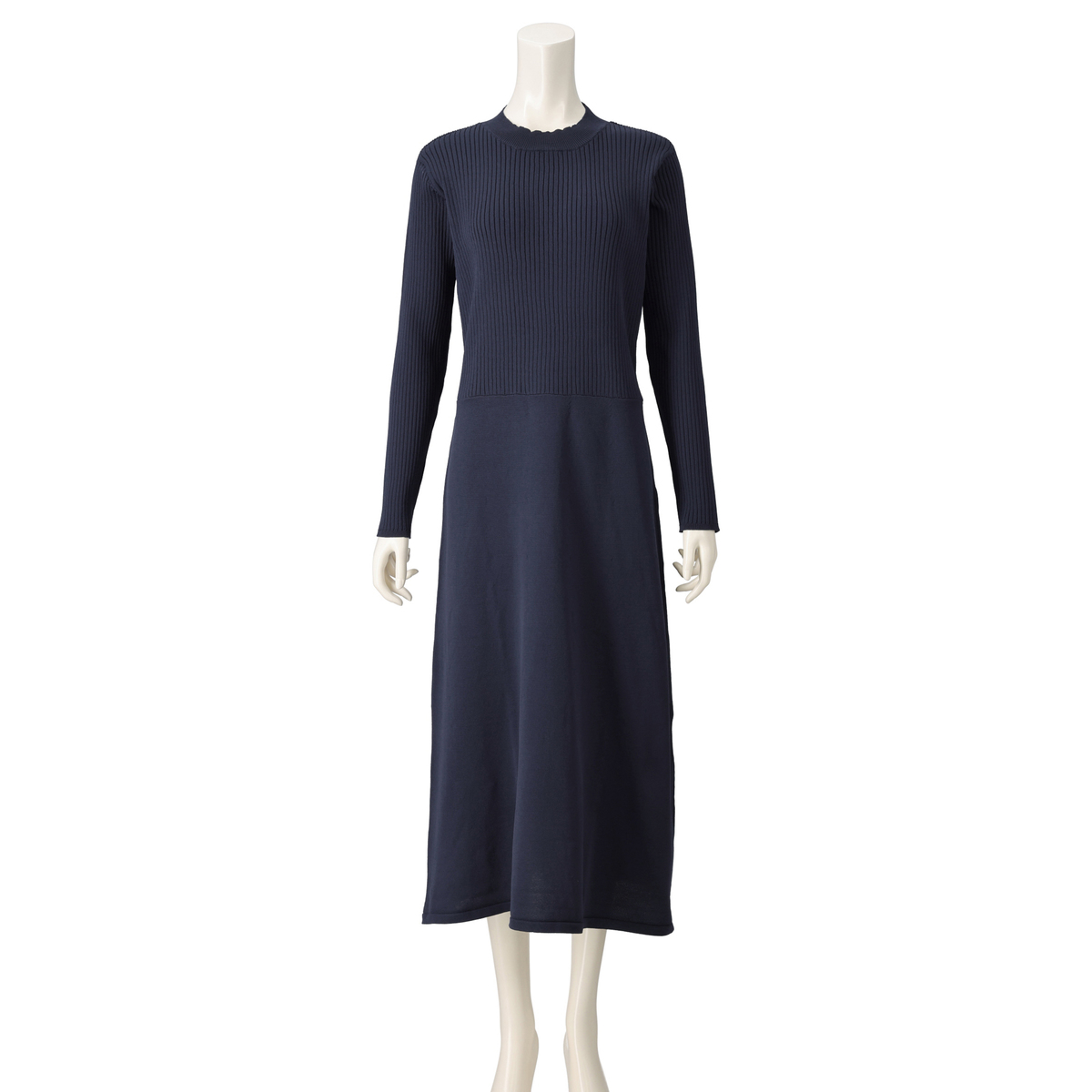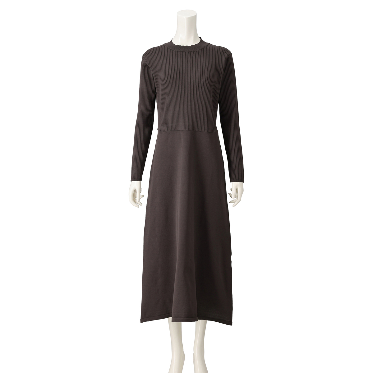 上身頃とスカート部分の編み地を変え、シャープな雰囲気に仕上げたニットワンピース。上身頃はすっきりシルエットのリブハイネックで、ウエストから裾にかけてふんわりとしたAラインが広がる、スレンダー見えするデザインです