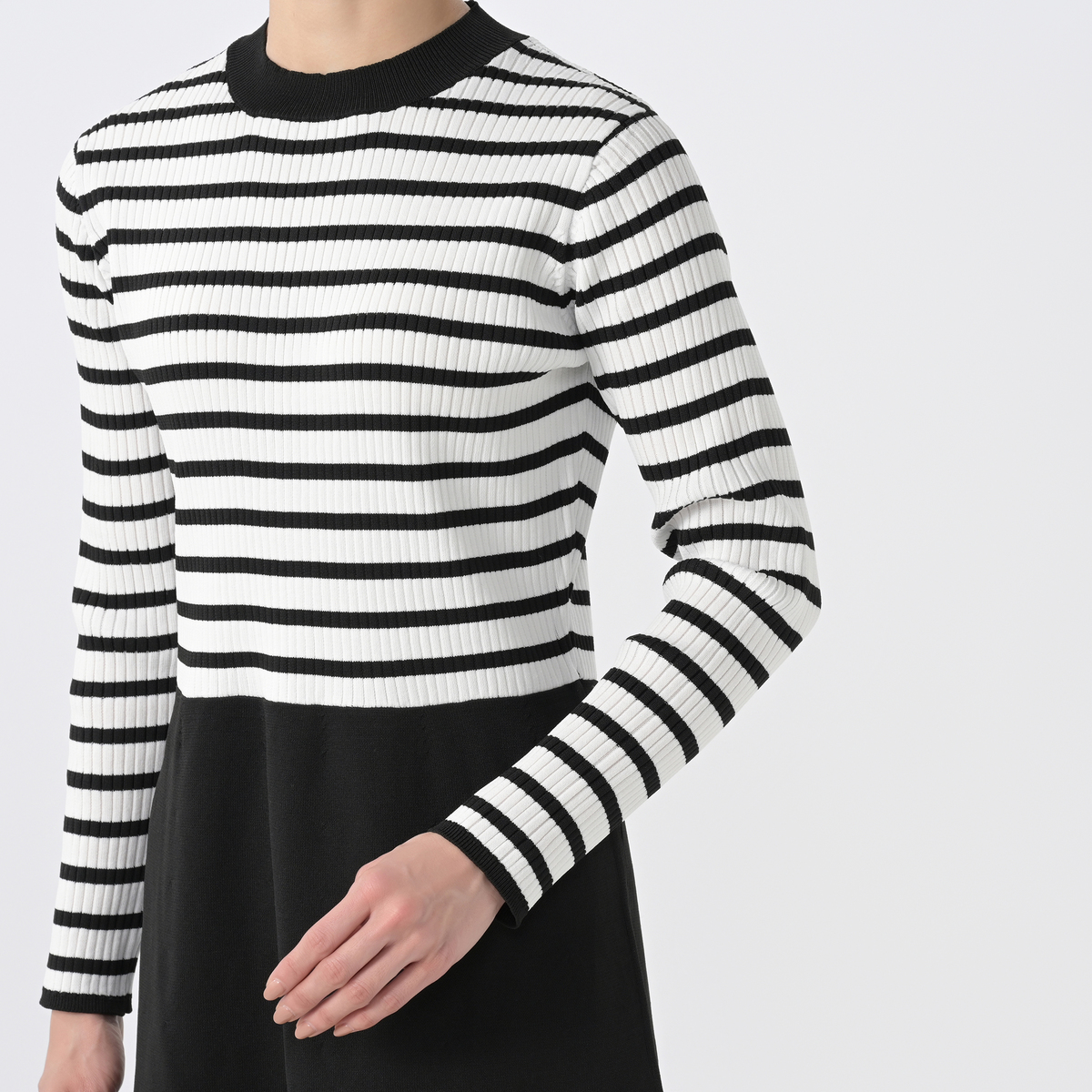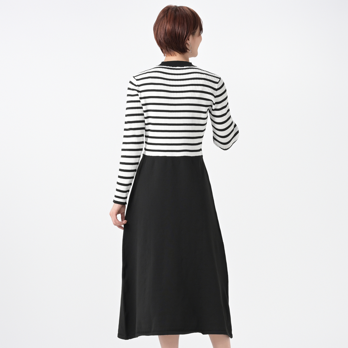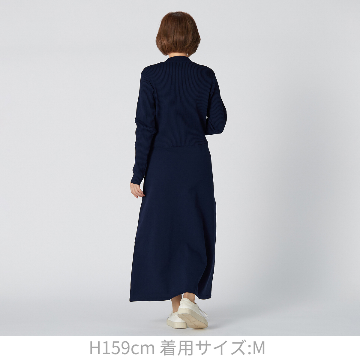 上身頃とスカート部分の編み地を変え、シャープな雰囲気に仕上げたニットワンピース。上身頃はすっきりシルエットのリブハイネックで、ウエストから裾にかけてふんわりとしたAラインが広がる、スレンダー見えするデザインです