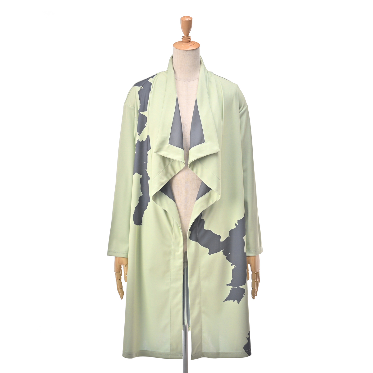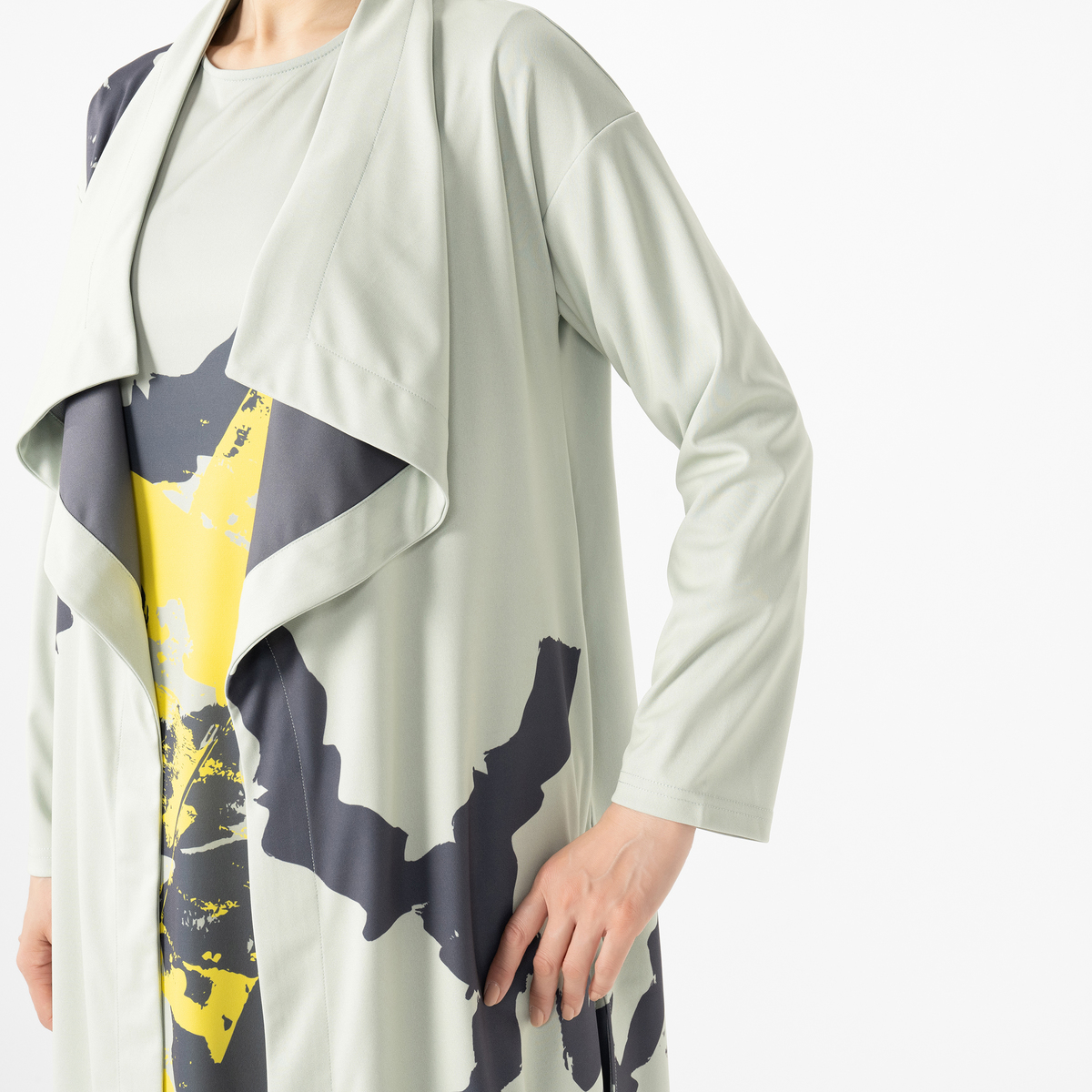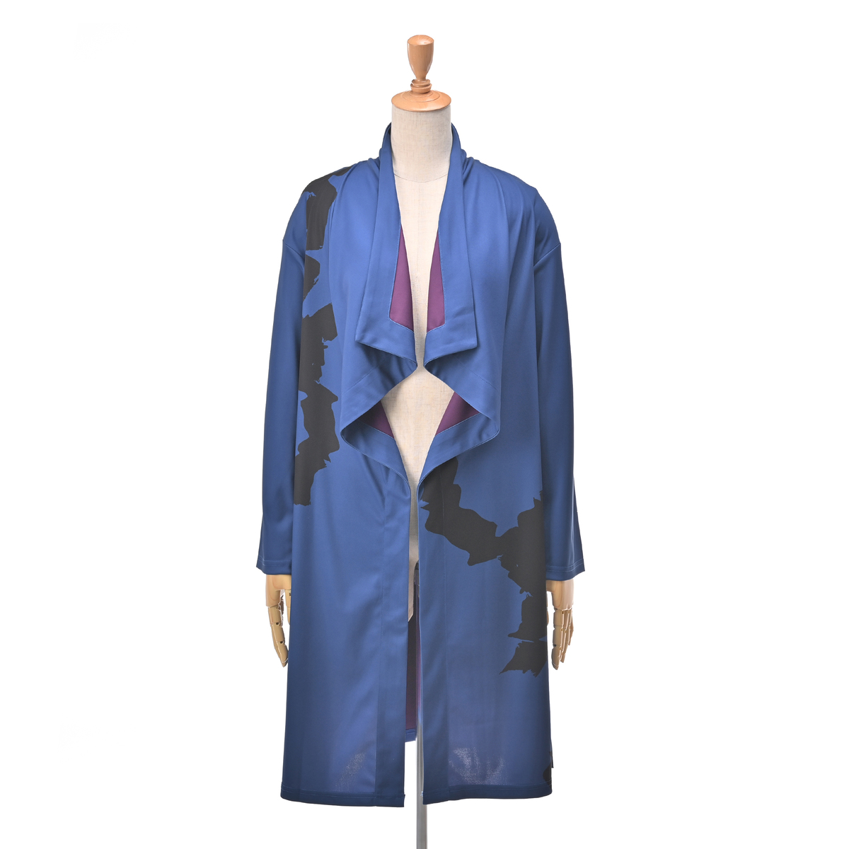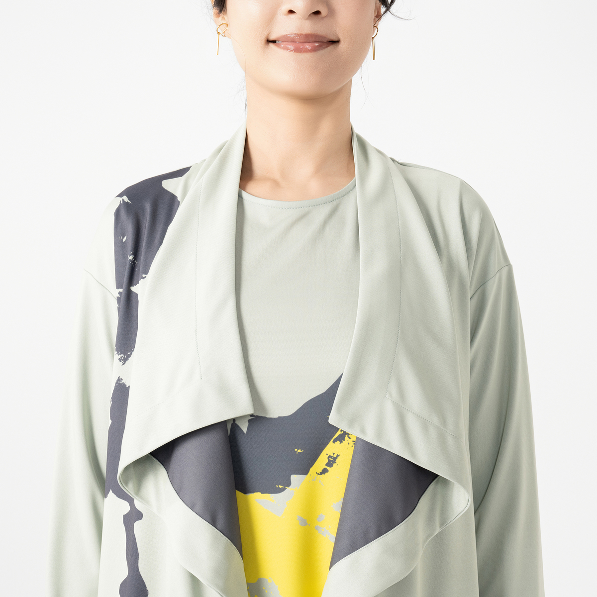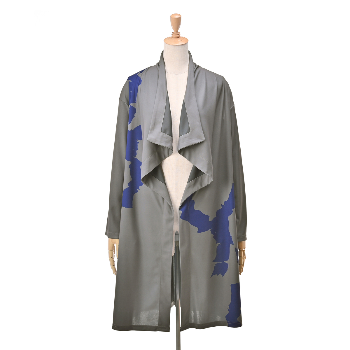 コシノジュンコ先生のアート作品をプリントしたロングカーディガン。フロントのドレープがエレガントで、ダイナミックで躍動感あるプリントデザインが特別な存在感を放ちます