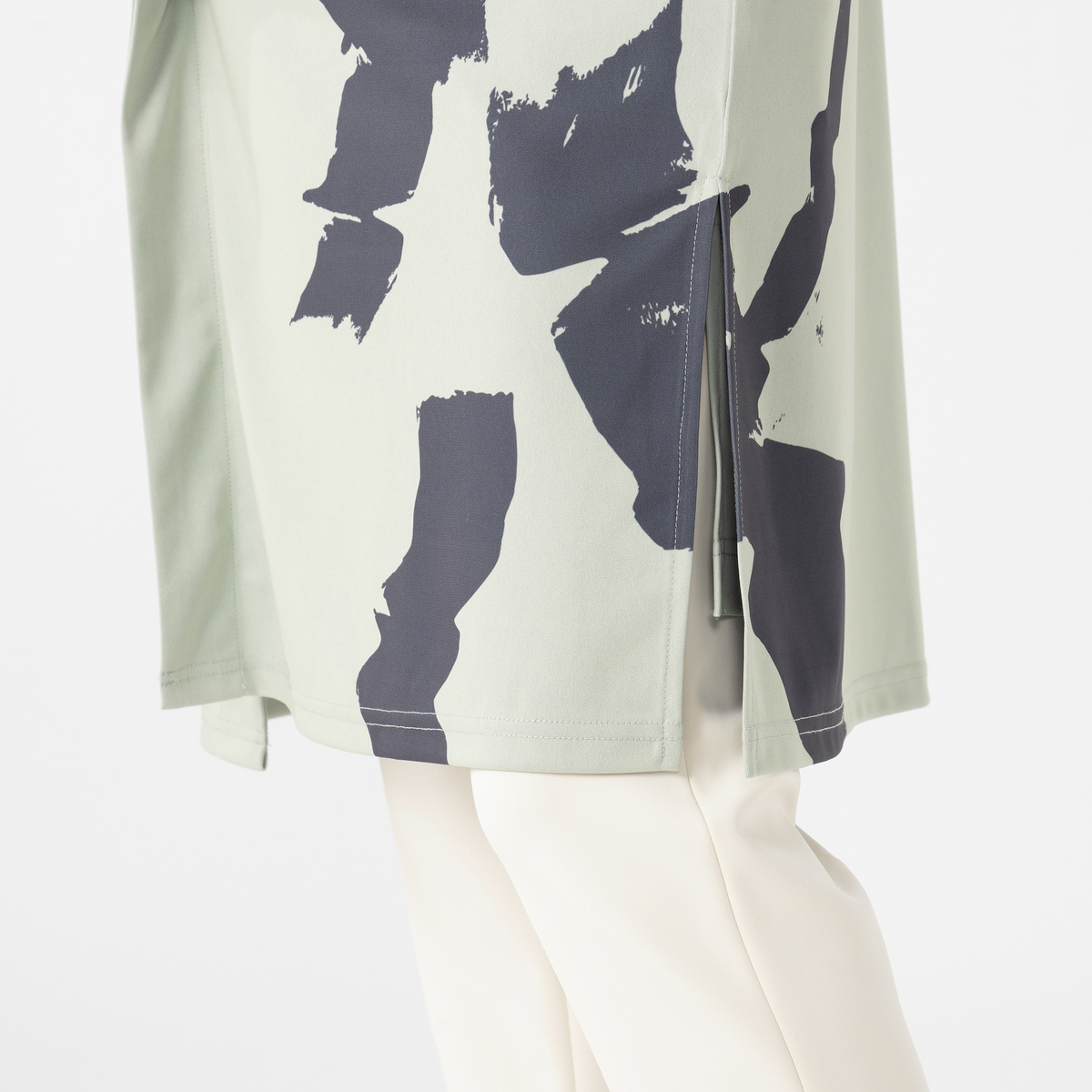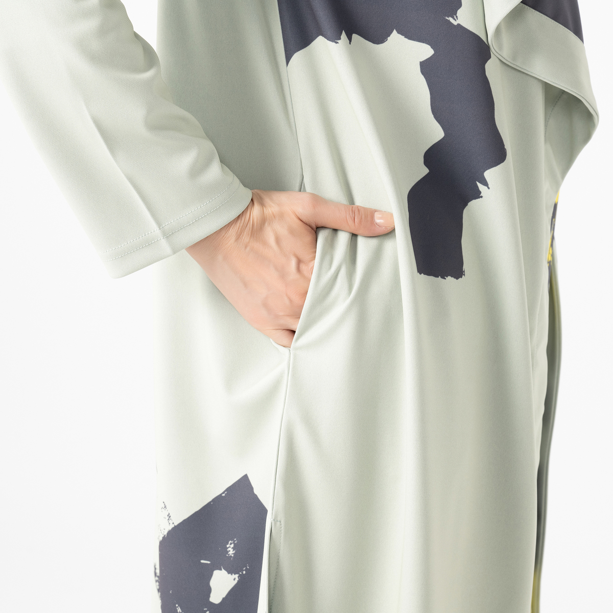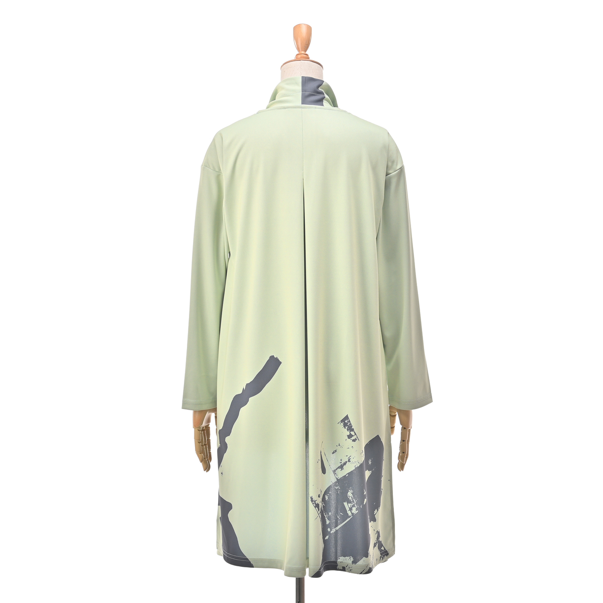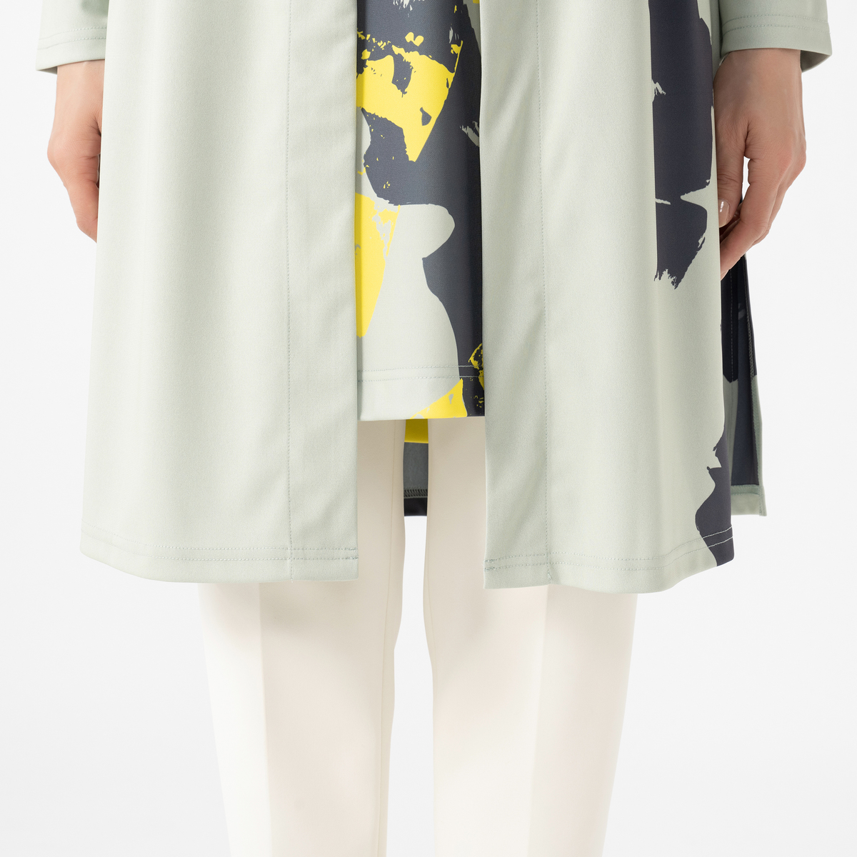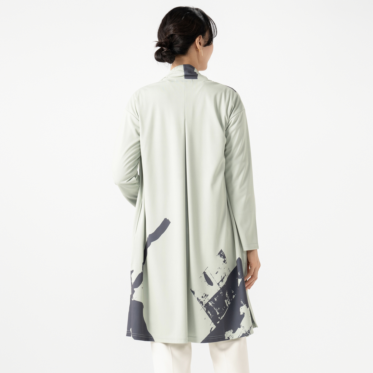 コシノジュンコ先生のアート作品をプリントしたロングカーディガン。フロントのドレープがエレガントで、ダイナミックで躍動感あるプリントデザインが特別な存在感を放ちます