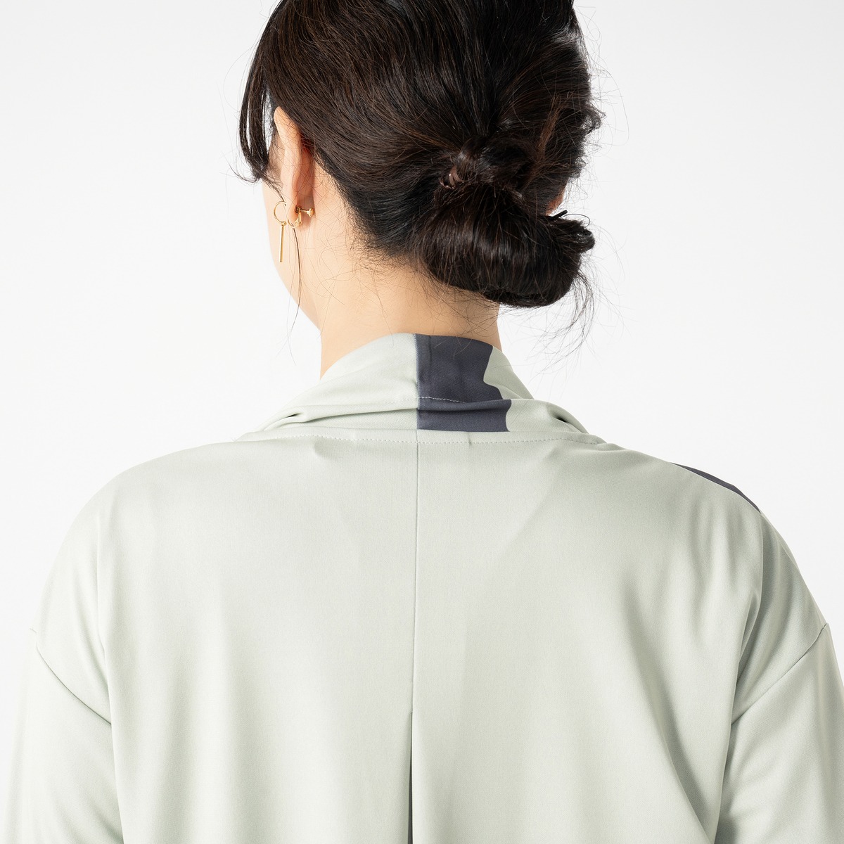 本ラインで定番として使用されている通称「砂ジャージー」と呼ばれる素材を、BOUTIQUE JUNKO仕様に。強撚糸を使用したシャリ感が特徴。お手入れしやいすいのにクリーンな表面感で布帛見えし、伸縮性のあるジャージー素材なのに、程よい張り感とドレープ感もあり仕立て映えする素材です