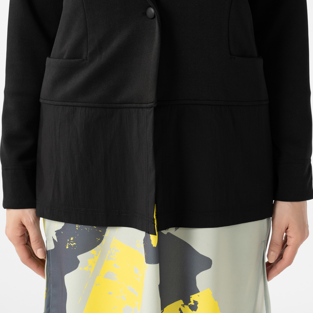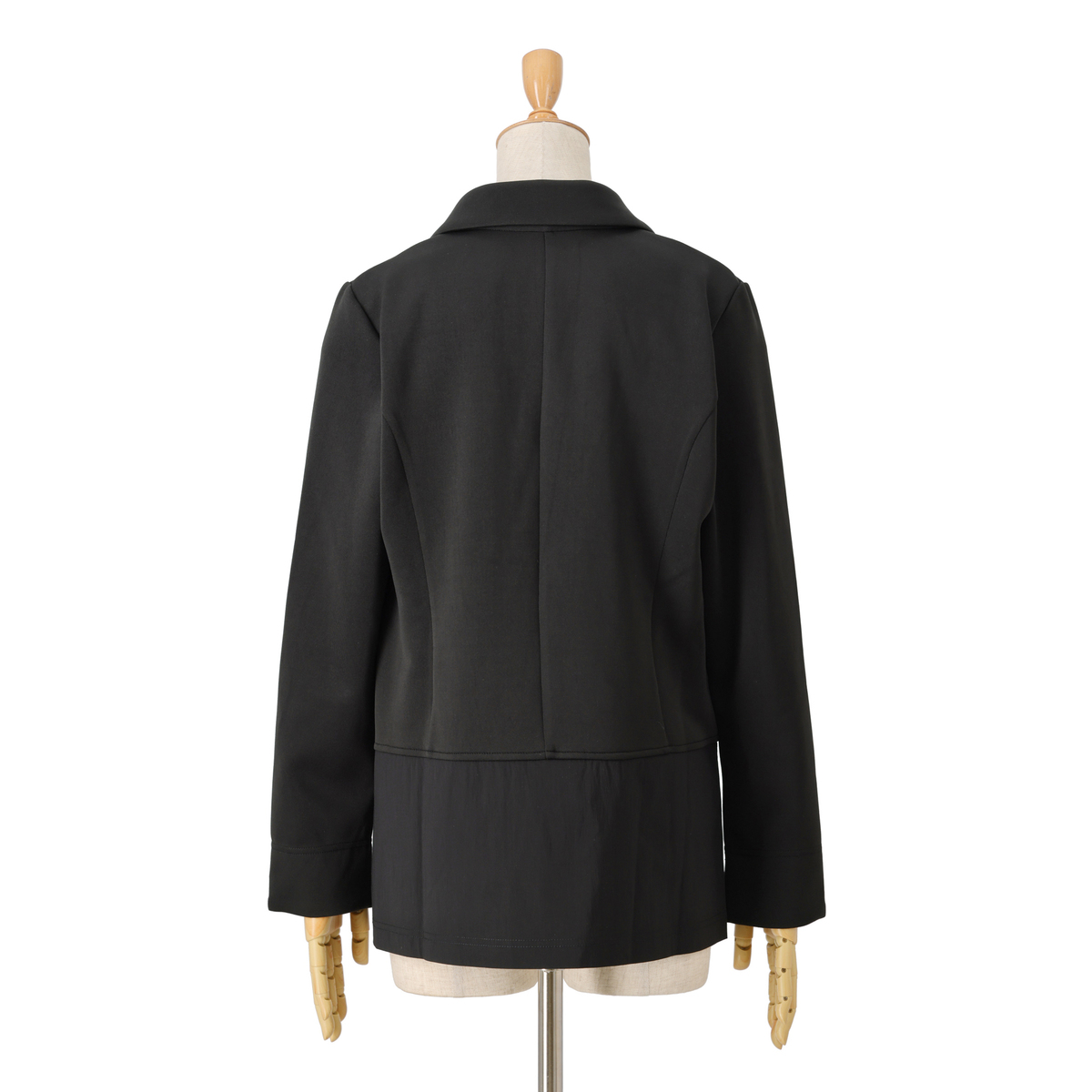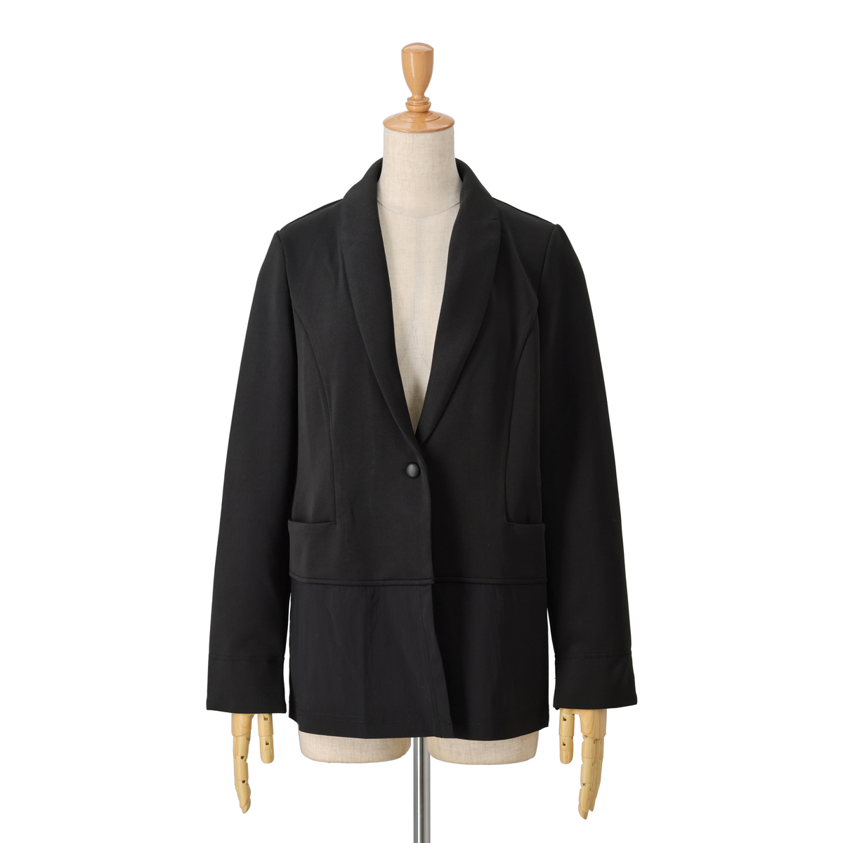 裾を異素材で切り替えたショールカラーデザインのジャケット。程よい張り感のあるジャージー素材で体のラインを拾いにくく、美しいシルエットを演出。日常のコーディネートに洗練された雰囲気をプラスする一枚です