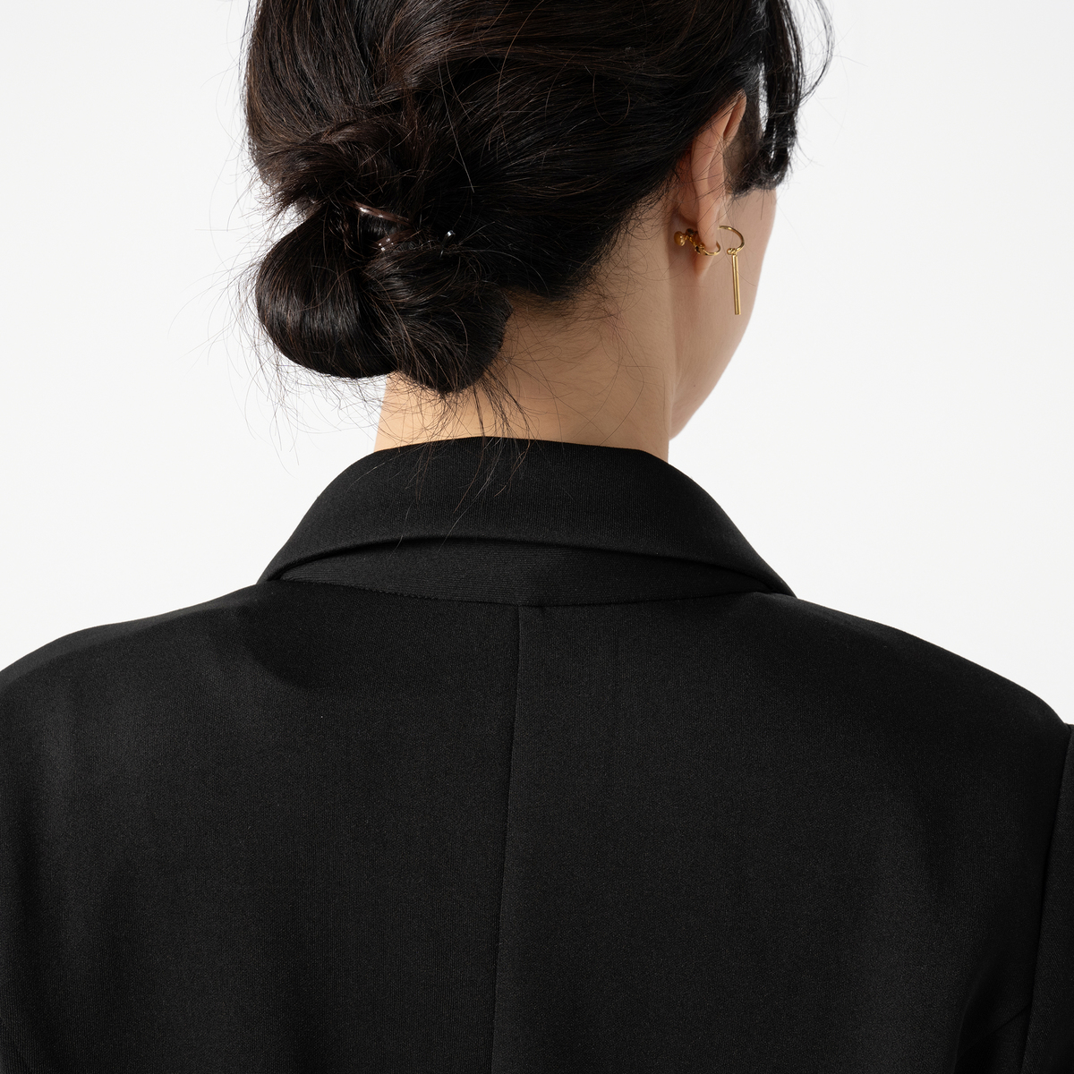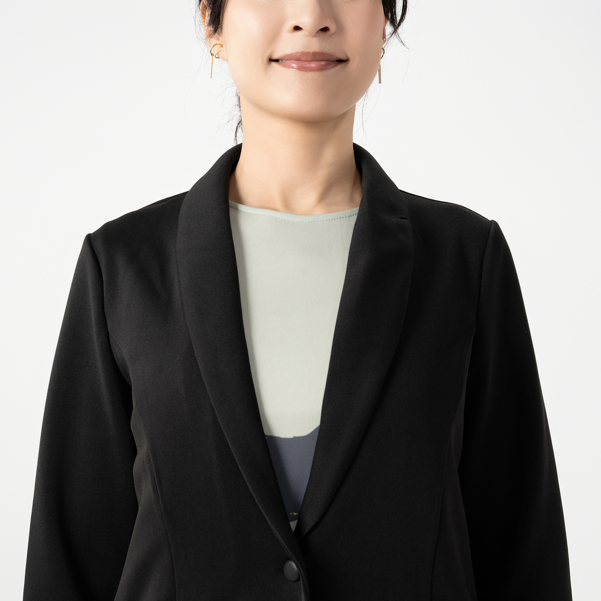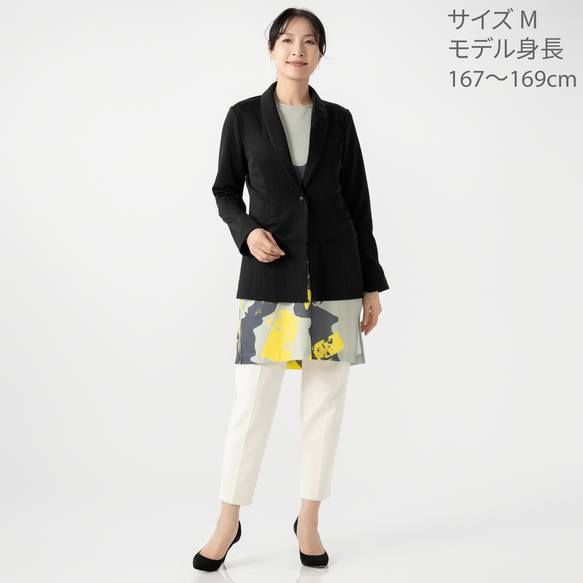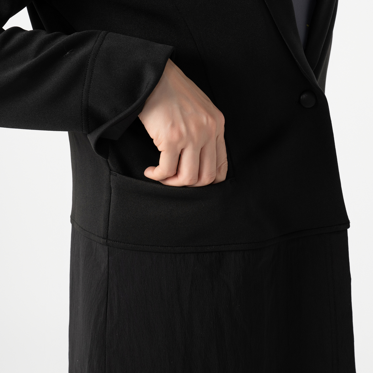 裾を異素材で切り替えたショールカラーデザインのジャケット。程よい張り感のあるジャージー素材で体のラインを拾いにくく、美しいシルエットを演出。日常のコーディネートに洗練された雰囲気をプラスする一枚です