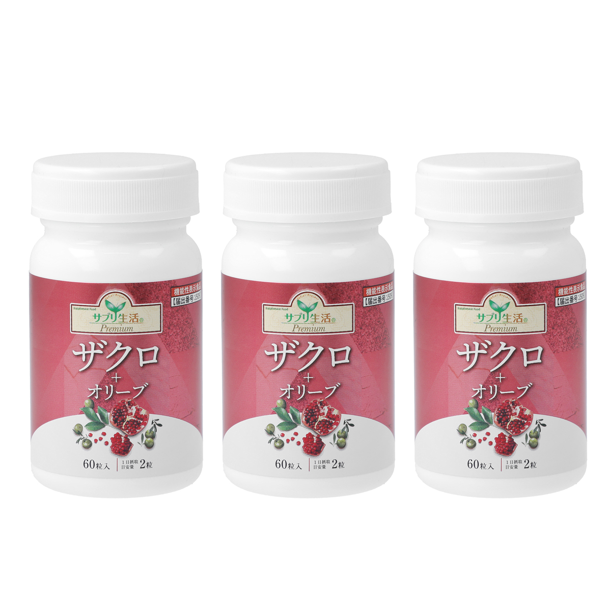 [アレルギー物質特定原材料8品目] なし [内容量] 60粒×3個/計180粒 [目安量] 1日2粒 [お召し上がり方] 一日摂取目安量を水又はぬるま湯などと一緒にお召し上がりください [栄養成分表示] 1日当たりの摂取目安量(2粒 748mg)当たり エネルギー2.88kcal、たんぱく質0.13g、脂質0.02g、 炭水化物0.55g、食塩相当量0.0014g 機能性関与成分 エラグ酸 3mg オリーブ由来ヒドロキシチロソール 1.59mg [届出番号]J509 [届出表示] 本品にはエラグ酸とオリーブ由来ヒドロキシチロソールが含まれます。 エラグ酸は肥満気味の方の体脂肪、血中中性脂肪、体重、ウエスト周囲径、内臓脂肪の減少をサポートし、高めのBMI値の改善に役立つことが報告されています。オリーブ由来ヒドロキシチロソールは抗酸化作用を持ち、血中のLDLコレステロール(悪玉コレステロール)が酸化され、酸化LDLコレステロールになることを抑制することが報告されています。 [保存方法] 直射日光及び高温多湿の場所を避けて保存してください [注意事項] ※多量摂取により疾病が治癒したり、より健康が増進するものではありません。1日摂取目安量を守ってください ※高血圧治療薬(降圧薬)や糖尿病治療薬(血糖降下薬)をお飲みの方は、本品の摂取を避けてください ※本品は、医薬品と異なり、疾病の診断、治療、予防を目的としたものではありません ※本品は、疾病に罹患している者、未成年者、妊産婦(妊娠を計画している者を含む)及び授乳婦を対象に開発された食品ではありません ※疾病に罹患している者は医師に、医薬品を服用している者は医師、薬剤師に摂取について相談してください ※本品は、特定保健用食品と異なり、機能性及び安全性について国による評価を受けたものではありません。届けられた科学的根拠等の情報は消費者庁のウェブサイトで確認できます ※体調に異変を感じた際は、速やかに摂取を中止し、医師に相談してください ※食物アレルギーのある方は、原材料名をご参照の上お召し上がりにならないでください ※天然物由来の原料を使用しているため、粒の色やにおいに差が生じることがありますが、品質には問題ありません ※食生活は、主食、主菜、副菜を基本に、食事のバランスを ■機能性表示食品 ※機能性関与成分 エラグ酸 3mg オリーブ由来ヒドロキシチロソール 1.59mg [原料原産地] 難消化性デキストリン(国内製造) [加工地] 日本 [原材料] 難消化性デキストリン(国内製造)、ザクロ果実末、オリーブ葉エキス末(オリーブ葉エキス、デキストリン)/ゼラチン、ステアリン酸カルシウム、アカシアガム、着色料(カラメル)