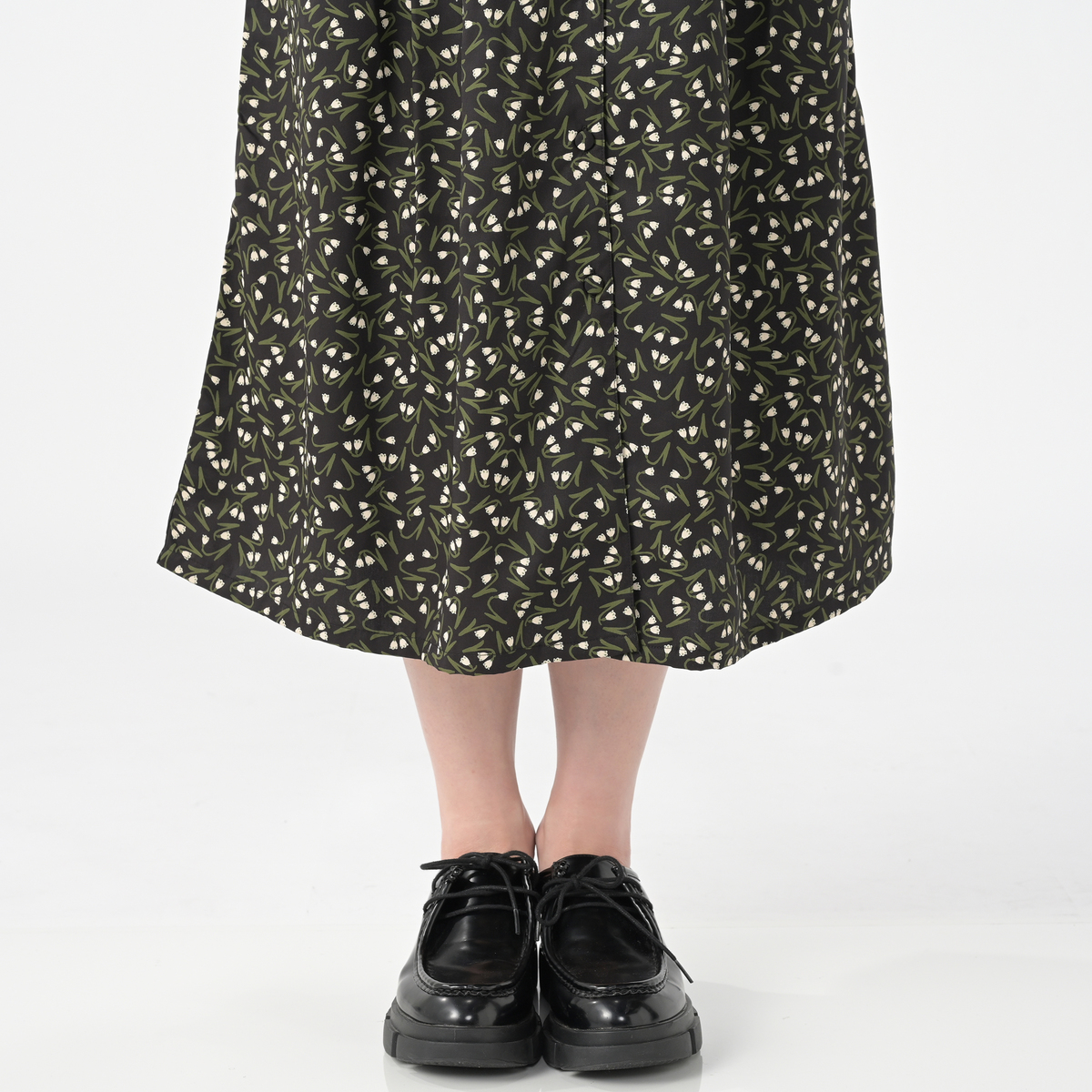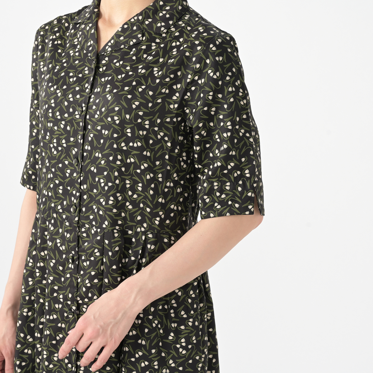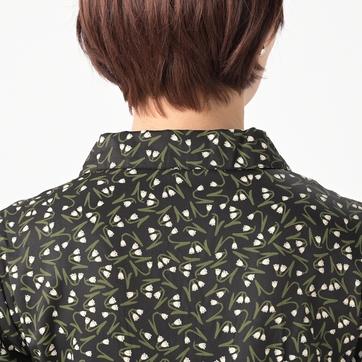 黒地に白い草花の柄をプリントしたシャツワンピース。ワンピースとしてはもちろん、前を開けて軽いアウター風としても楽しめます