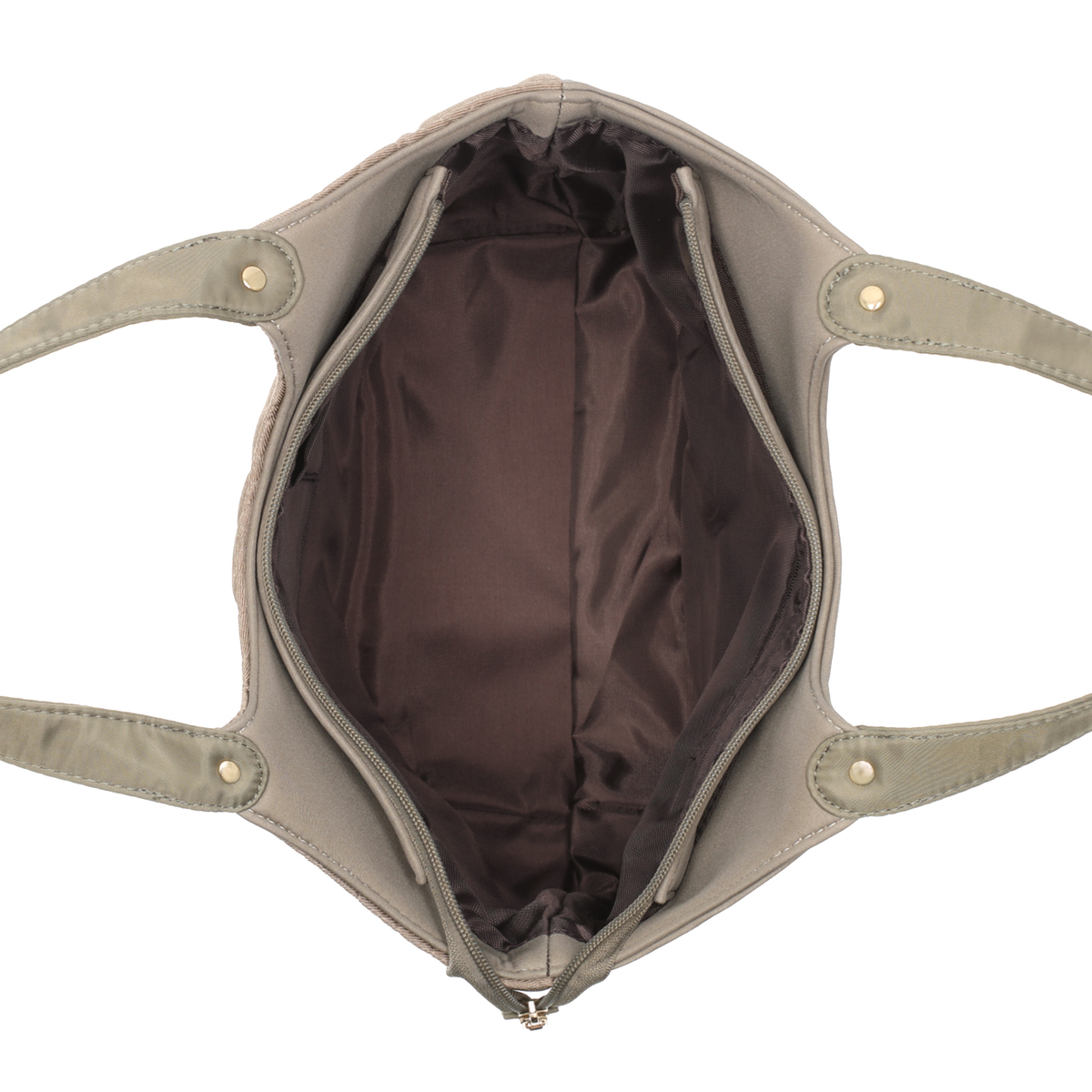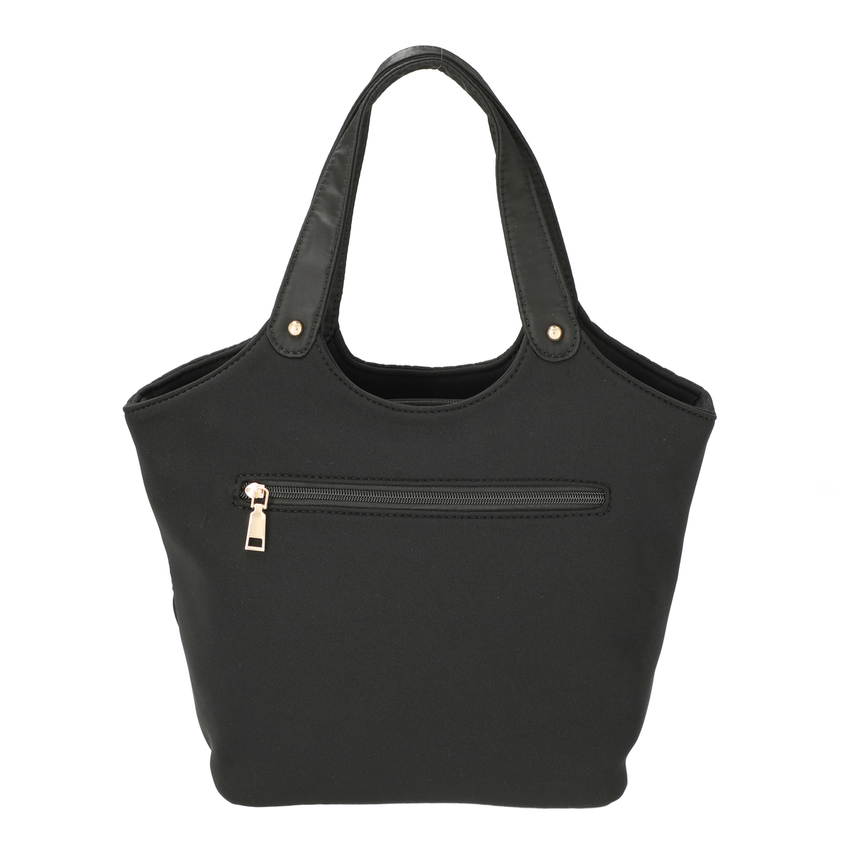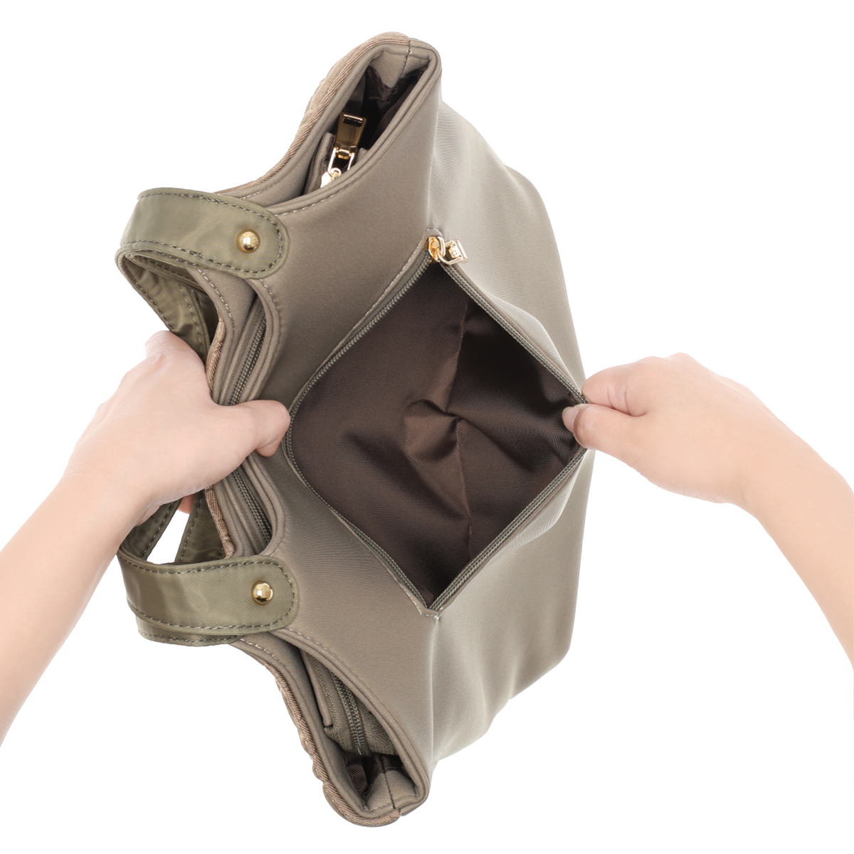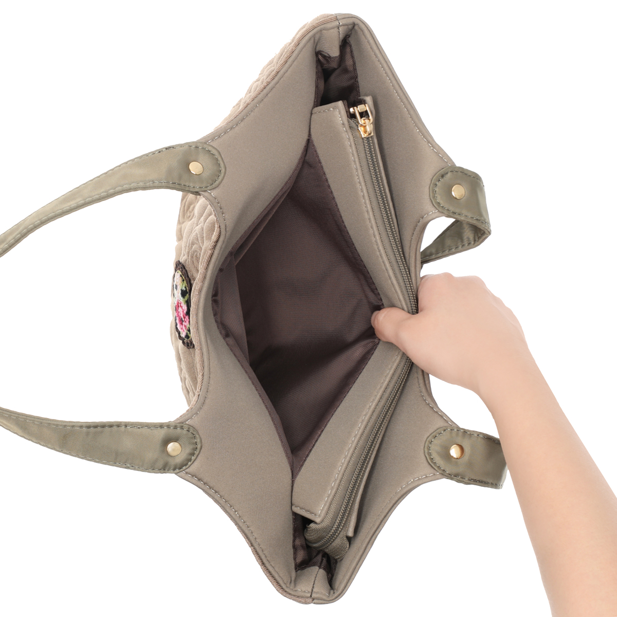 [サイズ(約)] 縦27×横37×マチ13cm ハンドル立ち上がり:19cm [重量(約)] 380g [素材] 表側生地:ポリエステル86% ポリウレタン14% 裏側生地:ポリエステル100% 持ち手:ナイロン100% シェニール織部分:綿100% ※裏地有 [仕様] 開閉:ファスナー式 底ビョウ:無 [ポケット] 内側:ファスナーポケット×1、オープンポケット×2、あおりポケット×2 外側:ファスナーポケット×1 【中国製】