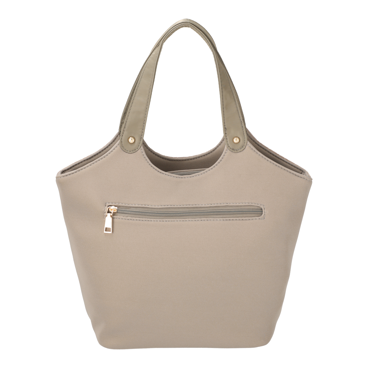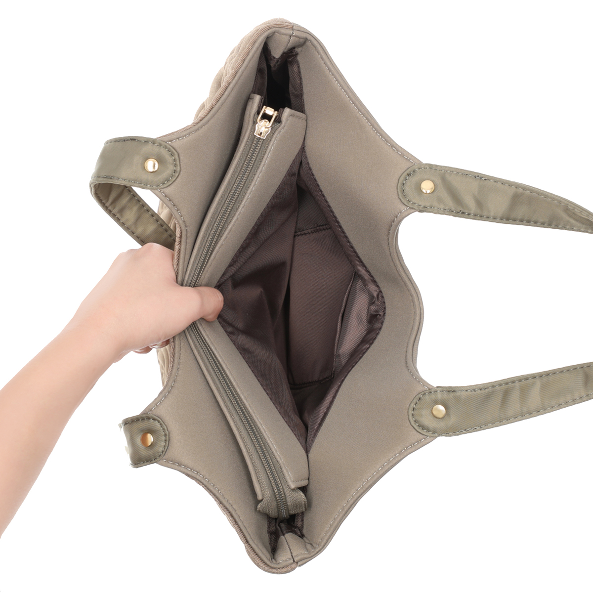 ふんわり優しい風合いのボンディング生地で作ったテサゲバッグ。A4サイズまで収納でき、約380gと軽量。背面にファスナーポケットがあり、内側にも複数のポケットを配した機能的なデザインです