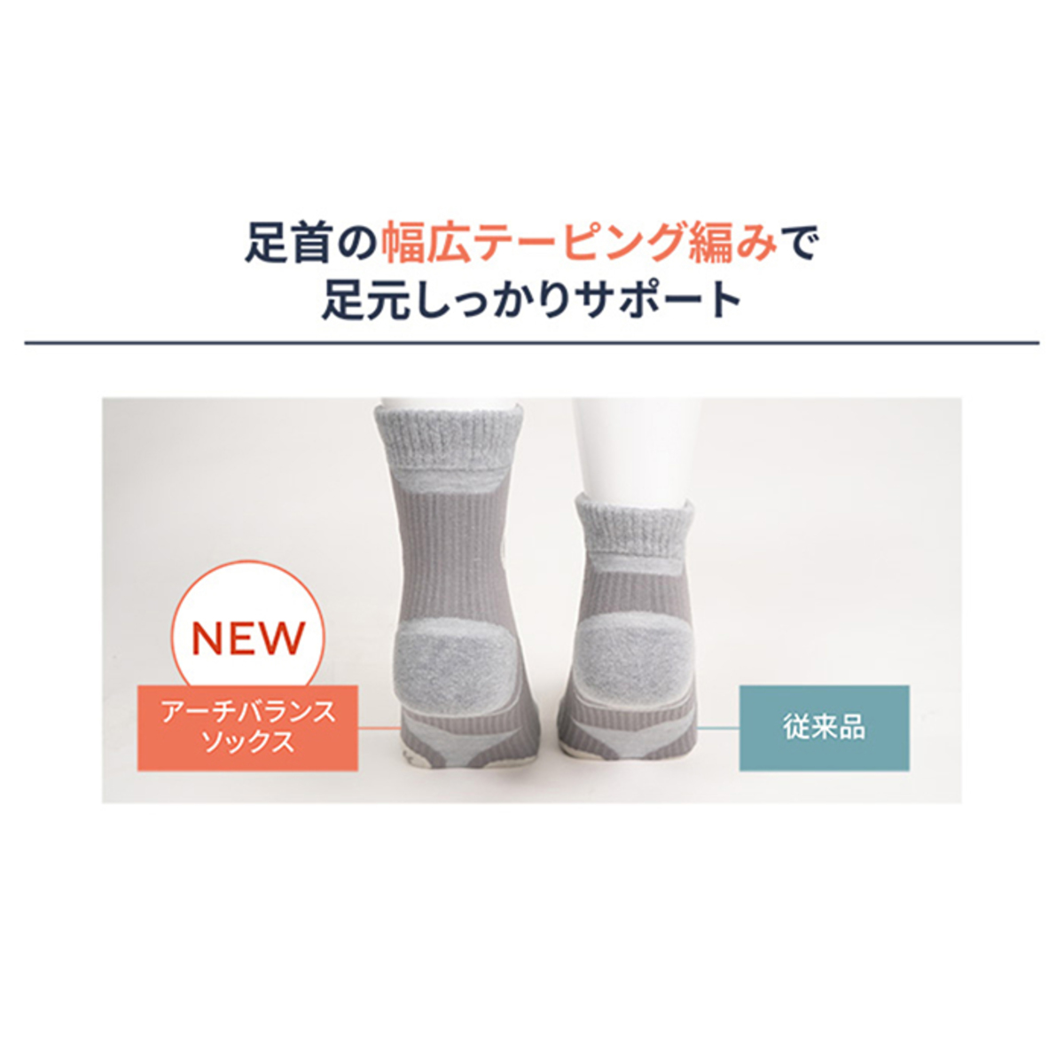 アスレティックトレーナー杉山ちなみさんと共同開発。足首、かかとをしっかり固定。足裏のアーチ・つま先を引き上げ、かかと・小趾球・母趾球をサポートするテーピングを施したソックスです