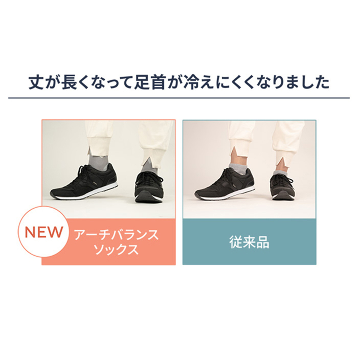 従来品より、丈が約5cm長くなりました。丈が長くなったことで足首のサポート力がアップし、足首までカバーするので冷えにくく暖かいです。※従来品:商品番号719798 「SUNAYAMA アーチバランスソックス 5足セット」