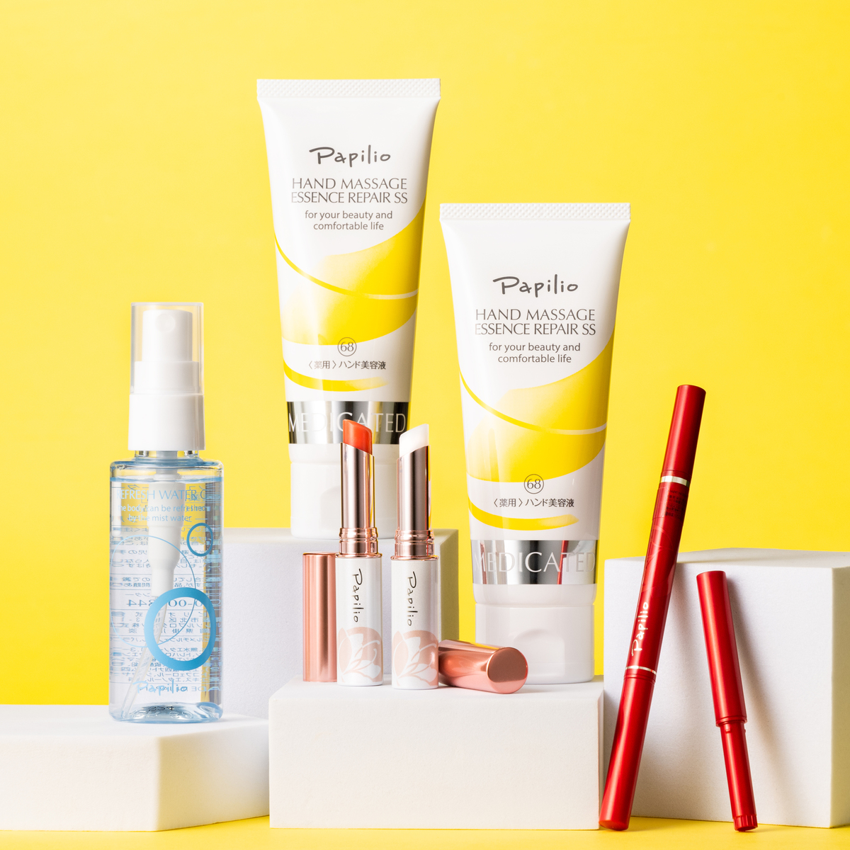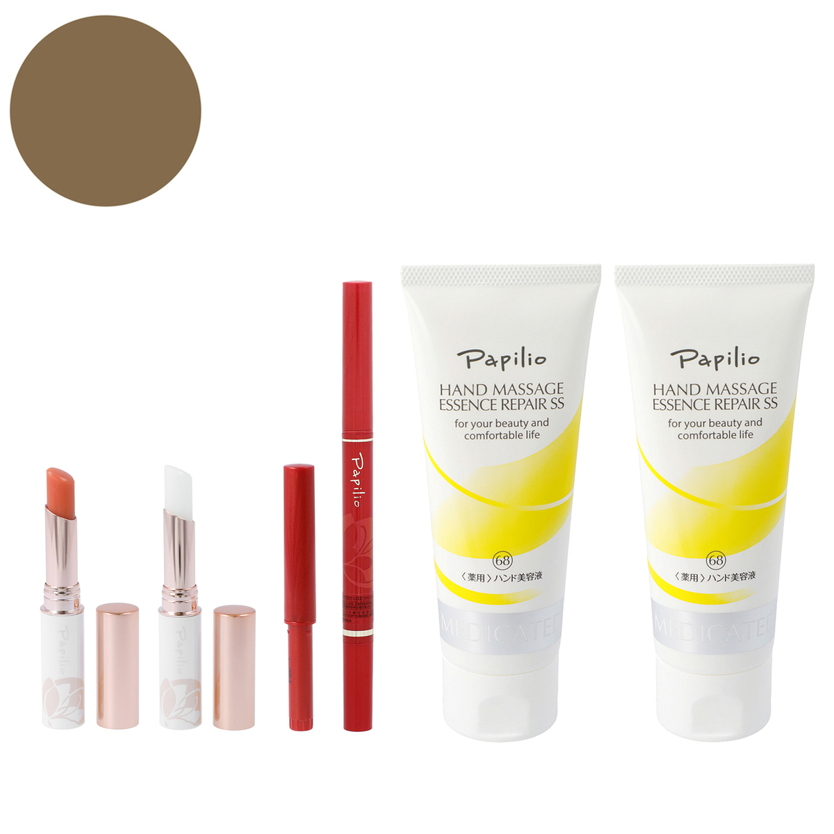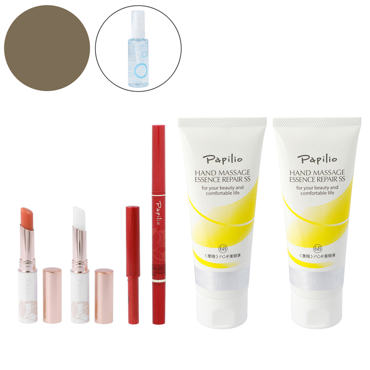 <ハンドマッサージエッセンスリペアSS> ■医薬部外品(肌あれ。あれ性。あせも・しもやけ・ひび・あかぎれ・にきびを防ぐ。油性肌。かみそりまけを防ぐ。日やけ・雪やけ後のほてりを防ぐ。肌をひきしめる。肌を清浄にする。肌を整える。皮膚をすこやかに保つ。皮膚にうるおいを与える。皮膚を保護する。皮膚の乾燥を防ぐ) [使用方法] <パピリオ ステイブロウG> ・キャップは回転式になっております。キャップをクルクルと回して開けてください ・芯は1mm程度出してご使用ください(柔らかめの芯なので、出しすぎると芯が折れることがあります) ・描いた後にぼかし用ブラシで整えると、自然な眉に仕上がります <パピリオトリートメントリップエッセンスEX> スティックを唇に当て、口紅を塗るように塗布してください <ハンドマッサージエッセンスリペアSS> 手を洗った後(水仕事後)、入浴後など、随時使用可。1日1回は軽くマッサージすることをお勧めします 【日本製】 [注意事項] <パピリオ ステイブロウG> ※お肌に異常が生じていないかよく注意してご使用ください ※傷・はれもの・しっしん・かぶれ・ただれなどの症状があるときにはお使いにならないでください ※使用中や使用後の赤み・はれ・かゆみ・刺激・色抜け(白斑等)や黒ずみなどの異常があらわれた場合、また、使用したお肌に直射日光があたってそのような症状があらわれ場合は使用をやめ、皮ふ科専門医などにご相談ください。そのまま使用を続けますと症状を悪化させることがあります ※目に入ったときは、こすらずに、すぐに水かぬるま湯で洗い流してください ※高温や直射日光を避け、乳幼児の手の届かないところに置いてください ※ご使用後は必ずキャップをきちんと閉めてください ※衣類などにつくと落ちないことがありますので、ご注意ください ※ご使用後は芯をもとに戻し、必ずキャップを閉めてください。キャップを閉めずにおくと、芯が硬くなり、描けなくなります [セット内容] ・パピリオ ステイブロウG (ぼかし用ブラシ付)×1本 ・パピリオ ステイブロウG リフィル (キャップ付きリフィル)×1本 ・パピリオトリートメントリップエッセンスEX(レッド、クリア)×各1 ・パピリオハンドマッサージエッセンスリペアSS(医薬部外品)100g×2 ・パピリオリフレッシュウォーターGトライアルサイズ60ml(プレゼント) <パピリオトリートメントリップエッセンスEX> ※唇に異常があるとき、または、あらわれたときは、ご使用をおやめください ※ご使用後はキャップをきちんとしめてください ※高温や直射日光を避け、乳幼児の手の届かないところに置いてください ※製品特性上、まれに表面が部分的に赤くなることがありますが、品質に問題はありません [成分] ステイブロウG: <ライトブラウン・チャコールブラウン共通> シクロペンタシロキサン、トリフルオロアルキルジメチルトリメチルシロキシケイ酸、トリメチルシロキシケイ酸、ポリエチレン、キャンデリラロウ、(アクリレーツ/アクリル酸ステアリル/メタクリル酸ジメチコン)コポリマー、トリ(カプリル酸/カプリン酸/ミリスチン酸/ステアリン酸)グリセリル、シリカ、アルミナ、エチルヘキサン酸セチル、カルナウバロウ、シメチコン、ジメチコン、酸化チタン、マイカ、酸化鉄 トリートメントリップエッセンスEX: <レッド系>スクワラン、リンゴ酸ジイソステアリル、(イソステアリン酸ポリグリセリル-2/ダイマージリノール酸)コポリマー、ダイマージリノール酸(フィトステリル/イソステアリル/セチル/ステアリル/ベヘニル)、イソノナン酸イソトリデシル、水添ポリイソブテン、トリ(カプリル酸/カプリン酸)グリセリル、 ラウロイルグルタミン酸ジ(フィトステリル/オクチルドデシル)、ポリエチレン、パラフィン、ダイマージリノール酸ジ(イソステアリル/フィトステリル)、マイクロクリスタリンワックス、アテロコラーゲン、アルニカ花エキス、オトギリソウ花/葉/茎エキス、カミツレ花エキス、カンゾウ根エキス、グリチルレチン酸ステアリル、コンドロイチン硫酸Na、スギナエキス、 セージ葉エキス、セイヨウノコギリソウエキス、セラミドNP、ゼニアオイ花エキス、ソメイヨシノ葉エキス、トウキンセンカ花エキス、フユボダイジュ花エキス、ローズマリーエキス、他 ハンドマッサージエッセンスリペアSS: 有効成分:グリチルレチン酸ステアリル、酢酸DL-αートコフェロール その他の成分:精製水、濃グリセリン、1,3-ブチレングリコール、白色ワセリン、セタノール、無水エタノール、ベヘニルアルコール、パルミチン酸イソプロピル、ポリ(オキシエチレン・オキシプロピレン)メチルポリシロキサン共重合体、カルボキシビニルポリマー、他