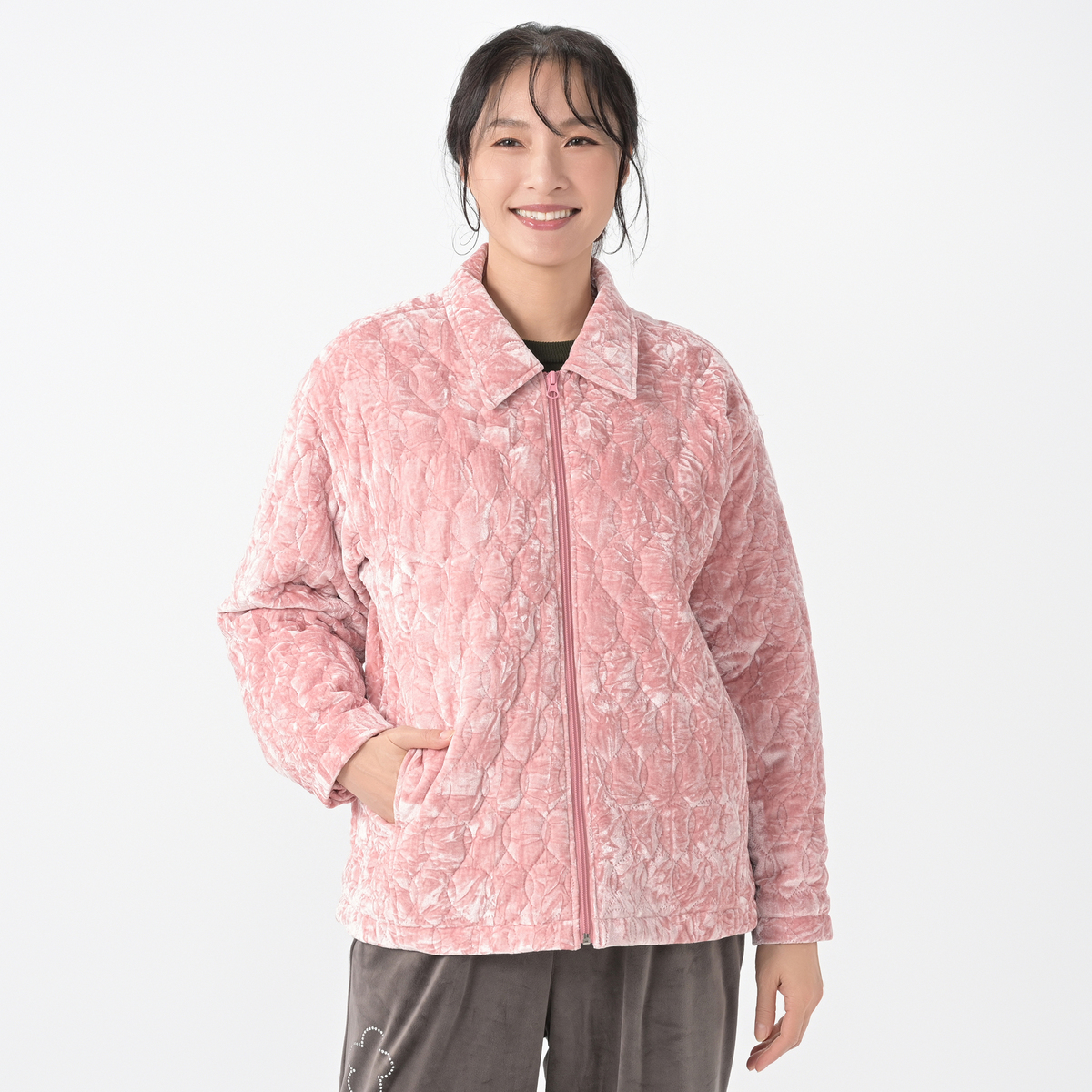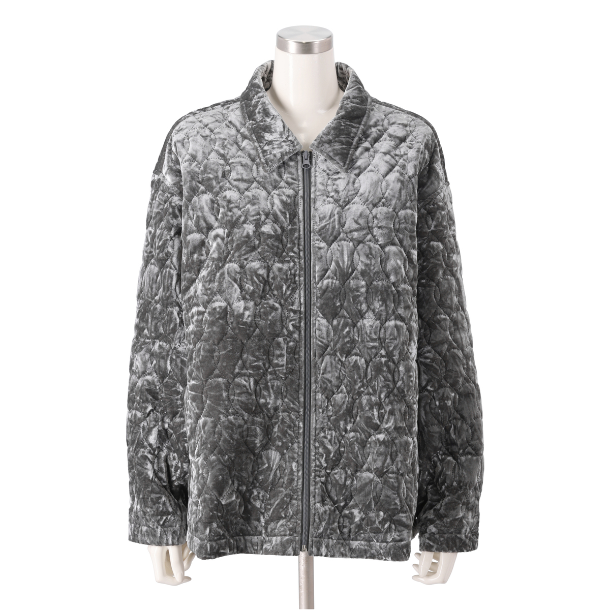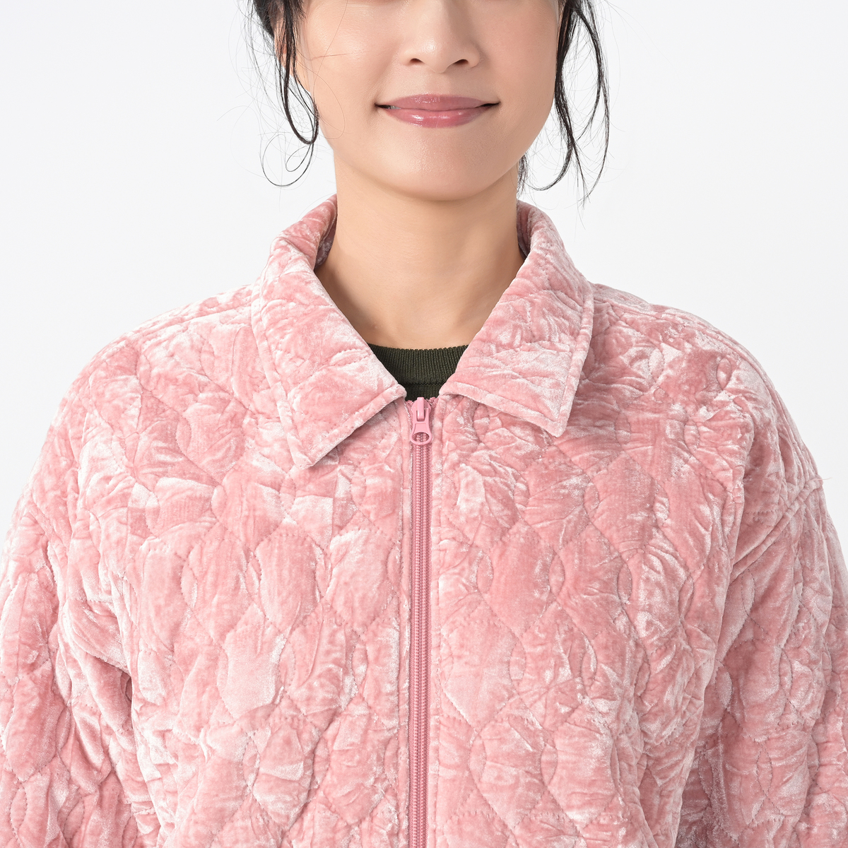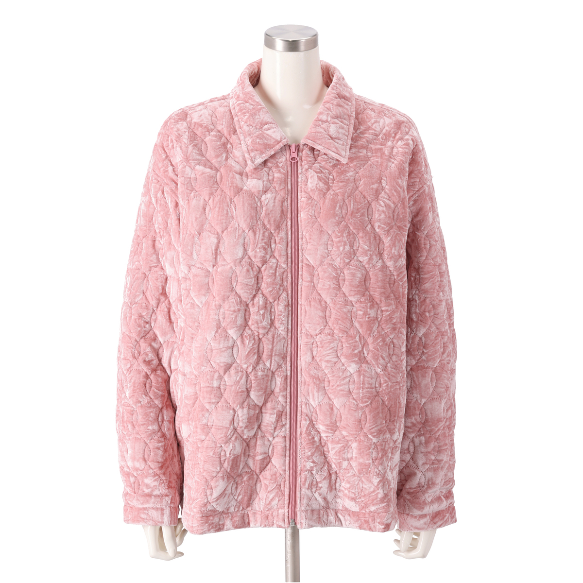 艶やかな光沢感のあるベロア素材をキルティング加工した中わたブルゾン。ジャケット感覚で着られて、着膨れ感も気になりにくいアイテム。合わせるアイテムや小物によって、カジュアルにもドレッシーにも着こなせます