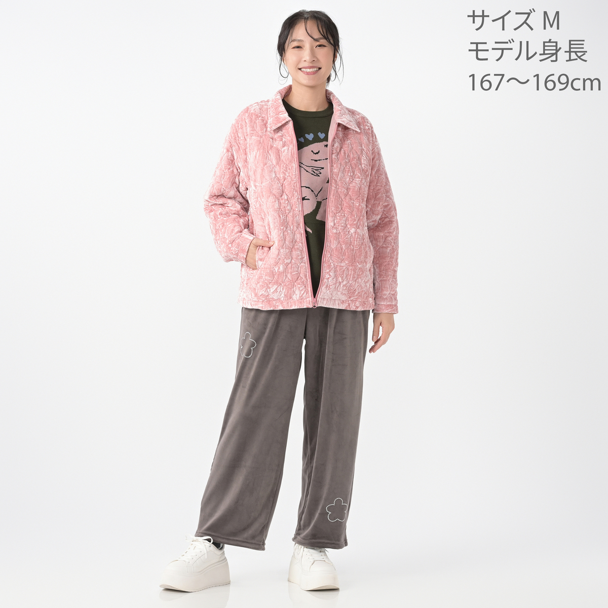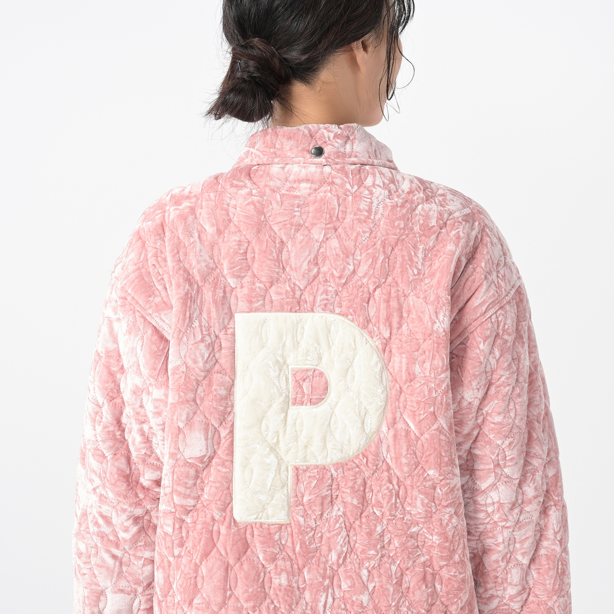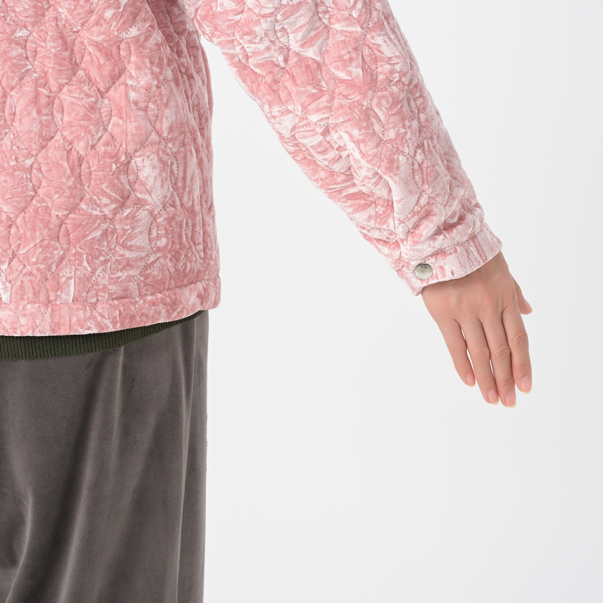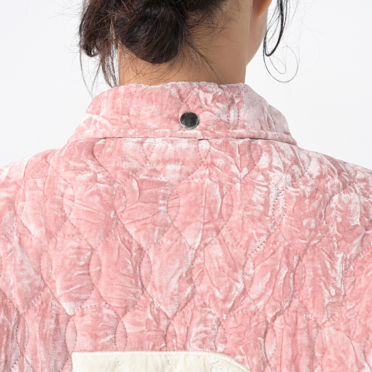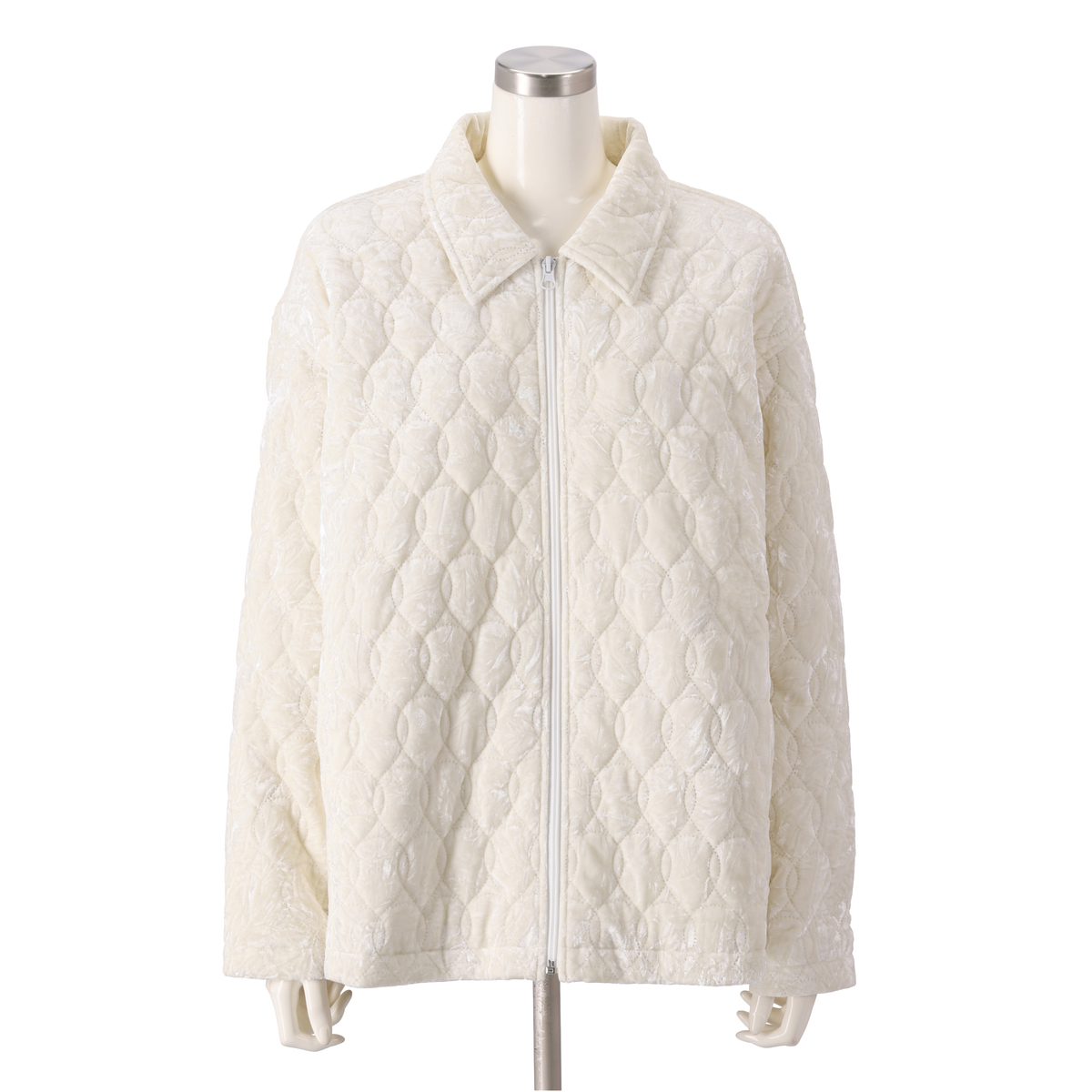 艶やかな光沢感のあるベロア素材をキルティング加工した中わたブルゾン。ジャケット感覚で着られて、着膨れ感も気になりにくいアイテム。合わせるアイテムや小物によって、カジュアルにもドレッシーにも着こなせます