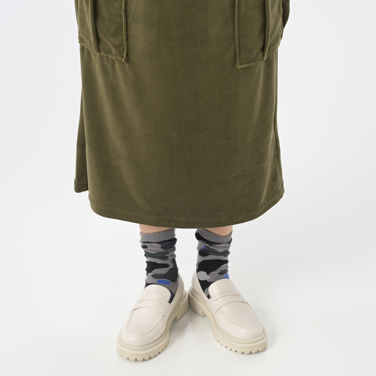 ベロア素材が好きで購入しましたがベロアのカーゴスカートといいボルドーのカラーといい池田先生のデザイナーとしてのセンスが最大限に発揮されていてとてもお気に入りです。 ベロア素材だとハイネックのチュニックとかストレートのパンツとか、カラーもブラック、ネイビー、ブラウンと定番カラーばかりなのにボルドーでカーゴスカートを観て即購入しました。 ベロアの素材の柔らかさで着心地が良く、着たまま寝てしまっても(お昼寝)シワになら無いうえに、寒い時は下にスパッツやカラータイツを履いても着太り感もなく客用しています。 ベロア素材の室内用ガウンなどベロアシリーズも作って下さい。勿論、池田先生と言えばデイジー柄、変わらず作り続けて下さい池田先生の作品とても楽しみにしています。
