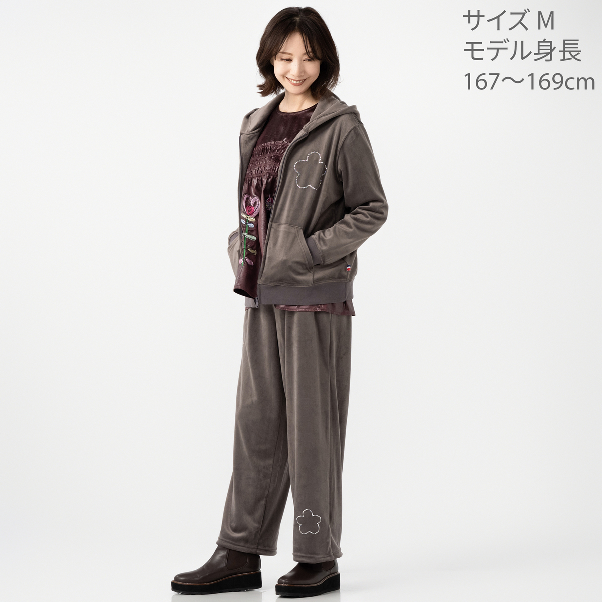 パーカーとセットアップで購入しました。びっくり価格お買い得すぎます。ルームウェアとして着るつもりですが、長距離フライトの機内着や滞在先での部屋着でも全然いけますね。裾にスピンドルがついているのも良いです。ストーンもキラキラしてて可愛い。
