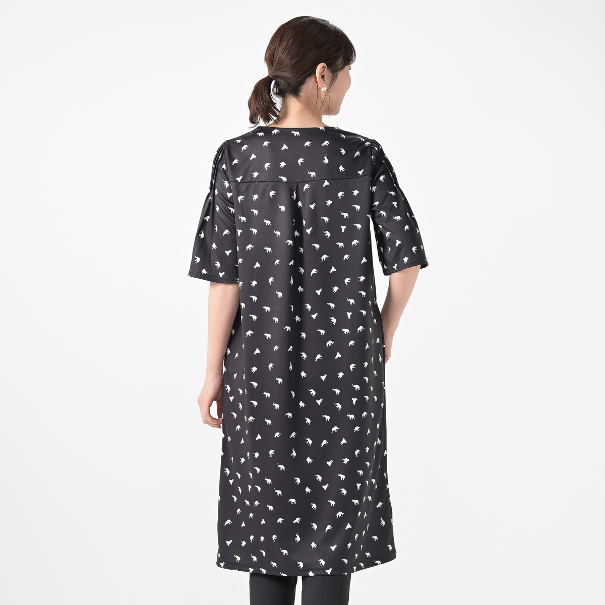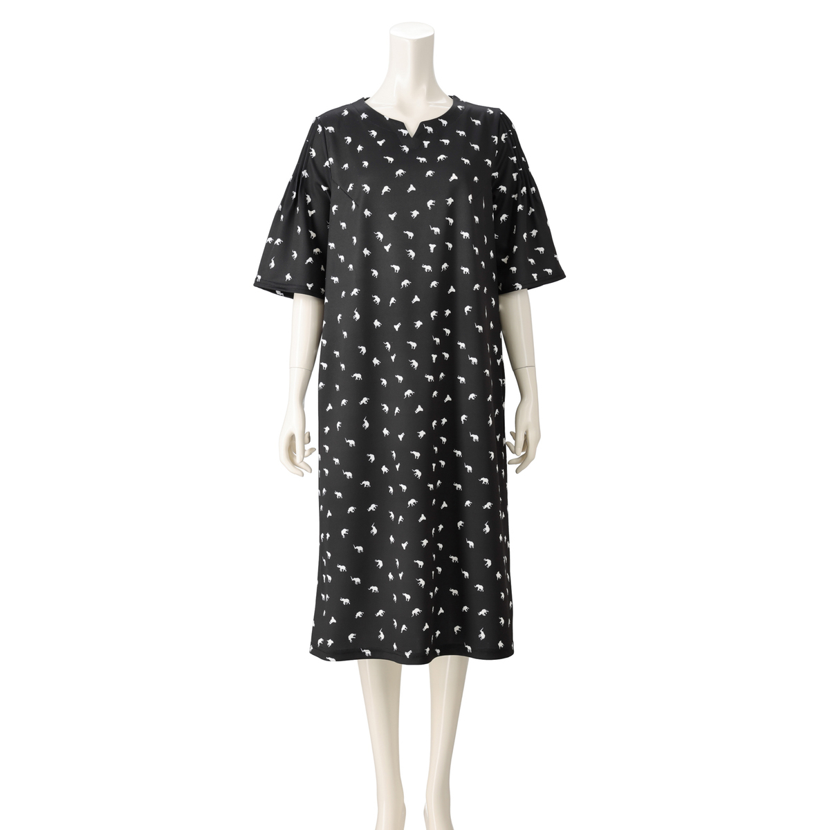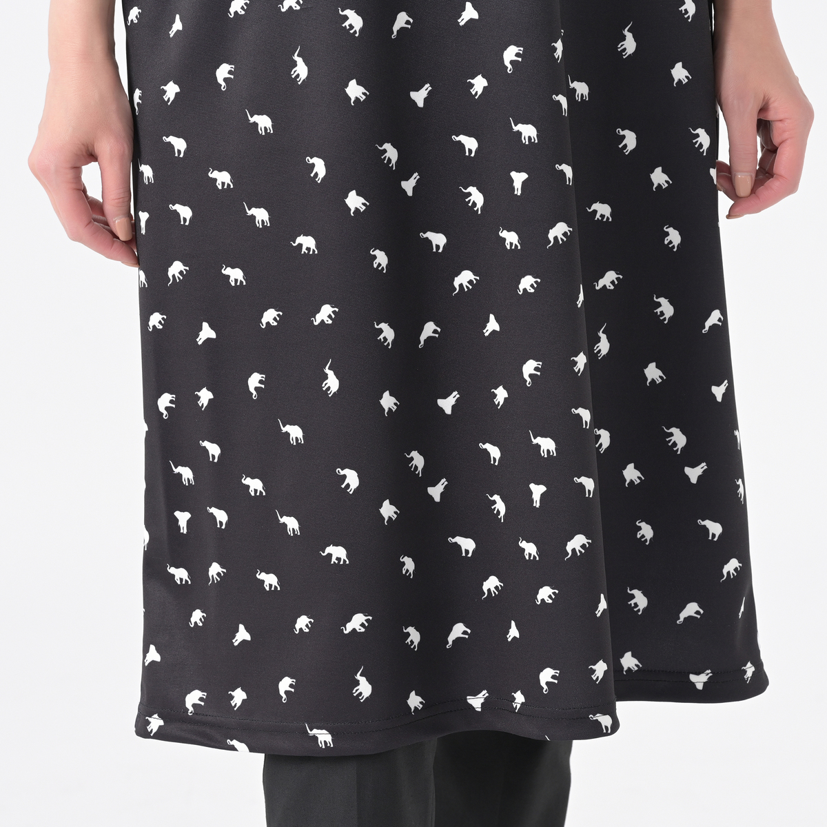 デザイナー吉田ヒロミさんこだわりの、ぞうさん柄プリントをあしらってデザイン。フレアースリーブワンピースをネット限定丈としてご用意しました