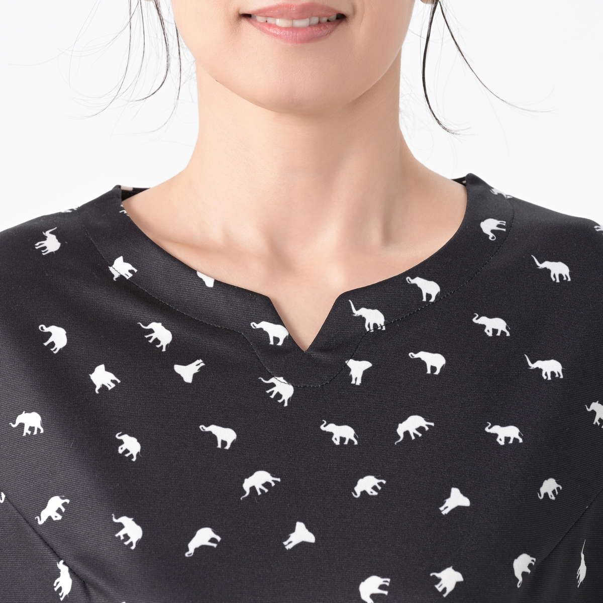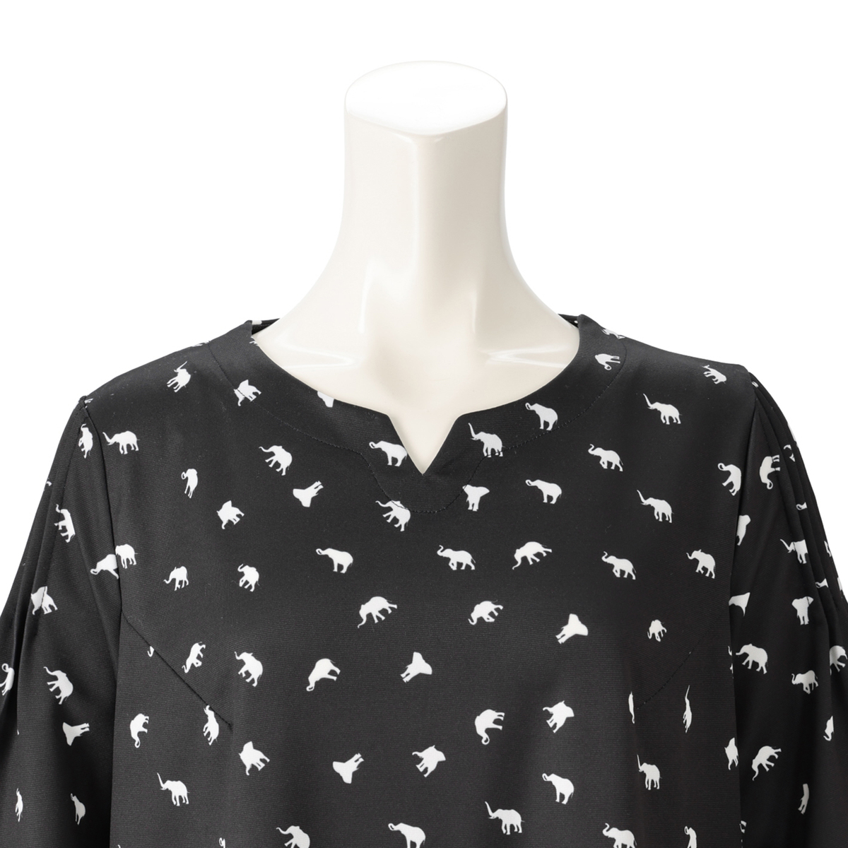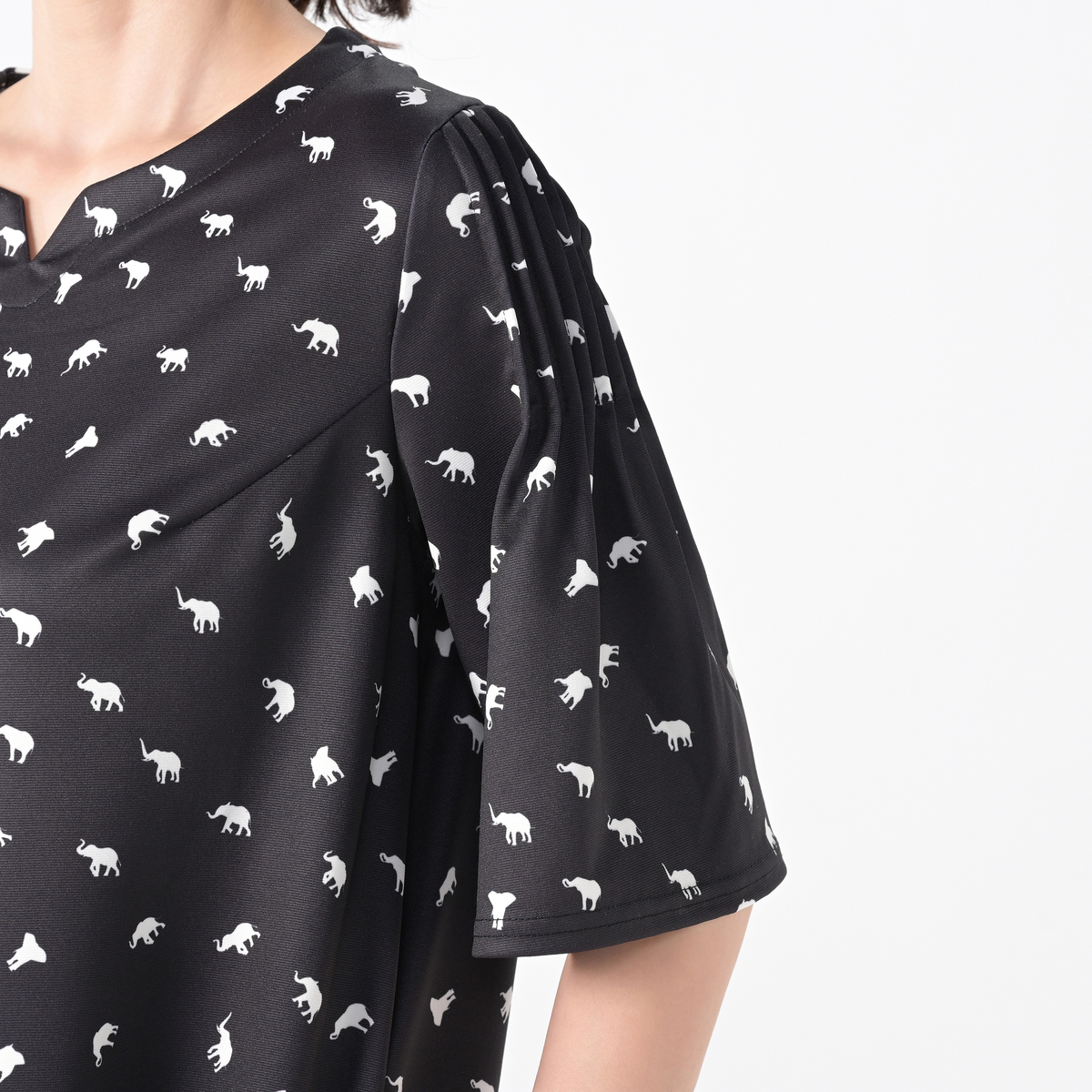 デザイナー吉田ヒロミさんこだわりの、ぞうさん柄プリントをあしらってデザイン。フレアースリーブワンピースをネット限定丈としてご用意しました