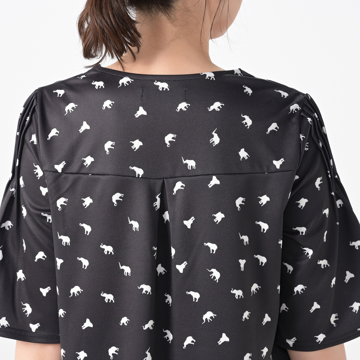 程よい張り感で身体のラインを拾いにくい素材が、シルエットをきれいに見せてくれます。袖山にピンタックを取り、袖口に向かって少し広がるデザインもポイントです