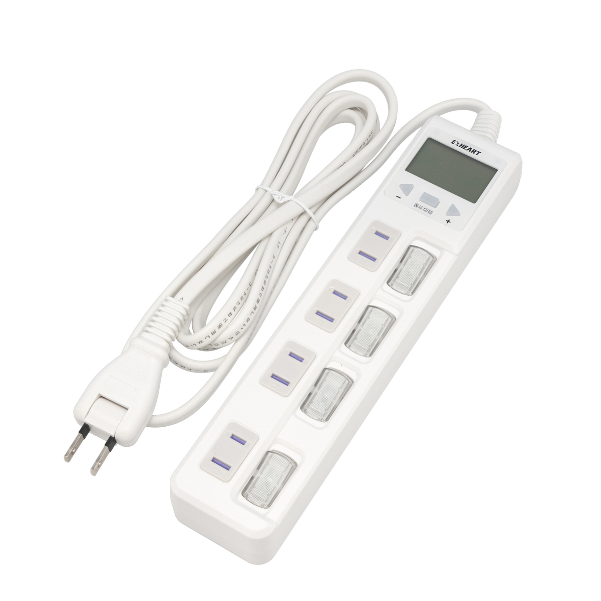 各口に個別のON/OFFスイッチ(LEDの点灯消灯)があり、口数は4カ所。180°動く可動式プラグの電源タップです。今使用している(4カ所合計)の消費電力を表示し(W)、4カ所合計の累計使用時間を表示してリセットするまで累計(h)。さらに、4カ所合計の累計消費電力を表示してリセットするまで累計(Wh)し、4カ所合計の累計電気代金を表示してリセットするまで累計(円)します