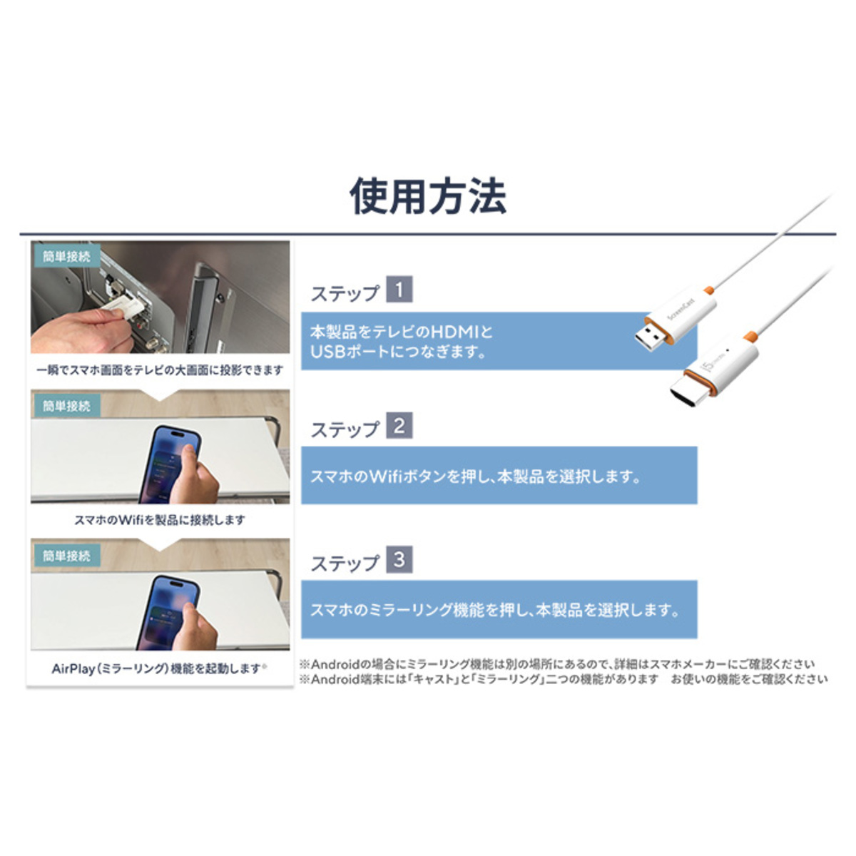 スマホ、タブレット、ノートPCの画面を無線LANでHDMIディスプレーにミラーリングできる、ドングルレシーバー*。本機をHDMIディスプレイ(テレビ)と別売りのUSB充電器に接続し、手元のスマホを操作するだけで、テレビへYouTubeなどスマホの画面を投影、ミラーリングすることができます