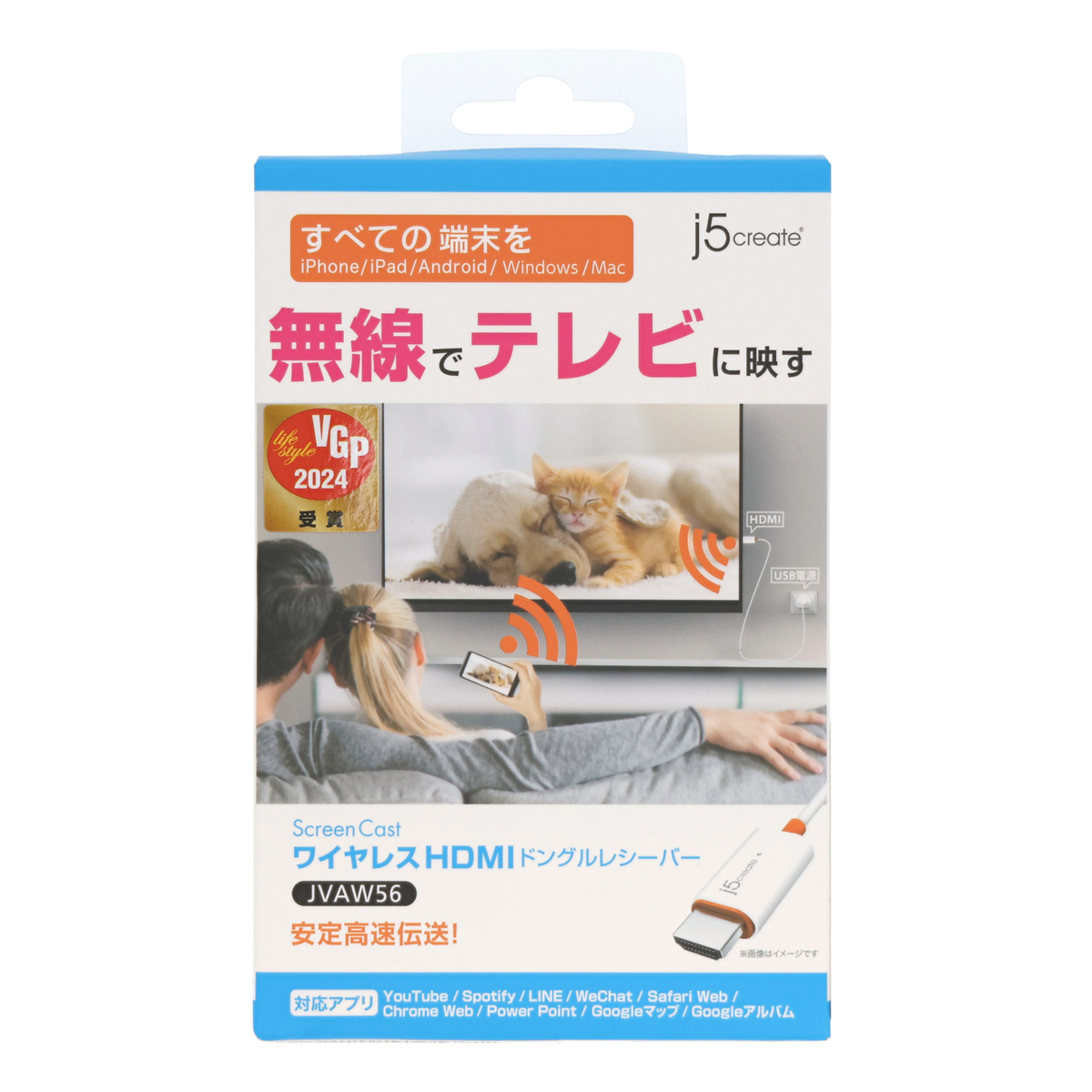 [商品内容] ・JVAW56本体 ・延長ケーブル ・クイックインストールガイド ※USBーACアダプターは付属しません [サイズ] 幅5.7×高さ2.4×奥行1.05cm ケーブル:60cm [重量] 約31.5g [仕様] インターフェース:HDMI(オス)×1 USBTypeーA for 5v/1A(オス)×1 解像度:1920×1080/1280×720 WiーFi:IEEE802.11ac(2.4G+5G) 対応環境:Windows10/8.1 Android4.0以降 macOS10.15以降 ios10.0以降 [使用方法] <ディスプレイに接続> ・まず本機をHDMIディスプレイ(テレビ)と別売のUSB充電器と接続してください ・ディスプレイに初期画面が表示されます。 ※端末種類によって使います ・初期設定とは、端末を使って本機をルーター回線にアクセスすることで、端末と本機が同じネット回線で簡単に投影する事ができます ・もちろん初期設定をしなくても、直接ペアリング投影する事が出来ます 詳細は次の様になります。 <Android端末の接続方法はこちら> ・端末のWi-Fiをonにして、端末の「設定」でMiracast投影機能を起動して、本機のSSIDを選択して投影開始します ・それから端末をルーター回線かキャリア回線に接続すればネットコンテンツをご利用できます ・もし端末がMiracast機能がなければ、初期設定を進めてから同じルーター回線に接続してキャスト機能を起動してください <iOS/iPad/macOS端末の接続方法はこちら> ・端末のWi-Fiで本機のSSID&PWに接続して、キャスト/AirPlayを起動して、本機のSSIDを選択し投影開始します ・それから端末をキャリア回線に接続すればネットコンテンツをご利用できます ・もしキャリア回線の使用料を節約してルーター回線を使いたい場合には、初期設定をしてから同じルーター回線に接続してキャストを起動してください <WindowsノートPCの接続方法はこちら> ・パソコンのWi-Fiをonにして、Windows+Pを押してから下の「ワイヤレスディスプレイに接続する」をクリックして、本機のSSIDを選択して投影開始します ・それからパソコンをルーター回線か有線LANに接続すればネットコンテンツを利用出来ます ■取り扱い説明を充分にご確認の上、ご使用下さい 【台湾製】 [注意事項] ※著作権保護によりテレビ出力できないコンテンツがあります(有料動画サービスや有料アプリの多くはテレビ出力が制限されています) ※非対応アプリ Netflix/Hulu/Amazonプライムビデオ ※HDCP保護されたコンテンツはミラーリング非対応ですのでご注意下さい。Android端末のChromecastに対応していますが、ChromebookのChromecastに対応しません ※USB充電器は付属していません