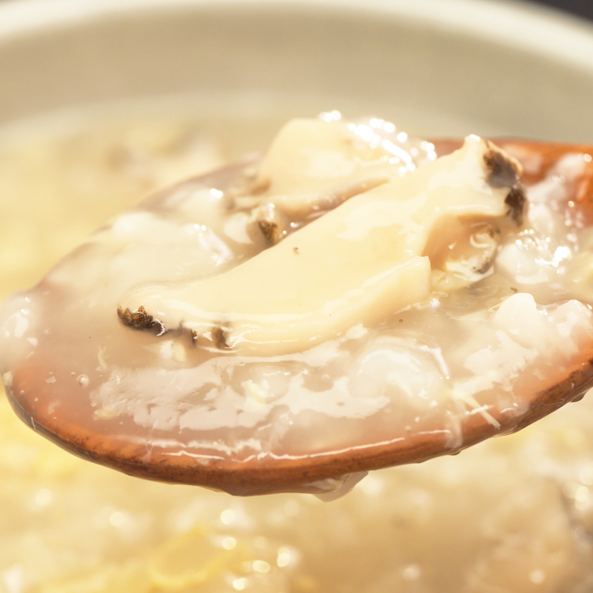 歯ごたえのあるあわびが入ったあわび粥。国産コシヒカリ100%使用。あわびエキス入りのオイスターソースの旨みで、コク深い上品な味付けにしました