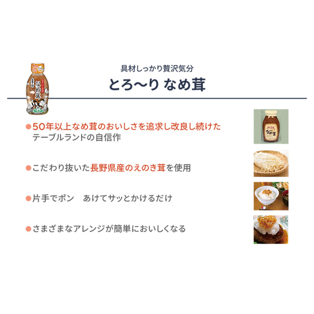 長野県産のえのき茸を使用した"とろ〜りなめ茸"がセットに。スプーンなどを使わずに、片手で中身が簡単に取り出せる、便利なボトル入りのなめ茸です