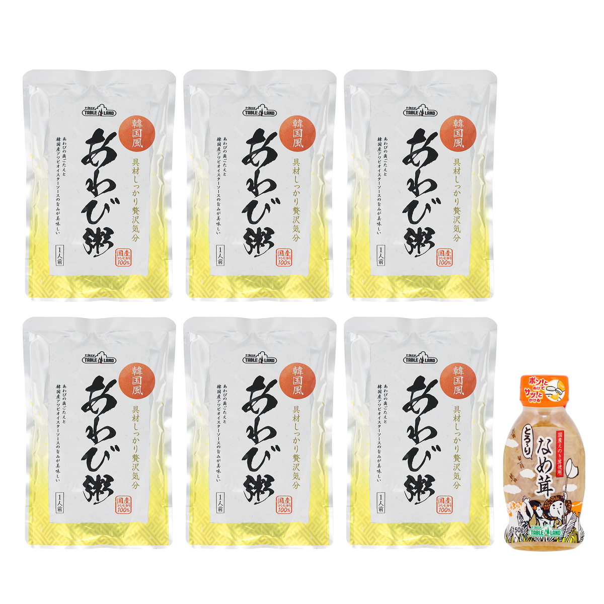 [アレルギー物質特定原材料8品目] 卵、小麦、乳、えび [セット内容] ・材しっかり贅沢気分 あわび粥250g×6 ・とろ〜りなめ茸150g [保存方法] <具材しっかり贅沢気分あわび粥> 開封前:直射日光を避け、常温で保存してください 開封後:お早めにお召し上がりください <ボトル入りなめ茸> 開封前:開封前は直射日光を避け、常温で保存してください 開封後:開封後要冷蔵(10℃以下) 開封後は必ず冷蔵庫に保存し、早めにお召し上がりください [お召し上がり方] お湯で温める場合:袋の封を切らずに、そのまま沸とうしたお湯の中に入れ、約5分間加熱し、器にあけてからお召し上がりください 電子レンジの場合:必ず袋から出し、深めの器にあけ、ラップをかけて500Wなら約2分30秒間、600Wなら約2分間加熱し、軽くかき混ぜてからお召し上がり下さい ※機種により加熱時間が異なる場合がありますので加減してください ・お好みでごま油を少々かけていただくと、コク深い味わいになります [注意事項] <あわび粥> ※加熱直後は熱いのでお気をつけください ※開封時に切り口で手を切らないようにご注意ください <とろ〜りなめ茸> ※開封時に中身がこぼれることがありますので、ご注意ください ※中身上部の色が濃くなることがございますが、品質には問題ありません [原料原産地] あわび粥:精白米(国産) なめ茸:えのきたけ(国産) [加工地] 日本 [原材料] 具材しっかり贅沢気分あわび粥:精白米(国産)、あわび、鶏卵、オイスターソース(あわびエキス入り)(えび・小麦・あわび・大豆を含む)、砂糖、食塩、チキンエキス、しょうゆ(小麦・大豆を含む)、酵母エキス、昆布エキスパウダー/増粘剤(加工でん粉、キサンタンガム)、調味料(アミノ酸等)、乳化剤、酸味料、カラメル色素 ボトル入りなめ茸:えのきたけ(国産)、糖類(砂糖、水あめ)、しょうゆ(小麦・大豆を含む)、食塩、昆布エキス、かつお節エキス、チキンブイヨン調味料(乳成分を含む)、酵母エキス、寒天/増粘多糖類、酸化防止剤(ビタミンC)、クエン酸