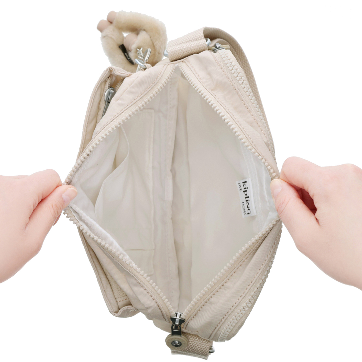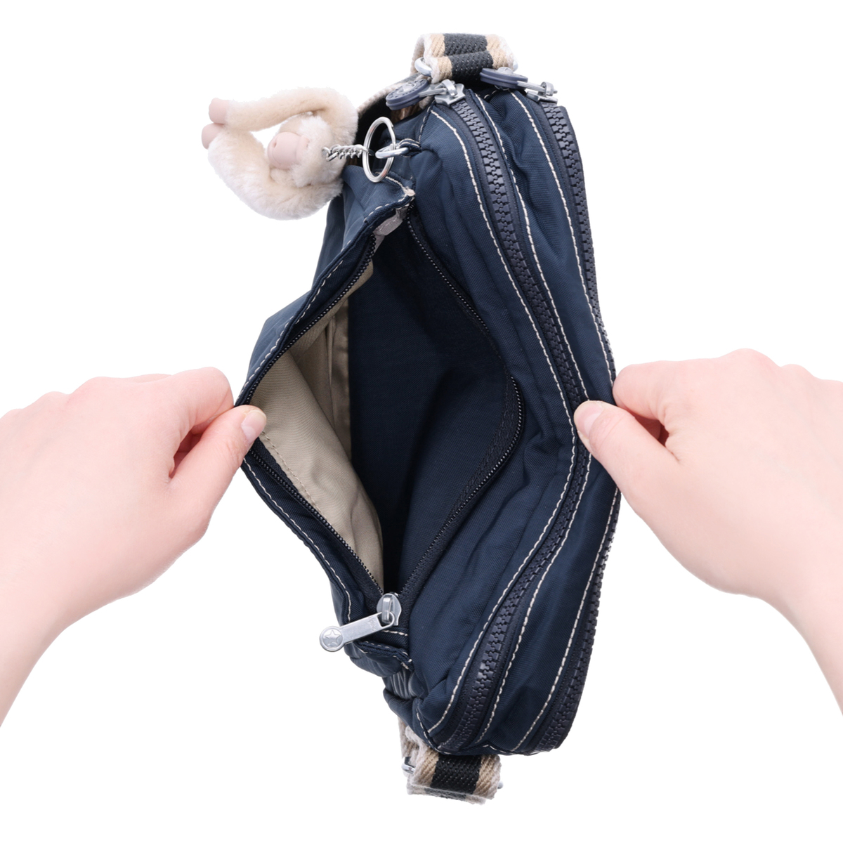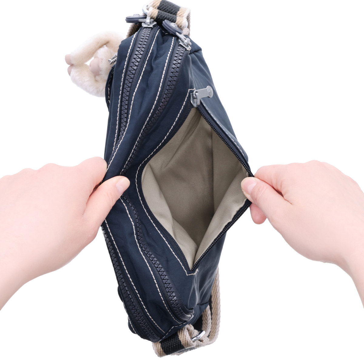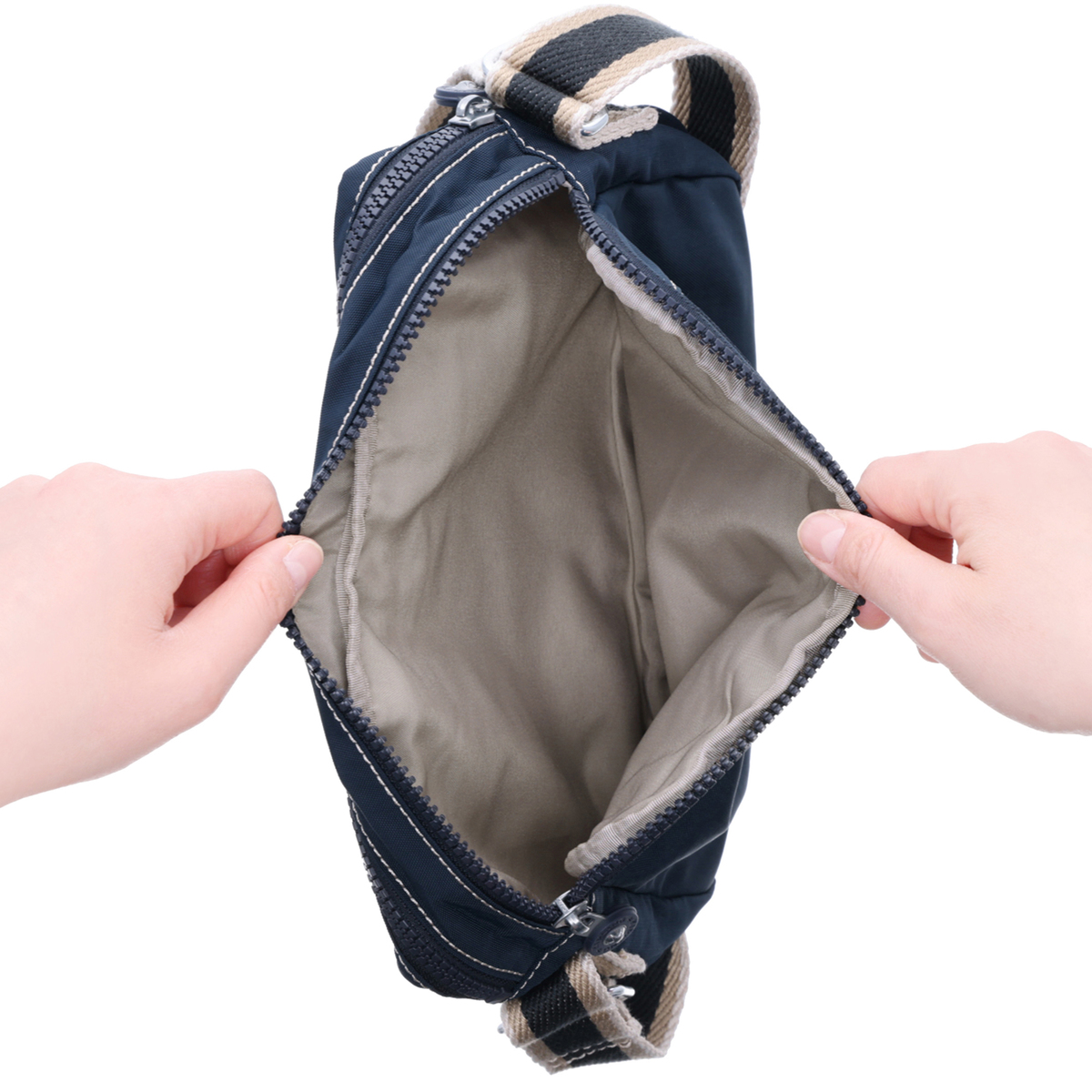 背面側にもフラットなファスナーポケットが付き、荷物の整理がしやすく。ショルダーベルトは無段階調整が可能。ワンショルダーバッグとして、また斜め掛けもできます