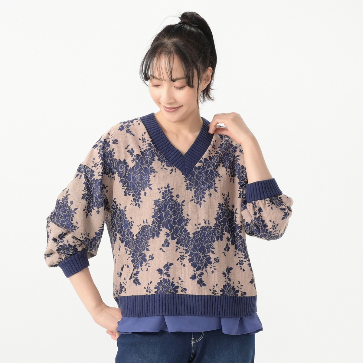 ラッセルレースをふんだんに使用したブラウスです。花柄のレースは生地部分と透ける部分が絶妙に配置され、エレガントさとモード感を両立しました