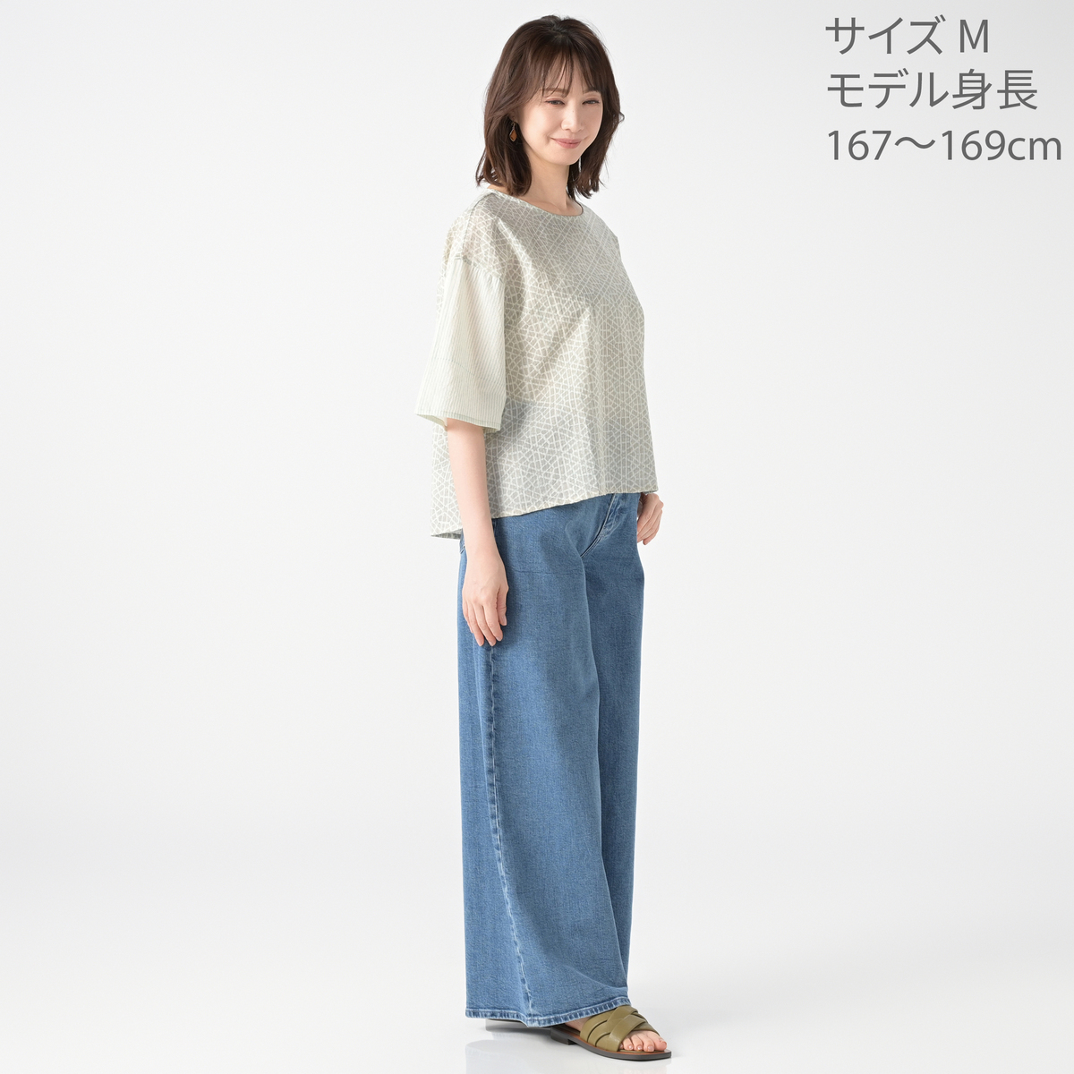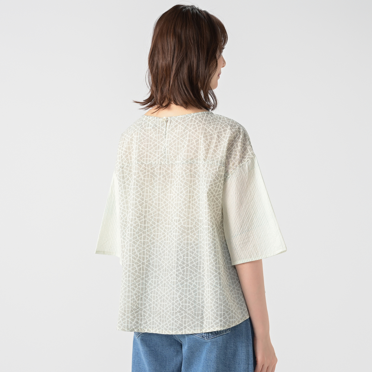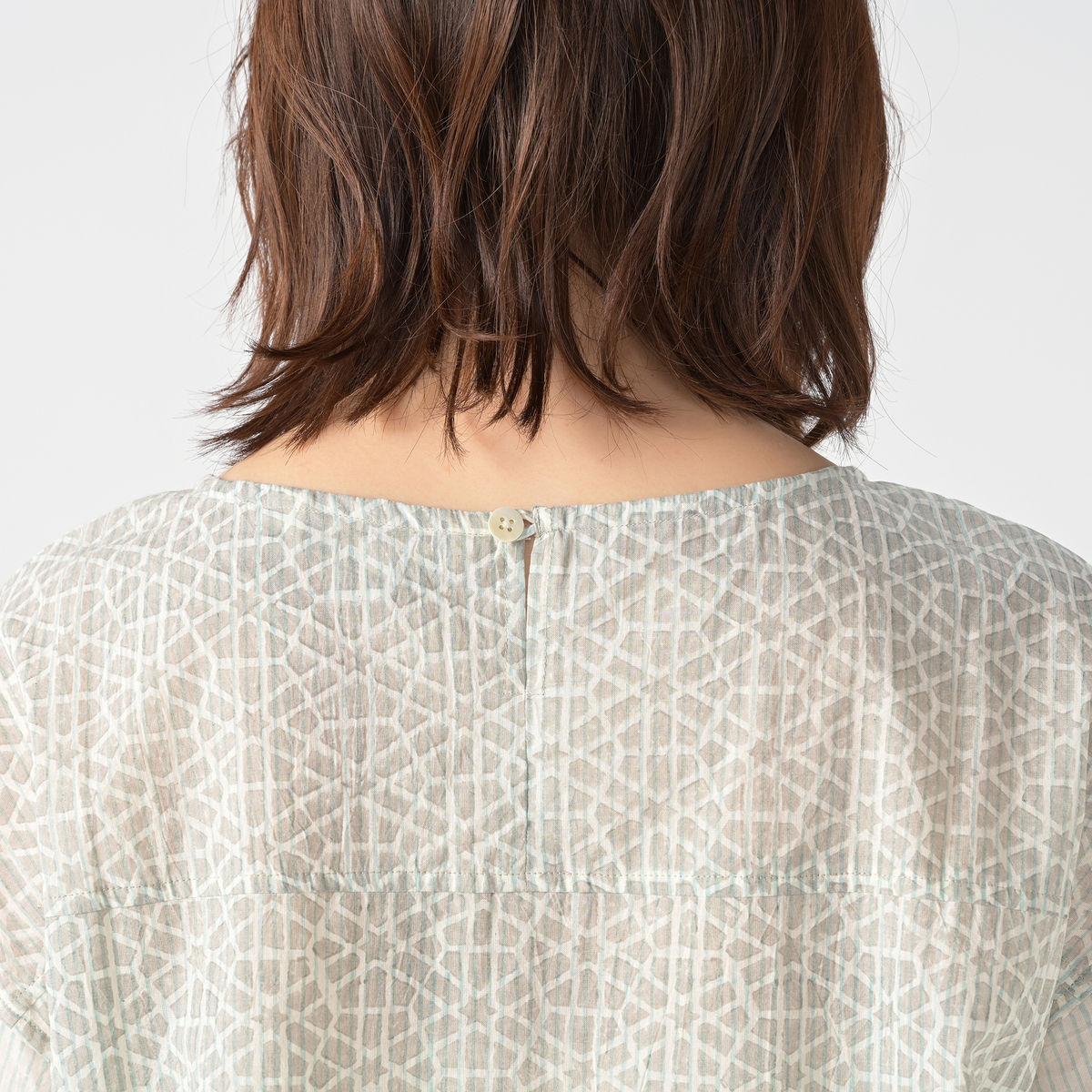 裾と袖口にフレア感を出したゆったり軽やかなシルエットで、前後差のある丈感が気になるヒップをカバー。背中のココナッツボタンがさりげないアクセントになっています