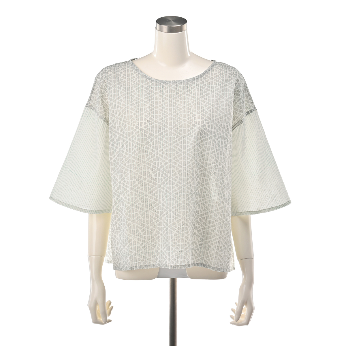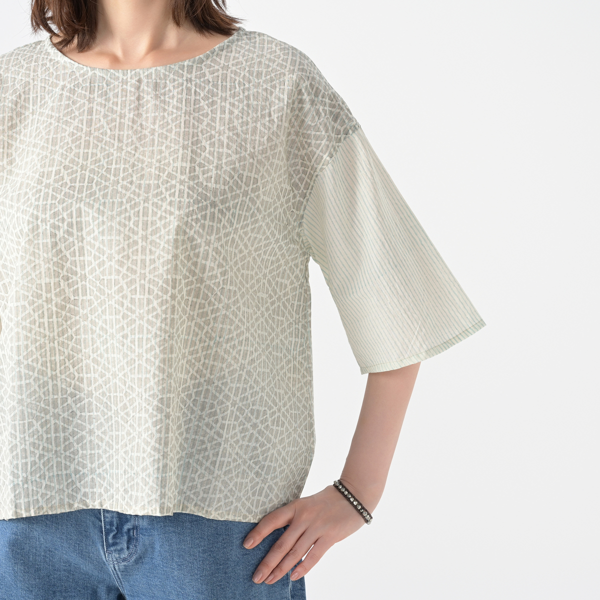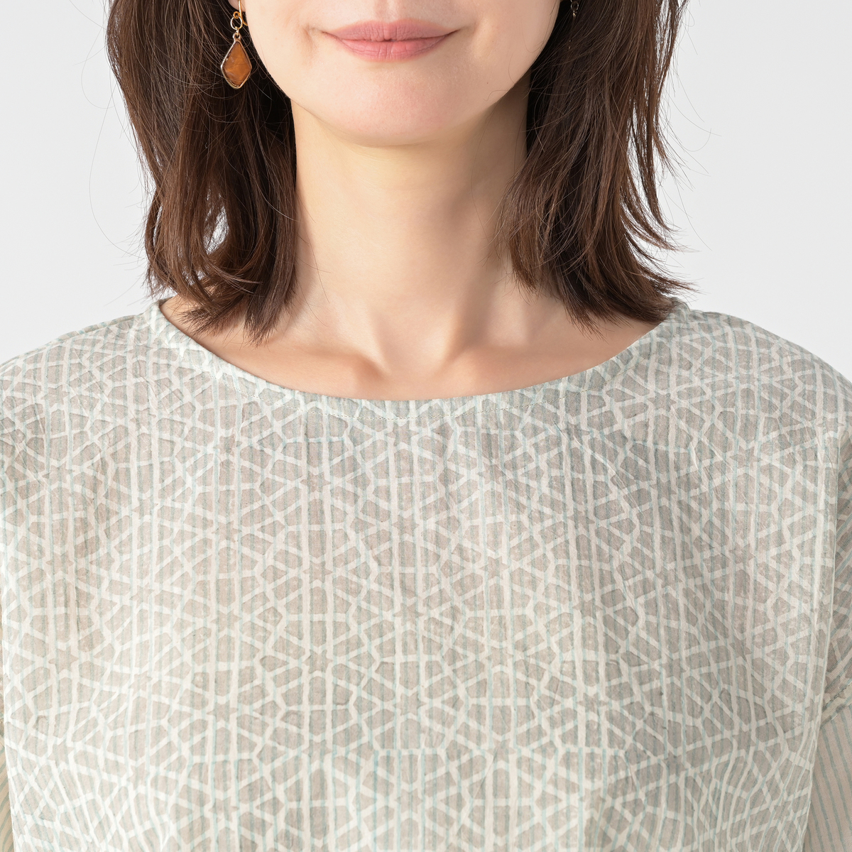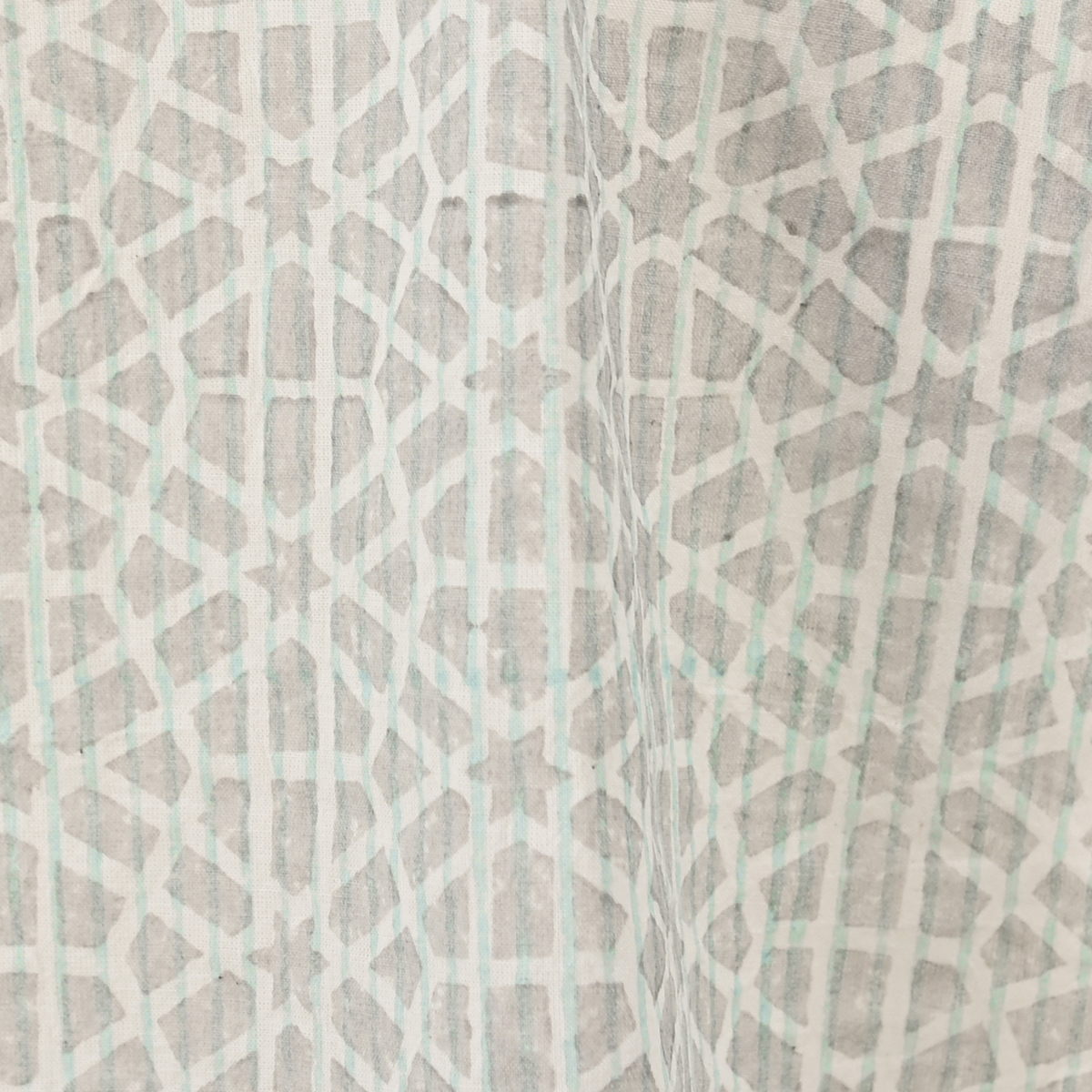 手彫りの木版で丁寧に模様をブロックプリント。透け感のある薄手のコットン混生地で、ストライプを単体で使ったり、六角形と放射線を組み合わせた模様を重ねることで、美しいパターンを描きます