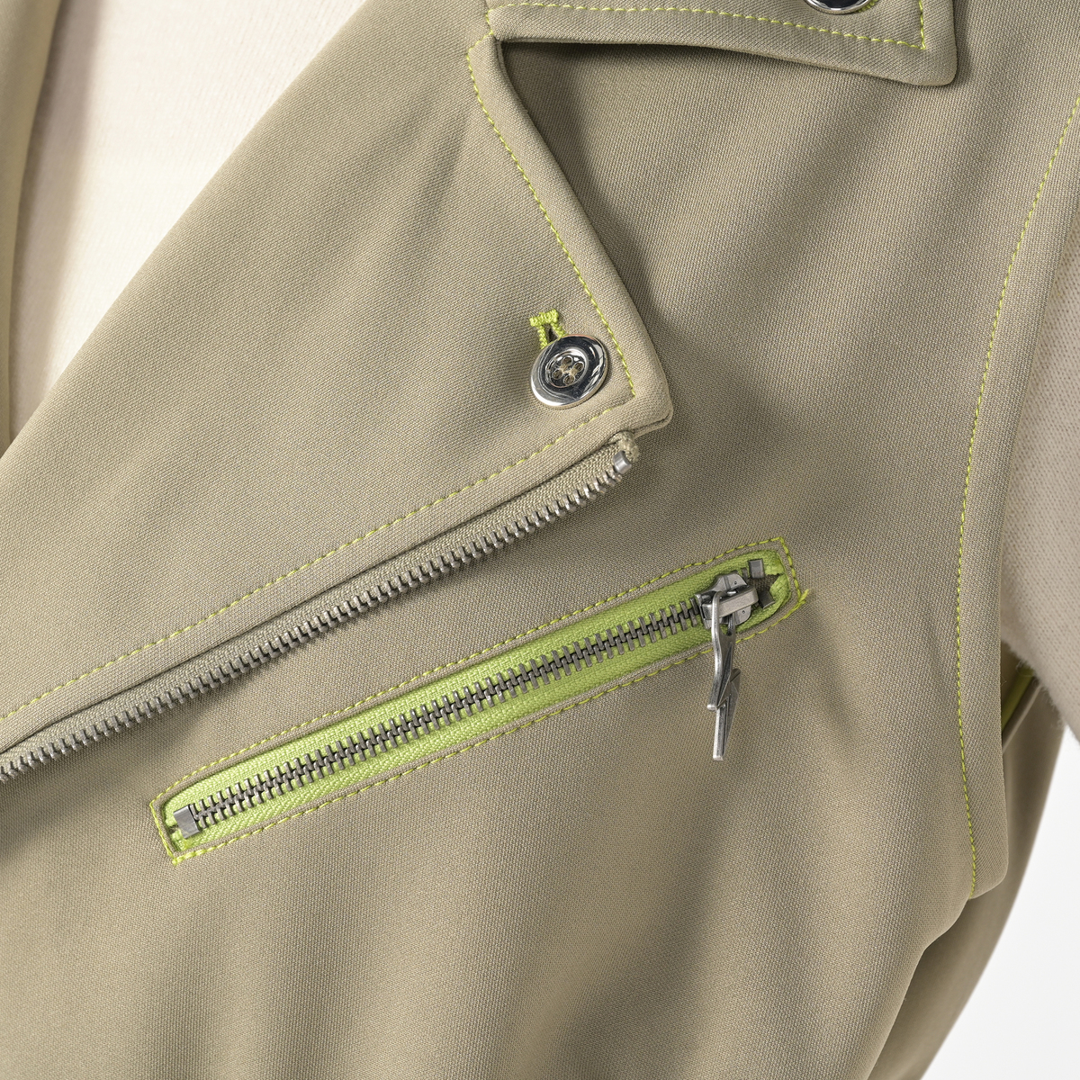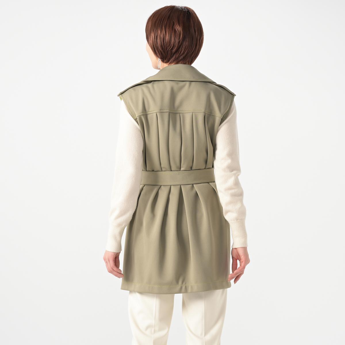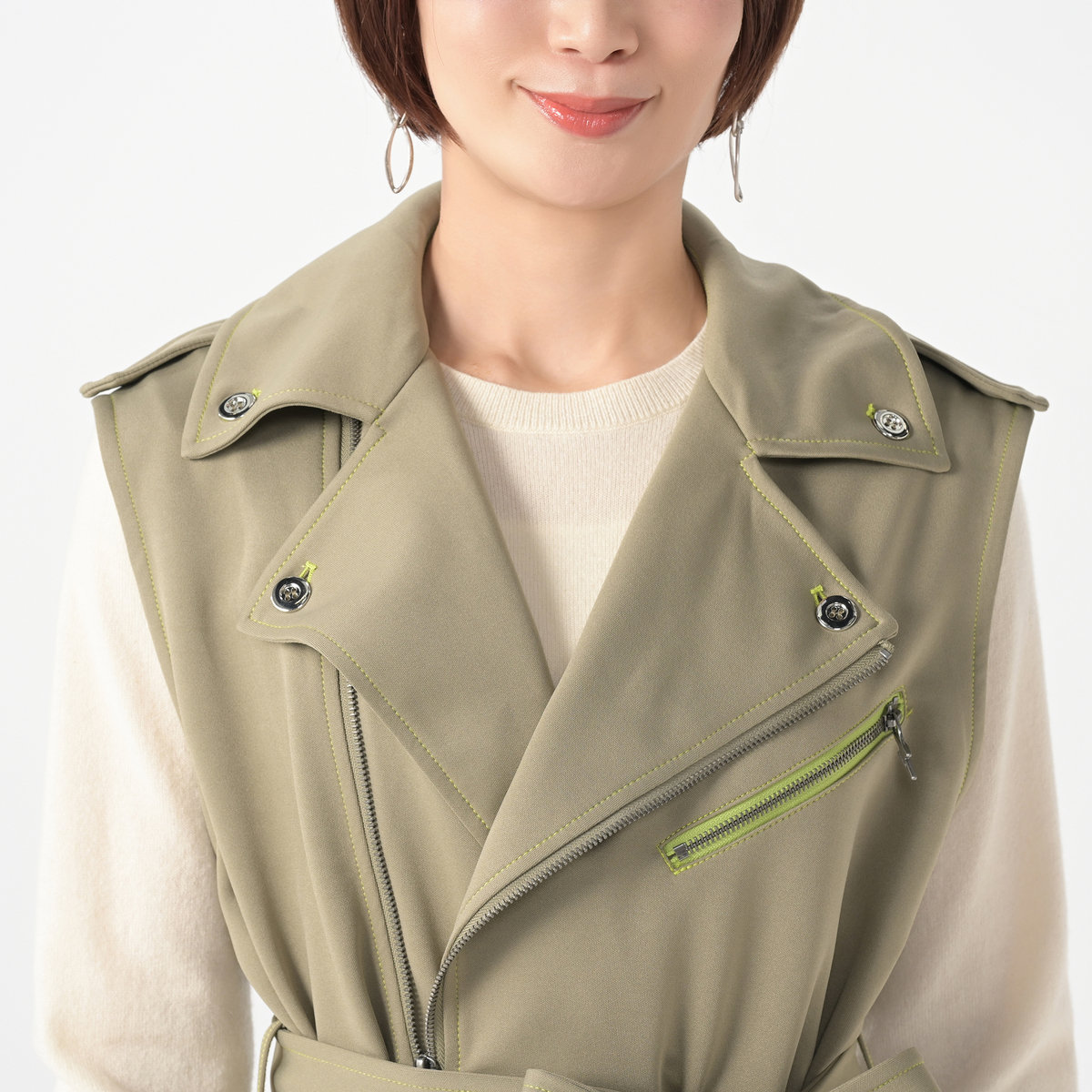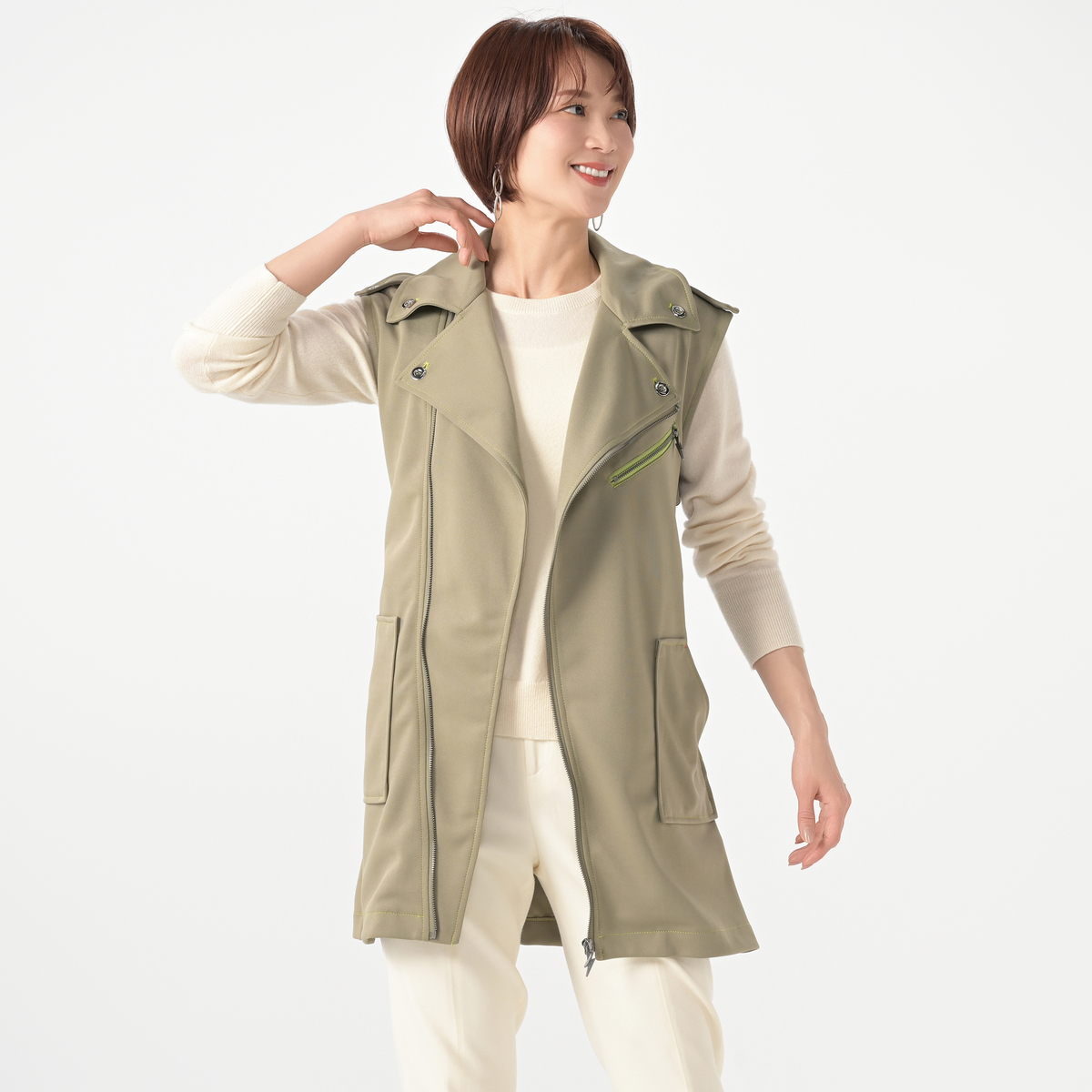 ライダースジャケットからインスパイアされたロングジレ。ファスナーアクセントや肩章、スタッズ風ボタンなど、ライダースジャケットに良く使われているデザインを取り入れています