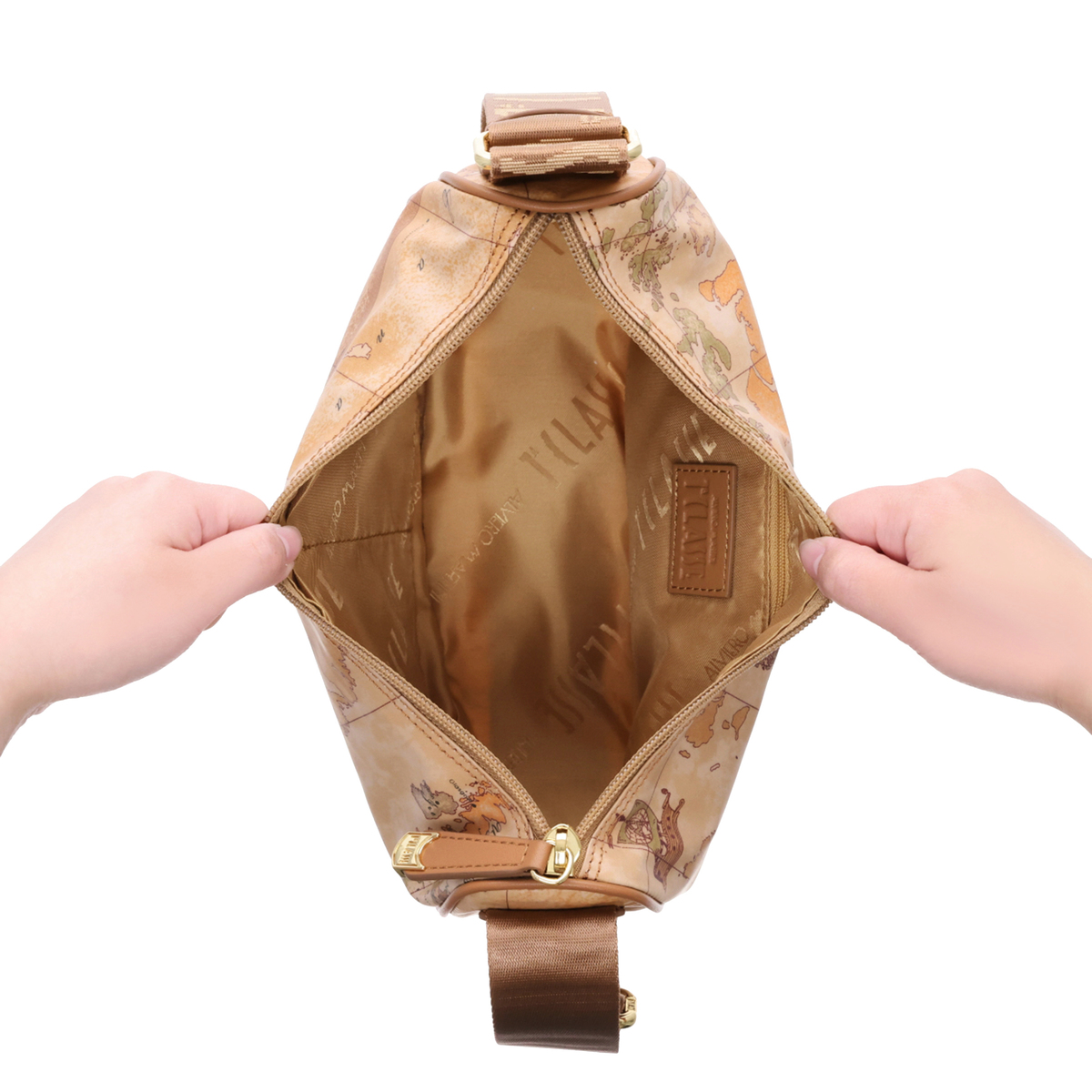 セピア調の地図柄がブランドの特徴で、作品の全てが手作業によって作られていることから同じ柄は二つと存在しません。ご紹介するのは、プリマクラッセの代名詞である地図柄プリントのショルダーバッグです