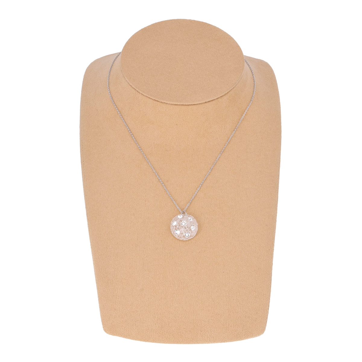 細やかな泡をまとったような、照りのある輝きが美しいペンダント。クリスタルガラスが光を受けて美しく反射し、胸元に上品な存在感を添えます