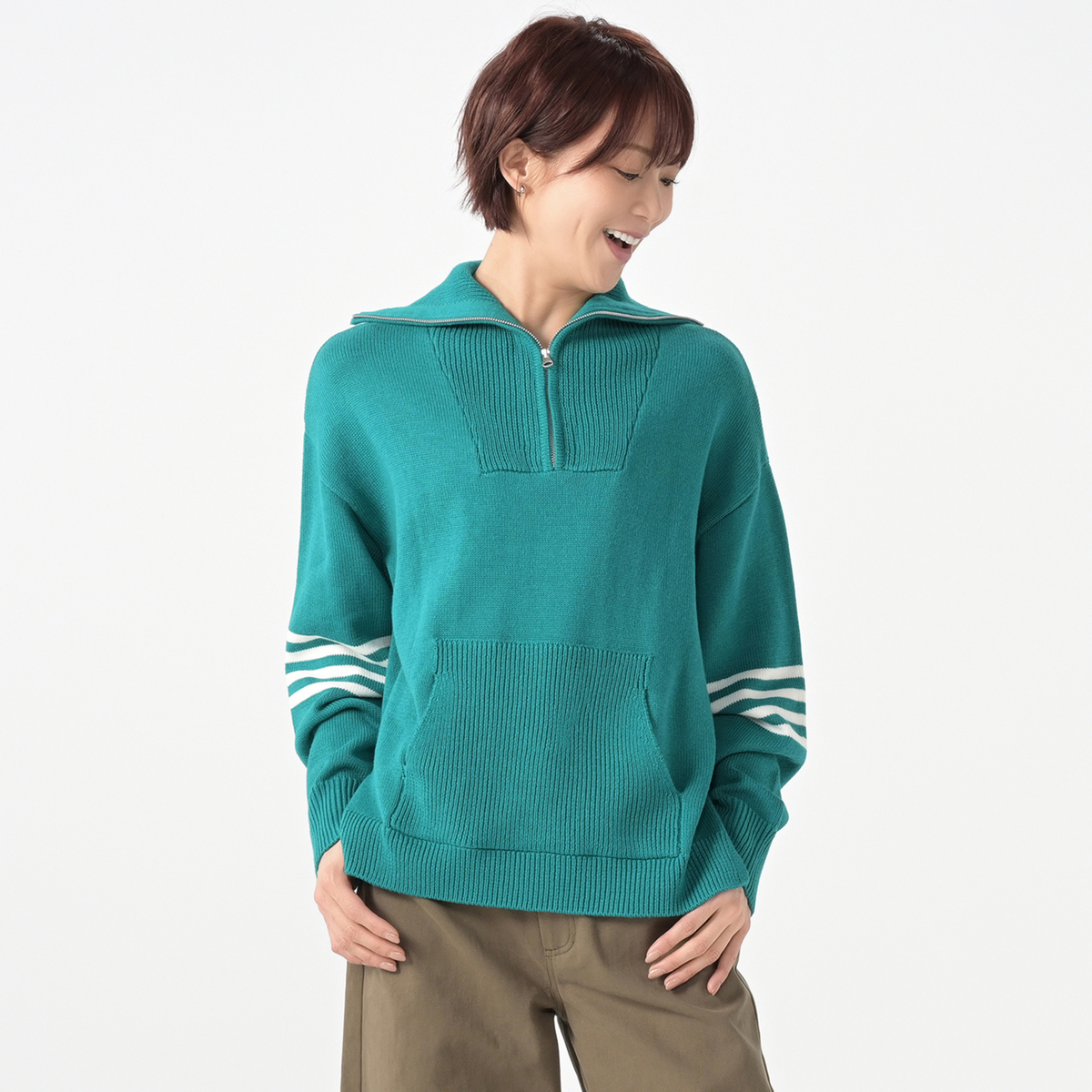コットンアクリルの糸で編み上げたハーフジップニットプルオーバー。袖に入れた4本のボーダーがポイントです