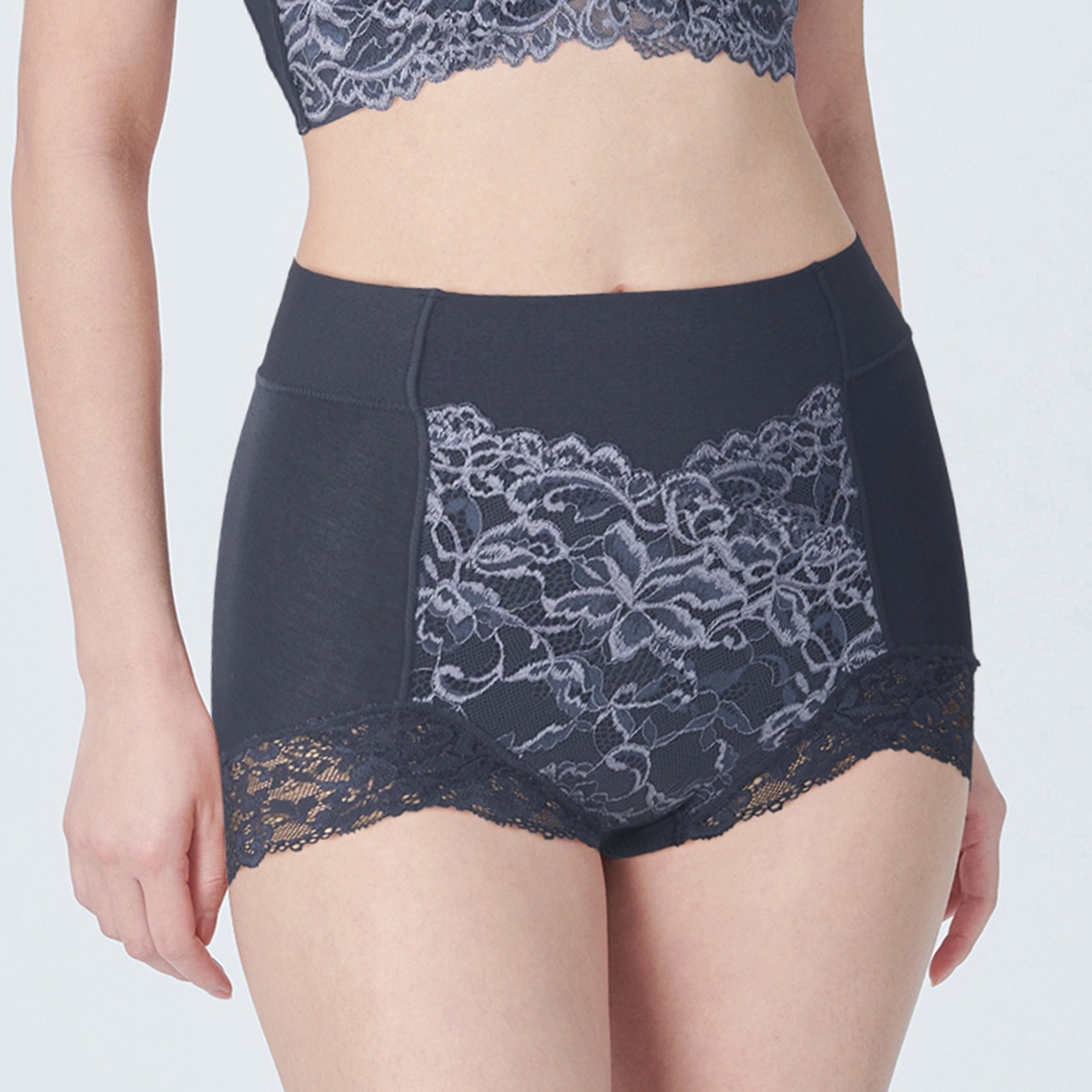 フロントはレースと身生地の間にパワーネットを内蔵した三重構造でお腹をシェイプ。内蔵パワーネットは、ウエスト上辺とそけい部を外して締め付け感を軽減。下辺は縫い付けずフリーな穿き心地で、肌側はナイロン綿ベア天竺素材で優しい肌触りです